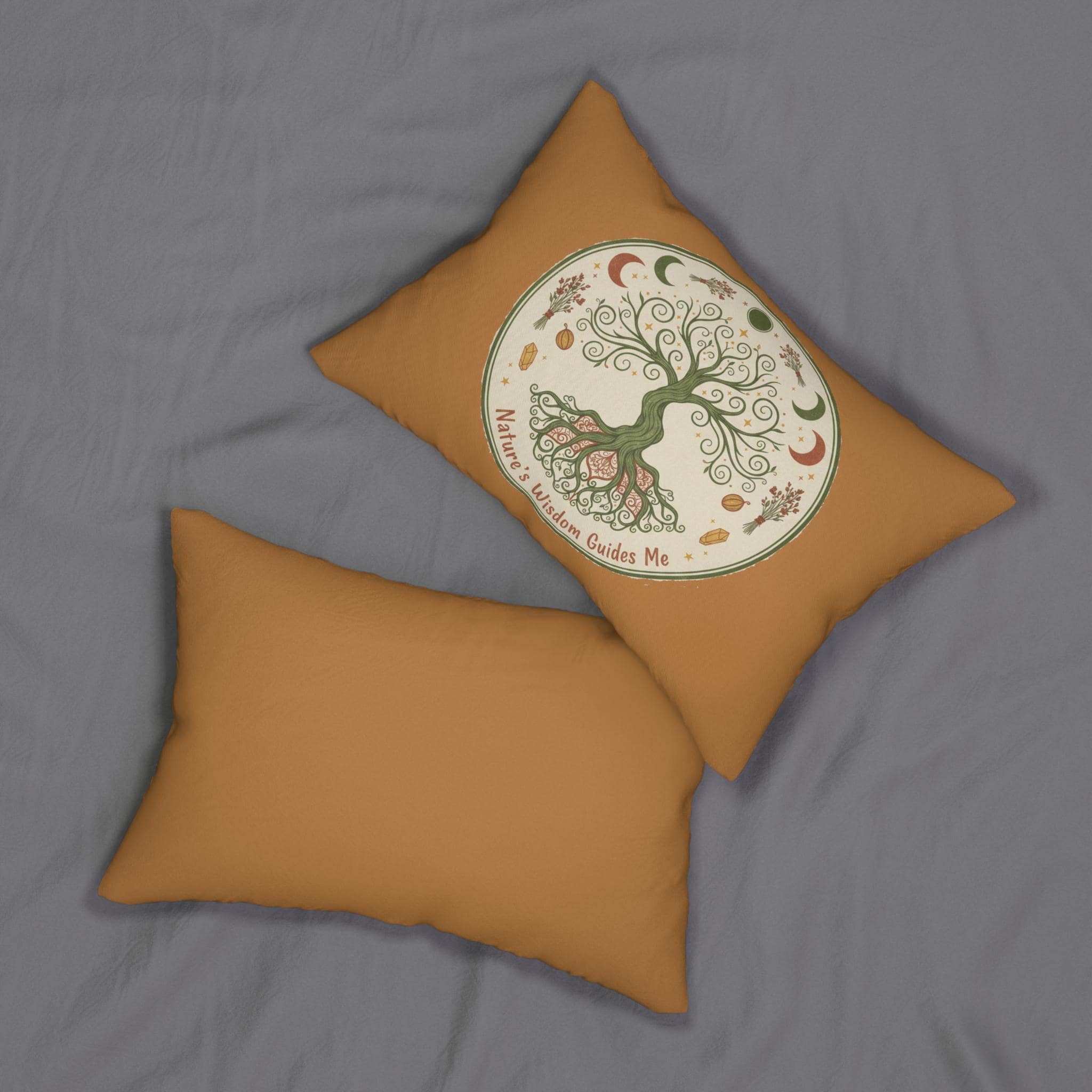 Sink into quiet, grounding energy. This lumbar pillow carries a hand-drawn tree of life motif with moon phases, roots, and tiny floral accents — all framed by an earthy rust background. It feels like a small altar for your sofa or bed: soft to lean against, visually calming, and made to withstand everyday use. The double-sided print keeps the design vivid while the removable recycled-poly insert keeps the shape resilient. Place it where you read, meditate, or slow down; it settles the room and invites a breath.