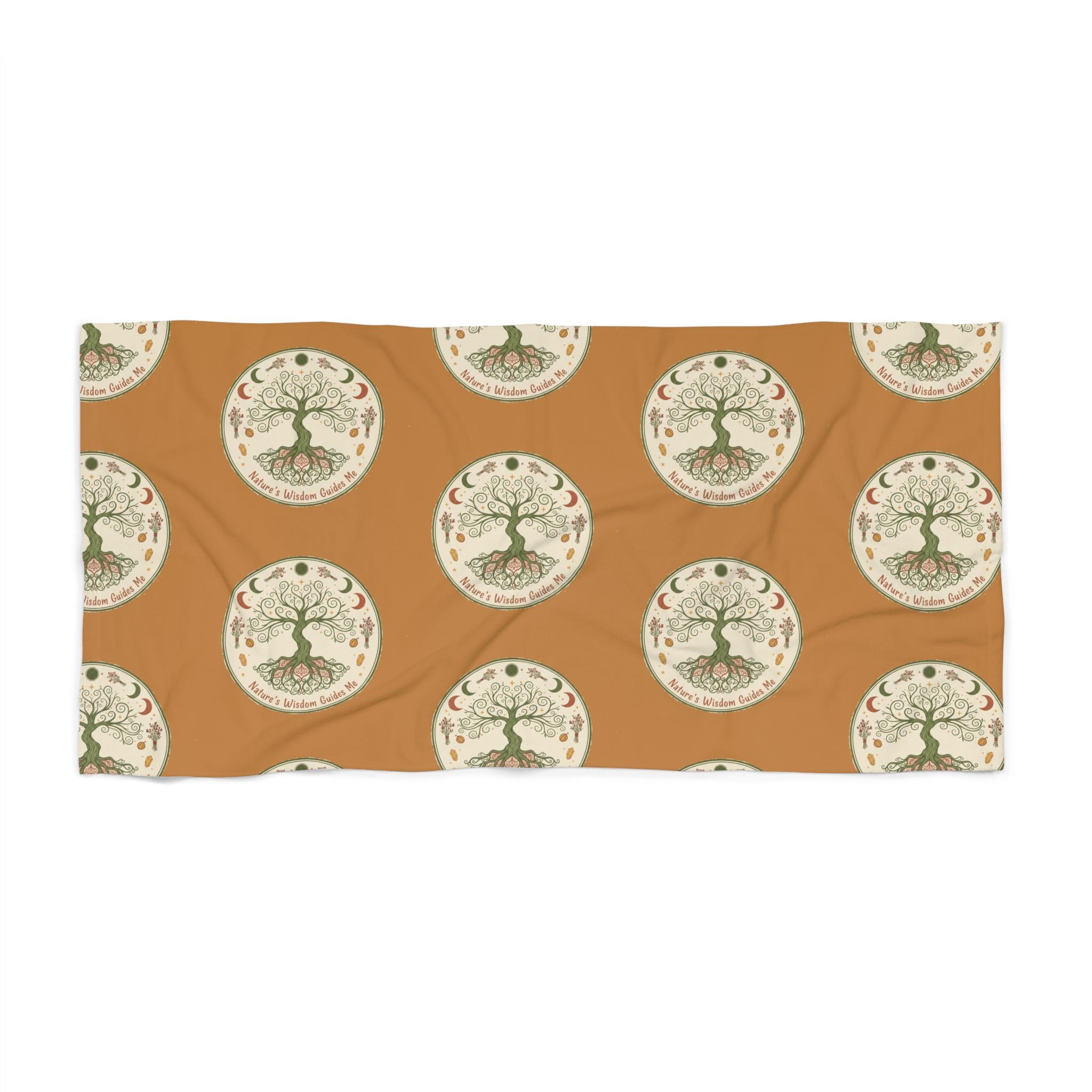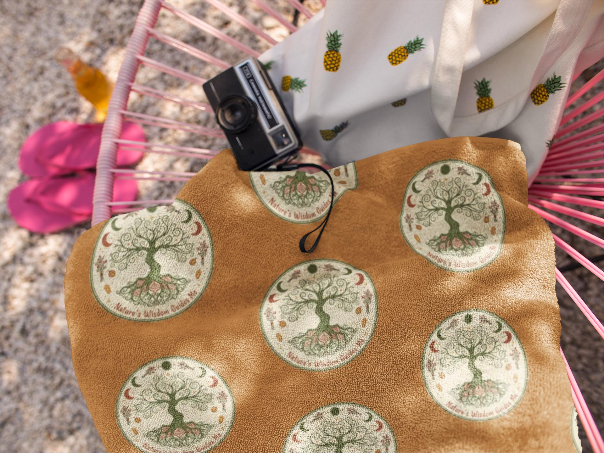 Salt-warmed sand, late-afternoon sun, and a quiet stretch of shoreline—that’s the mood this beach towel brings with it. Lightweight yet absorbent, the soft cotton loop backing feels gentle against sun-kissed skin while the durable polyester print face holds rich, earthy colors and a detailed emblematic design. Laid over a lounge chair or spread on the sand, the warm terracotta background and repeating tree motif create a calm, rooted presence—an invitation to slow down, read, and listen to waves. The towel dries fast between dips, packs easily into a tote, and keeps its shape through many beach days and poolside afternoons.