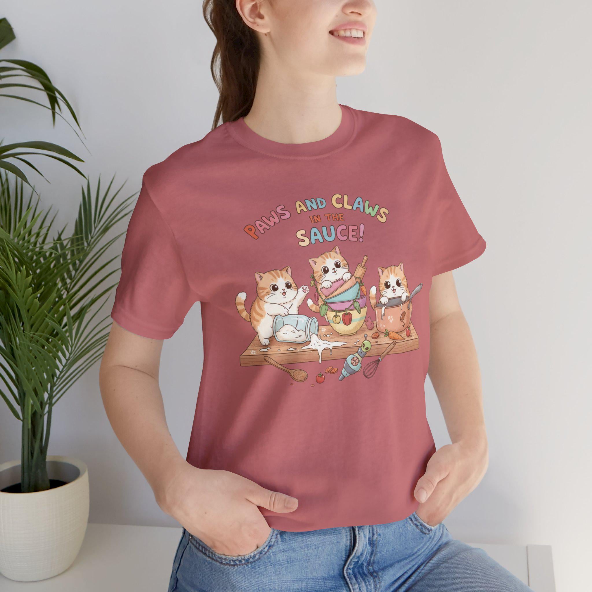 Three mischievous kitties huddle on a wooden board, elbows deep in a colorful bowl of sauce — flour on whiskers, tiny paws tipped in spice. This tee feels like a quiet kitchen afternoon turned delightfully chaotic: warm, playful, and a little messy. Lightweight Airlume cotton keeps the print crisp and wearable, so the illustration’s soft pastels and fine details sit flat against the fabric without losing charm. Wear it when you want to evoke cozy cooking sessions, slow weekends, or to spark smiles from fellow cat lovers while you bake or chat over coffee.