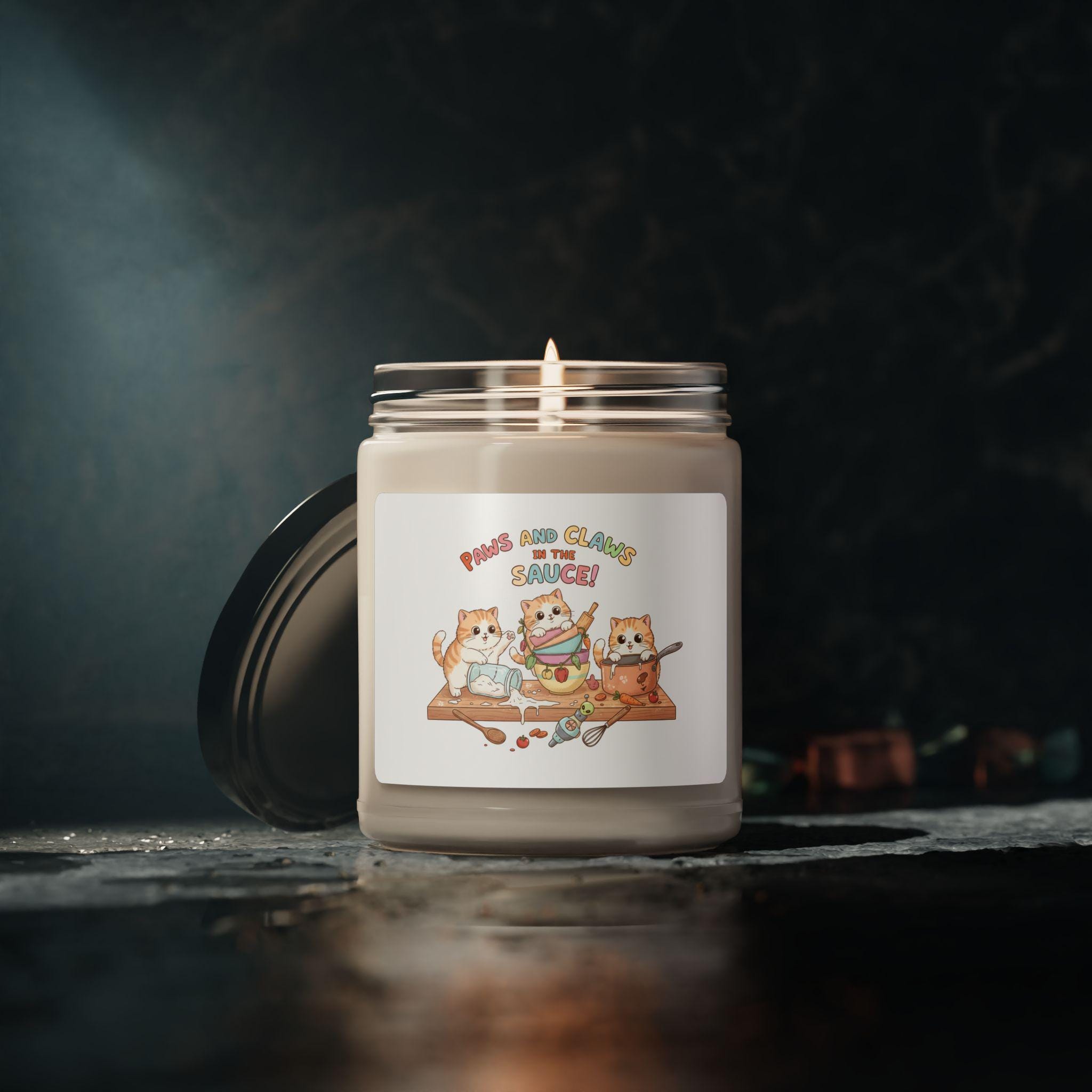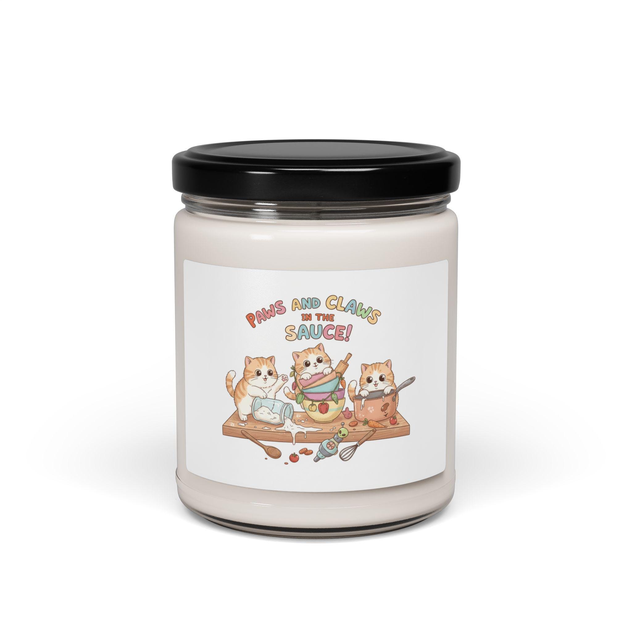 Hand-poured 9 oz soy candle in a reusable glass jar, scented with carefully blended fragrance oils and natural essential oils to bring a cozy, memorable mood to your space. The label features a playful illustration of three cats happily mixing sauce—an adorable touch for cat lovers, kitchen nooks, or anyone who enjoys warm, comforting scents. Burns clean with a 100% cotton wick and a natural soy wax blend for 50–60 hours of gentle, even fragrance. Choose from 12 curated scents ranging from bright and fresh to warm and spicy. The jar cleans easily after use to become a small planter, trinket holder, or countertop accent.