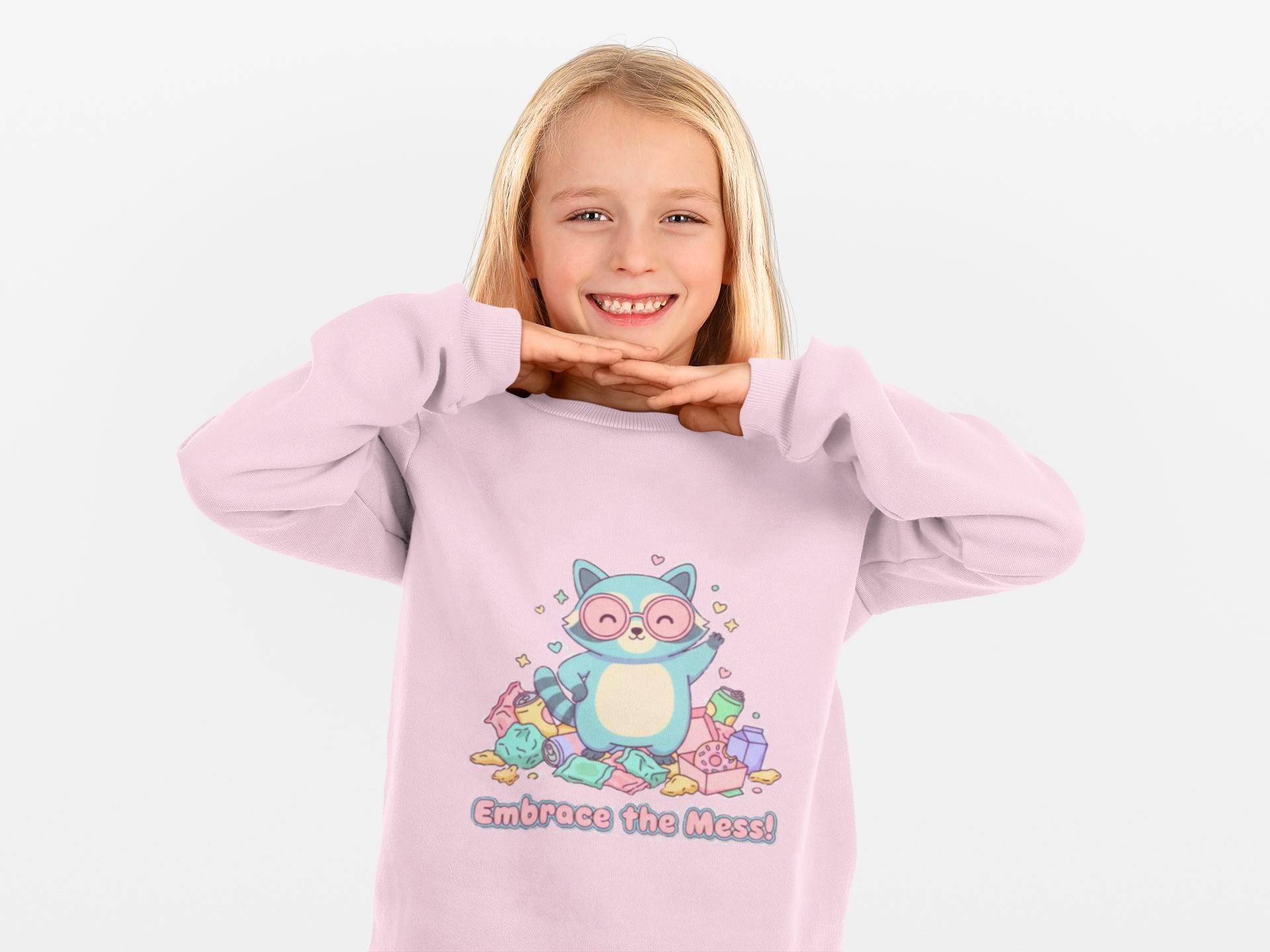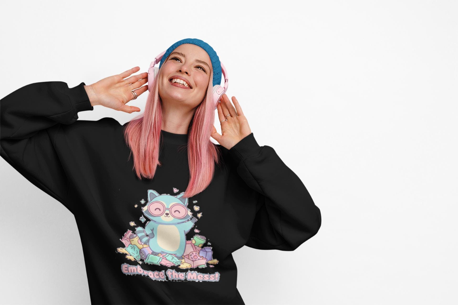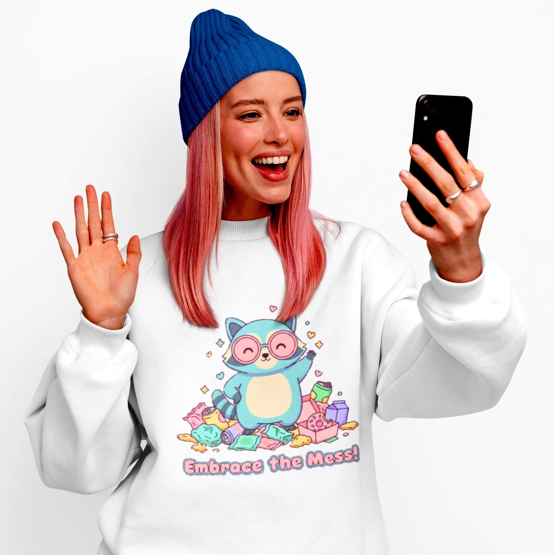 Soft, sweet raccoon illustration with pastel holiday treats and the lighthearted caption “Embrace the Mess!”—a cozy crewneck that leans into the Trash Animal Joy trend with meme-ready charm. The rounded, friendly art and muted palette give a wholesome, slightly irreverent vibe suited to seasonal, internet-humor wardrobes without referencing any specific characters. Wear it for low-key holiday gatherings, chilly walks, or whenever you want a playful, comforting layer that signals you don’t take tidy too seriously.