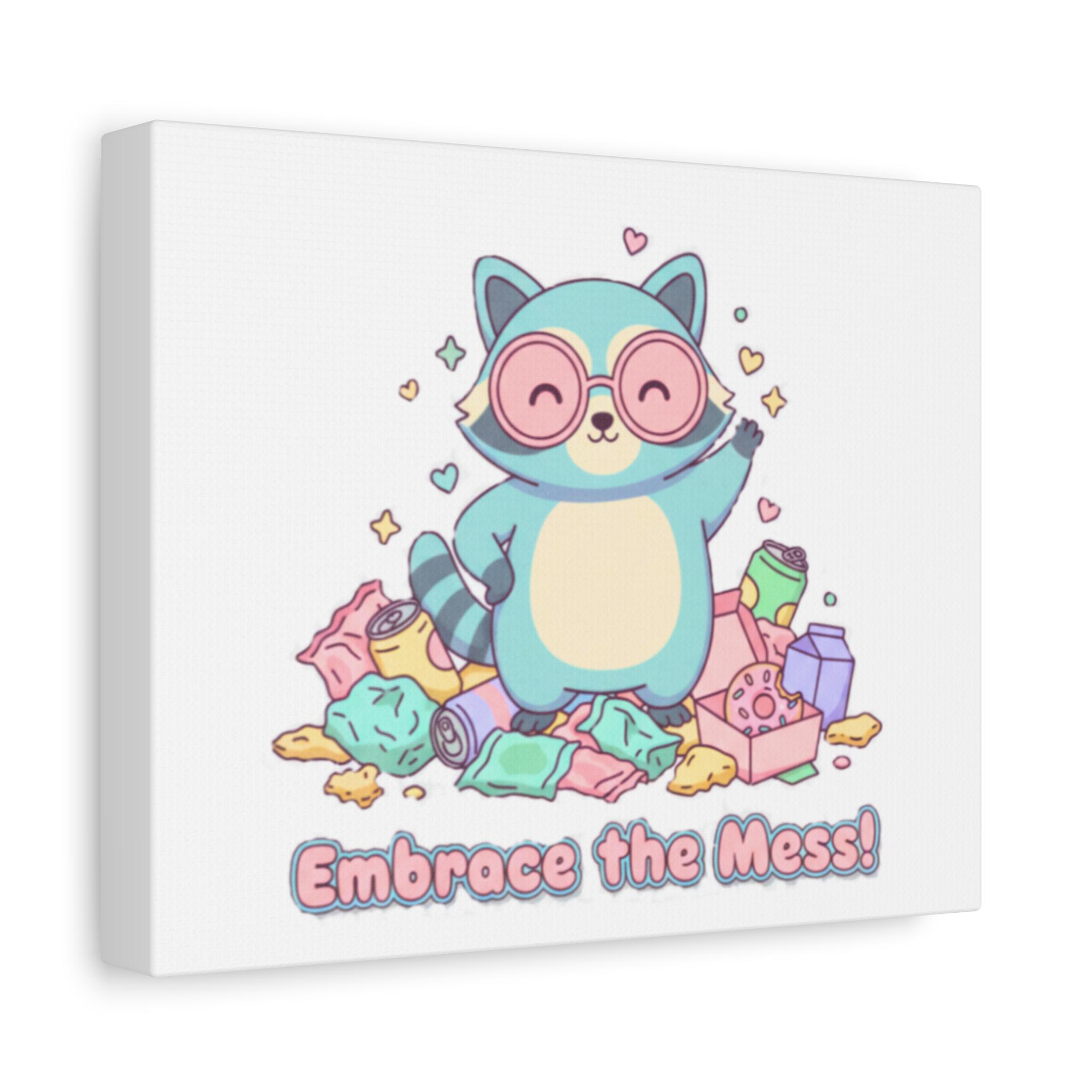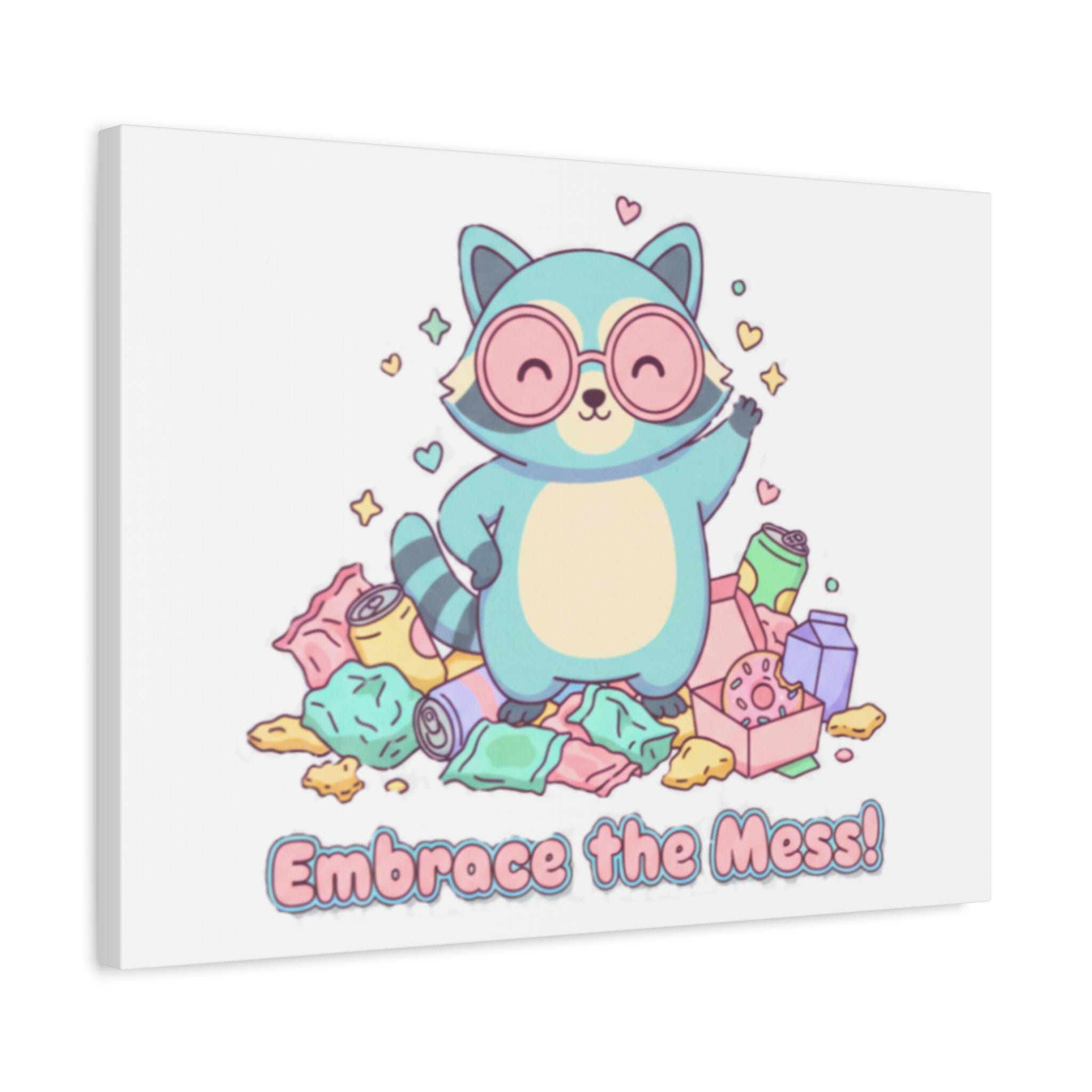 Sweet, selfie-ready raccoon art on a matte stretched canvas that channels the ‘Trash Animal Joy’ meme aesthetic with soft pastels and playful charm. The illustration shows a smiling raccoon surrounded by festive clutter, paired with a lighthearted caption that leans into quirky holiday humor and approachable chaos. Its rounded shapes, gentle palette, and clean matte finish make it a cozy wall accent for fans of cute, meme-adjacent decor.