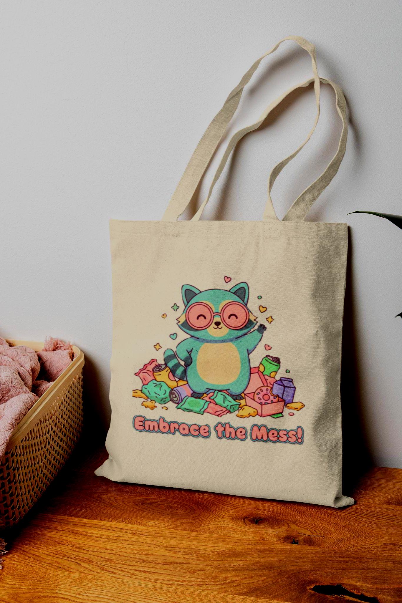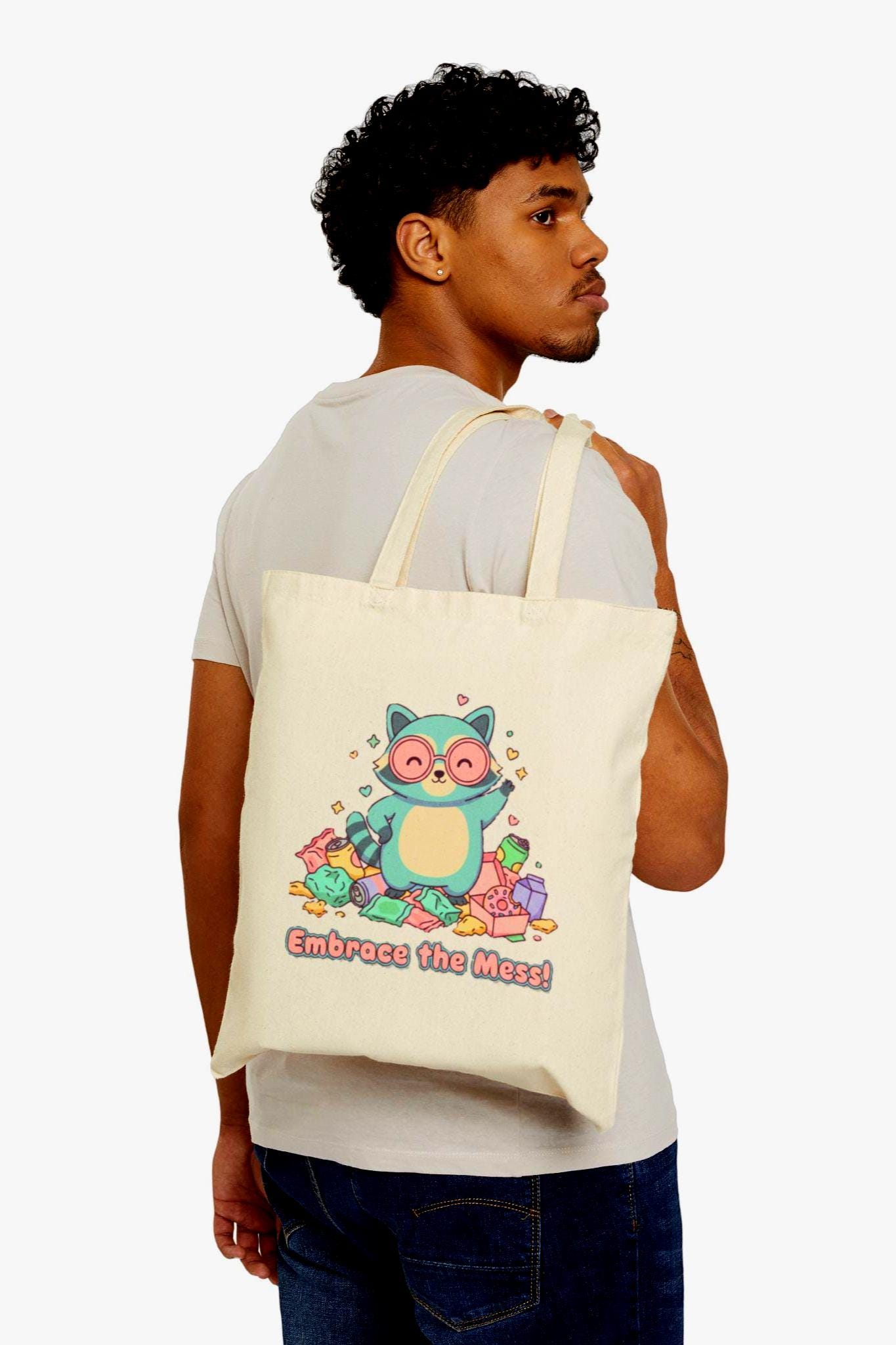 Sweet, holiday-ready tote featuring a chubby, wide-eyed critter amid tiny festive trinkets — a playful take on the ‘trash animal’ meme lane with a warm, pastel palette and rounded lettering. The soft, approachable illustration leans into wholesome mischief rather than edge, making it a lighthearted seasonal accessory that reads as funny and cozy within the trash-animal/holiday trend.