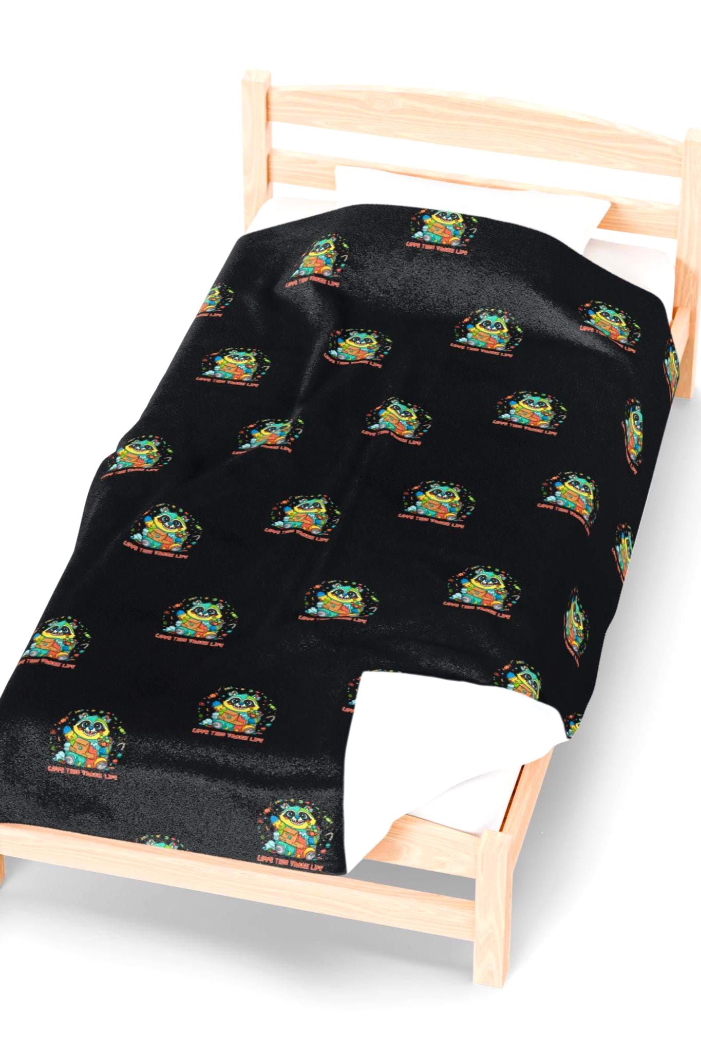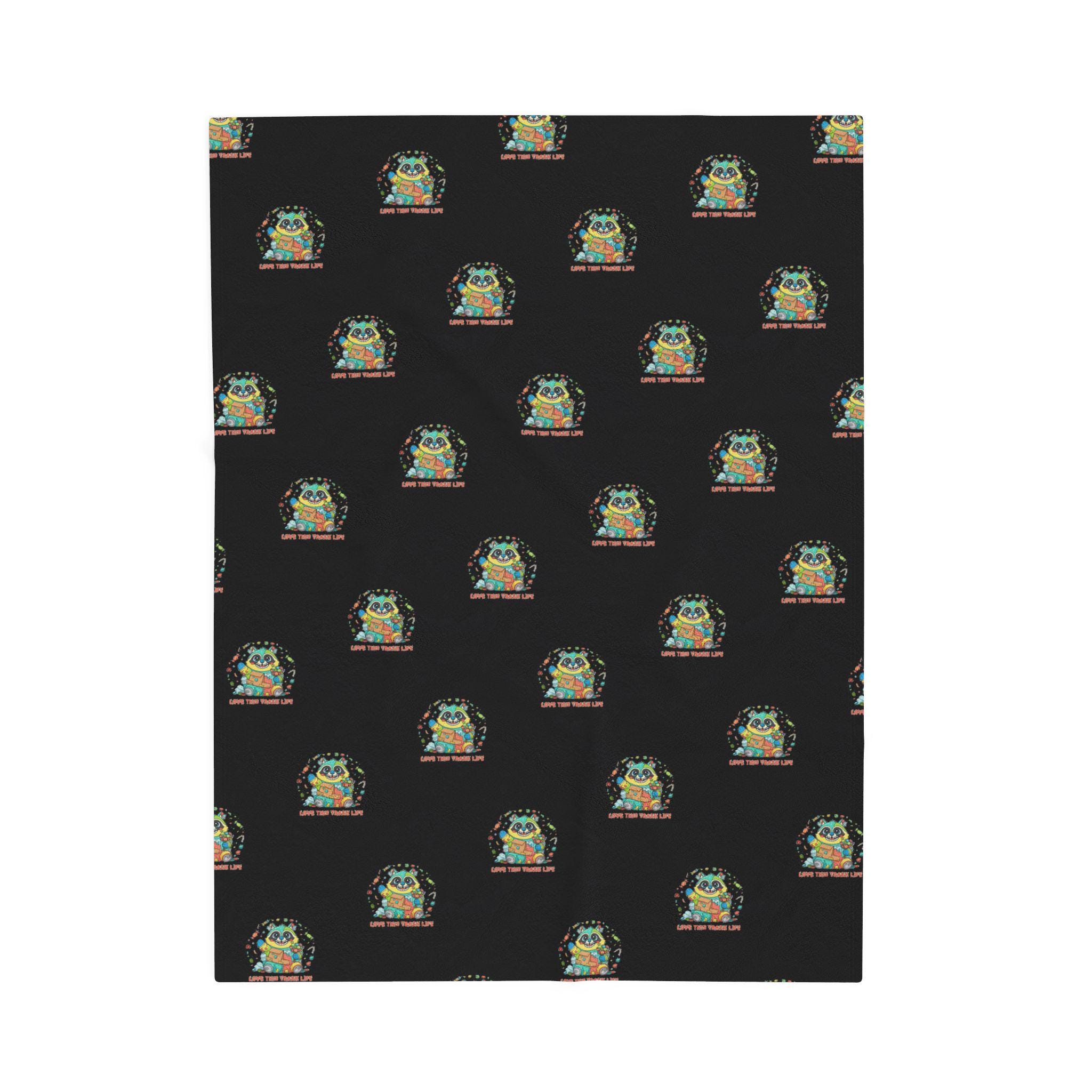 Sunny, soft illustration of a cheerful raccoon amid wrapped treats and scattered candy, paired with a lighthearted caption that leans into the “Trash Animal Joy” meme-holiday vibe. The artwork uses rounded shapes, pastel-green background, and warm candy tones to keep the mood sweet rather than edgy. This velveteen blanket brings cozy humor to winter nights and seasonal decor for fans of cute, irreverent rodent-themed holiday art. Product features - Double needle topstitch on all seams - 100% polyester or 83% Polyester and 17% Spandex options - Print on one side with high detail and vibrant color - Medium heavy-weight fabric (8.85 oz/yd² / 300 g/m²), extra soft - Meets listed flammability and chemical compliance standards Care instructions - Do not dryclean - Do not iron - Tumble dry: low heat - Do not bleach - Machine wash: cold (max 30C or 90F), *hand wash will extend the quality of the product