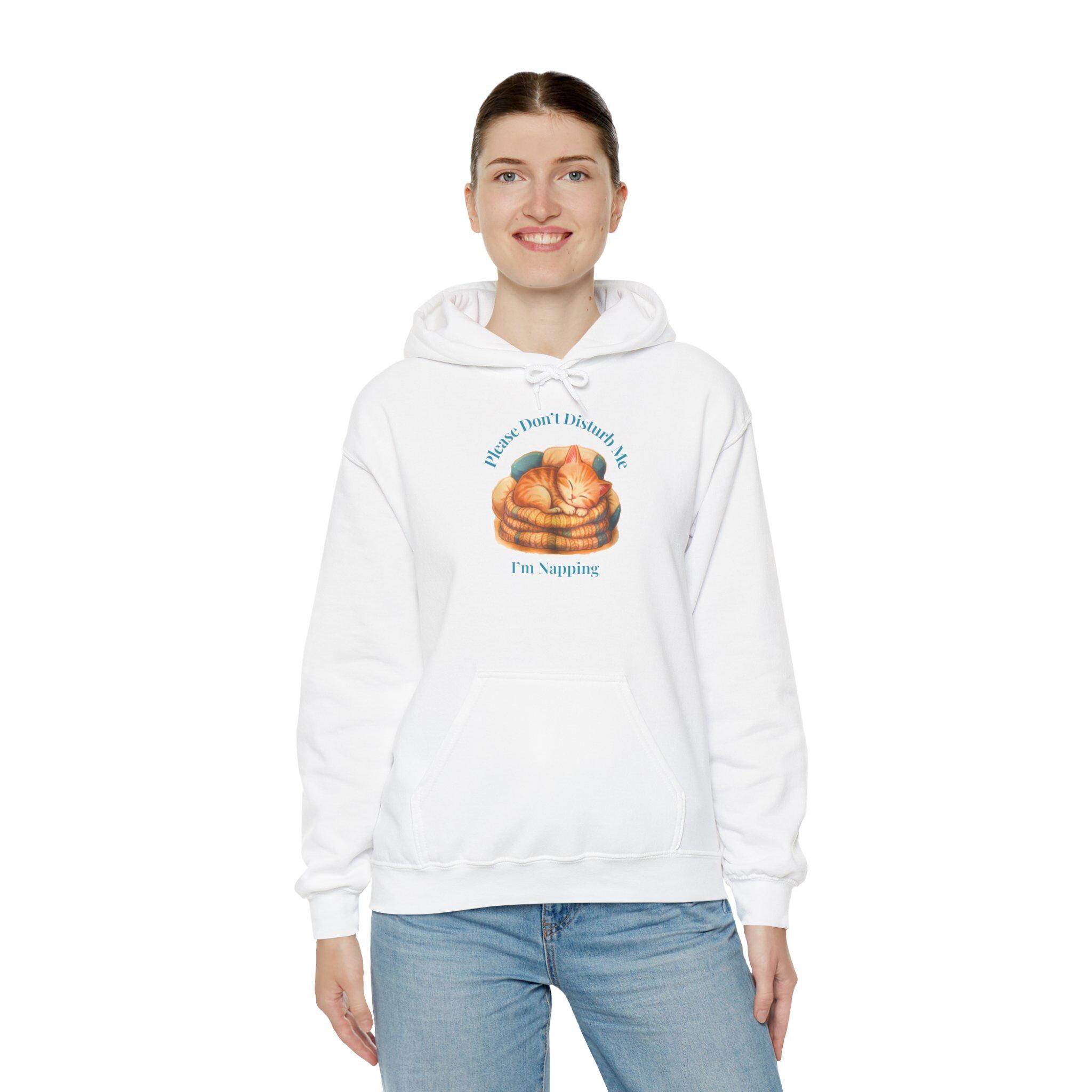 Soft, warm hooded sweatshirt featuring a sweet, sleepy cat curled up on a stack of pancakes with the caption “Please Don't Disturb Me — I'm napping.” The gentle watercolor-style illustration sits on a roomy front pouch and is printed with vivid, durable inks so the cozy scene stays bright wash after wash. Designed for relaxed, everyday wear, the medium-heavy 50/50 blend holds shape and color while the double-lined hood and color-matched drawcord add subtle polish. Slip this on for slow mornings, quiet weekends, or evenings when you just want to curl up and recharge.