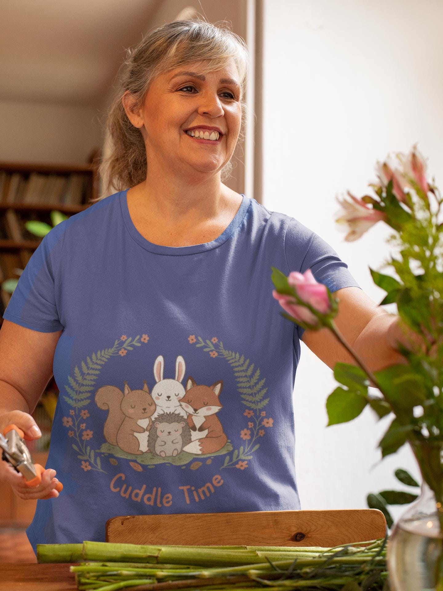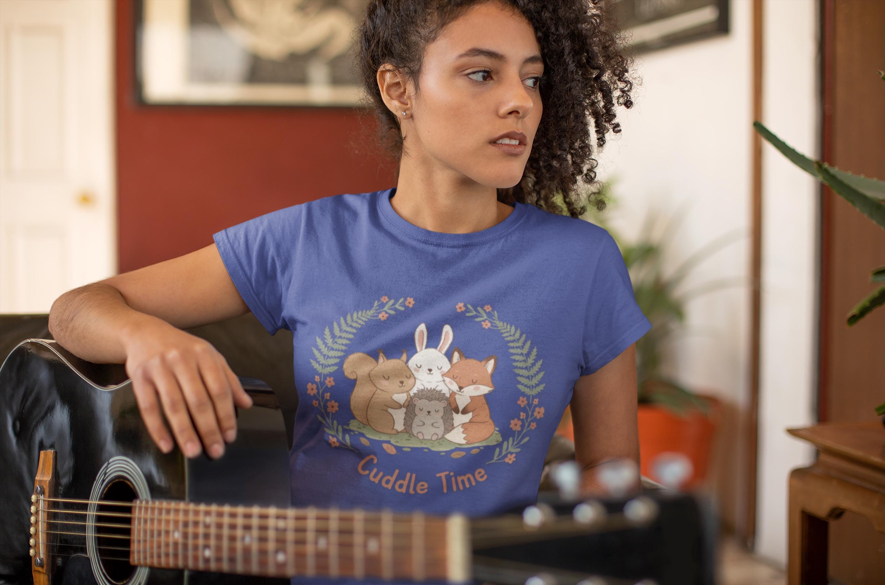 A soft, cozy tee showcasing a trio of winter forest critters nestled together in a gentle wreath of leaves and tiny blossoms. The warm, muted palette and hand-drawn illustration capture the Cute Cozy Critter Art vibe — slow-living, comforting, and quietly whimsical — making the design read as a tender moment rather than bold statement. Subtle rounded lines and minimal lettering keep the focus on the animals and seasonal softness, fitting into wardrobes for relaxed layering and everyday wear during cooler months.