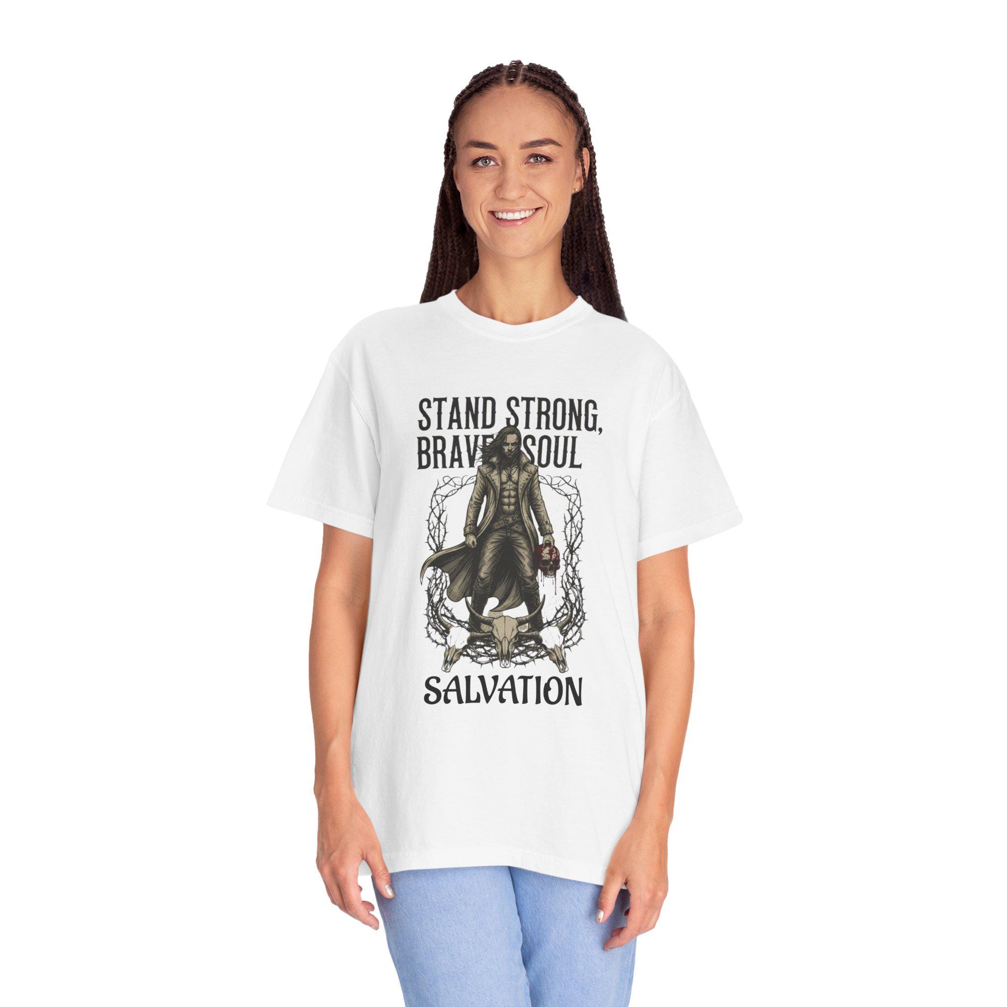 This heavyweight, garment-dyed tee carries a raw, contemplative energy. A lone, cloaked figure stands framed by thorned vines and the words “STAND STRONG, BRAVE SOUL — SALVATION,” creating a look that's part pilgrimage, part urban armor. The dense 100% ring-spun cotton softens with wear, while the relaxed cut and tubular knit keep the silhouette simple and wearable. Wear it when you want clothing that feels like a quiet declaration — for late-night walks, shows with friends, or days when you need a reminder to keep moving forward.