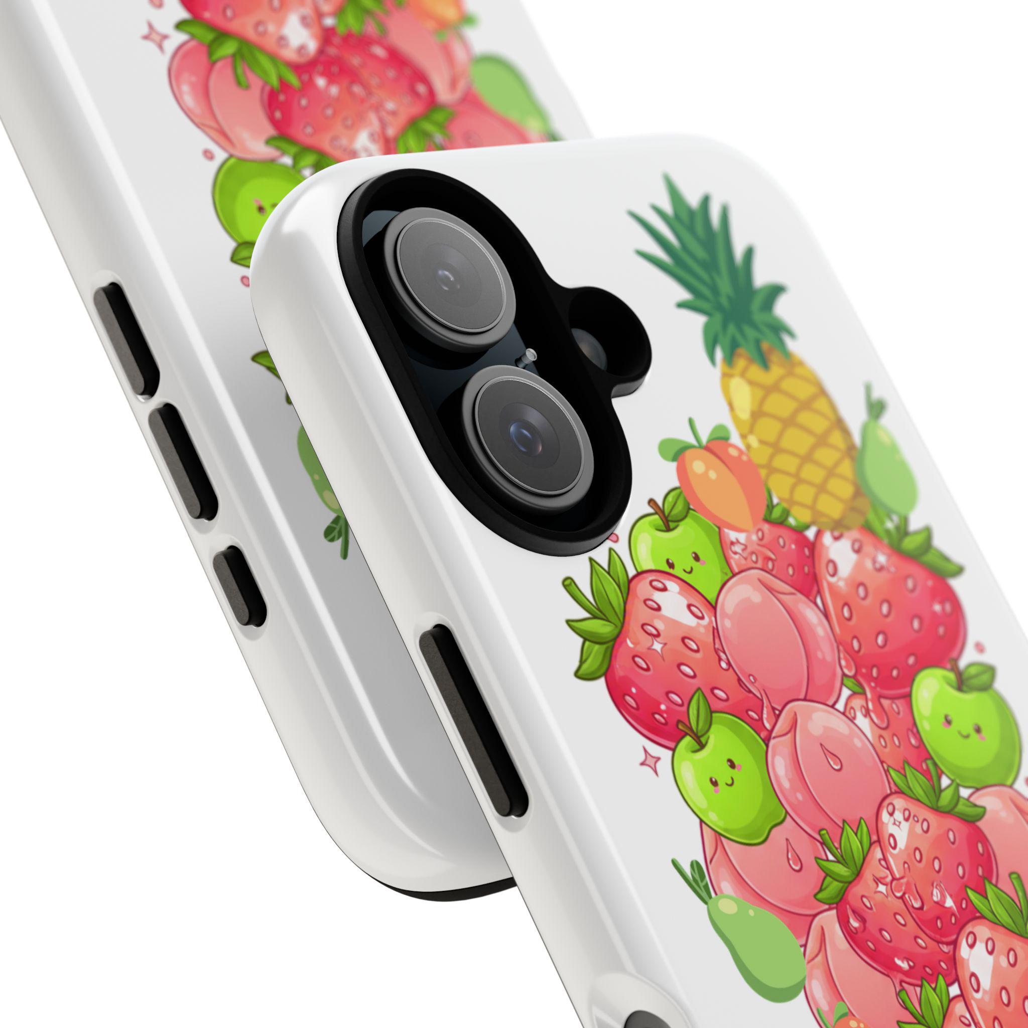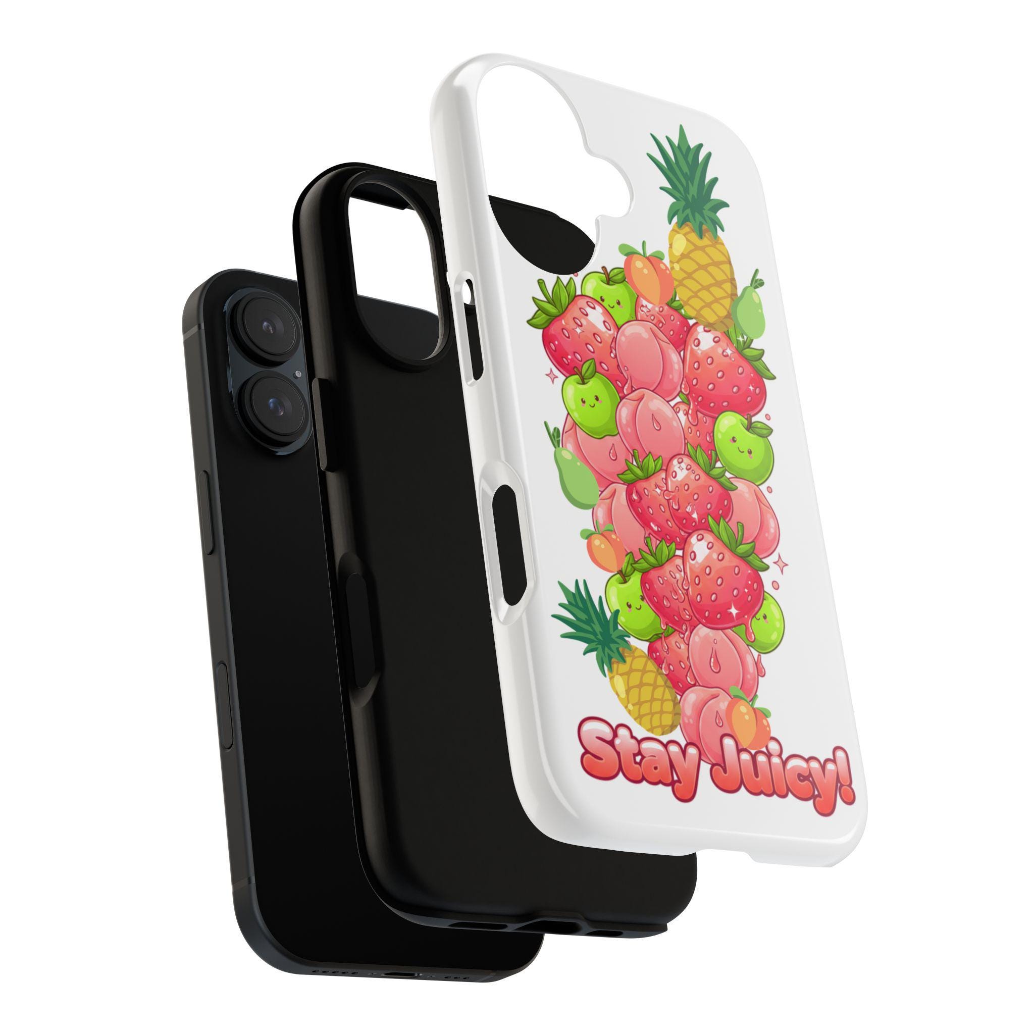 This glossy/matte protective phone case brings a playful, fruity vibe to your everyday carry. Bright, hand-drawn strawberries, peaches, apples and pineapples stack into a cheerful column with a bubbly “Stay Juicy!” slogan at the base. The dual-layer polycarbonate shell and TPU silicone liner work together to absorb shocks and resist drops while keeping ports clear and wireless charging available. The high-density 3D wrap print stays colorful outdoors thanks to UV protection, making this case a fun companion for long summer days, farmers’ market runs, or everyday city strolls.