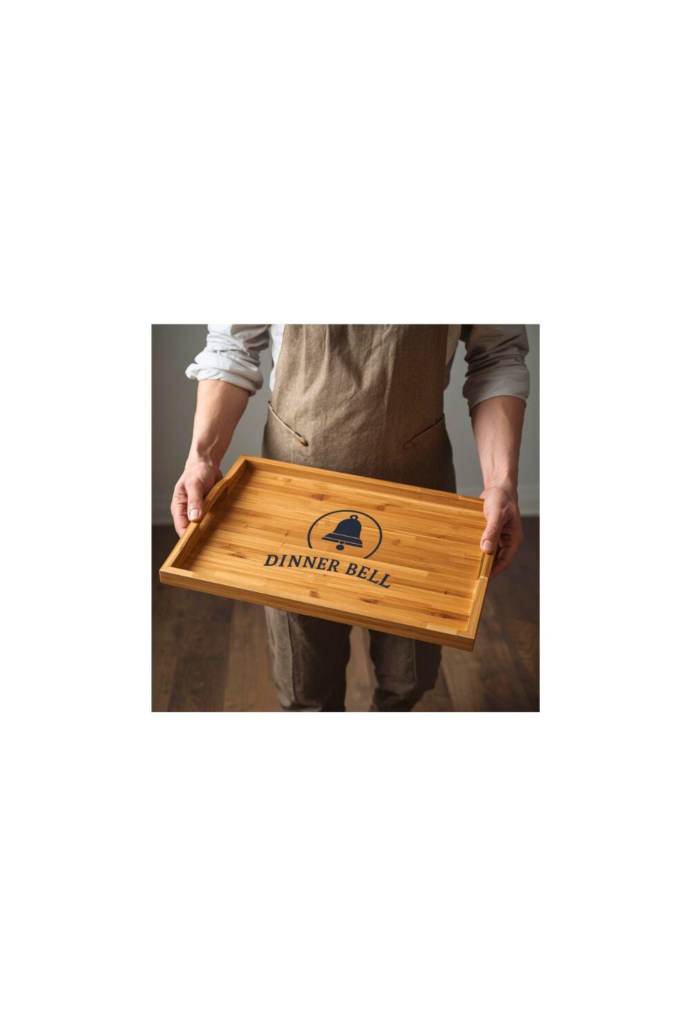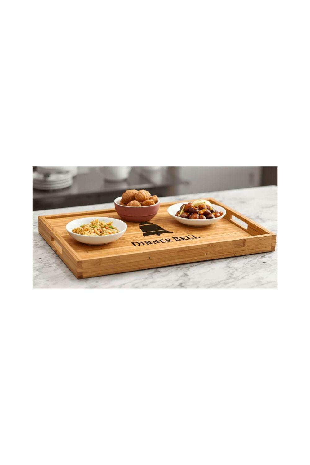 A warm, engraved bamboo serving tray that brings rustic charm and everyday usefulness to kitchen and dining rituals. Smooth, sustainably sourced bamboo shows off a deep-grain finish, while the laser-engraved dinner bell motif adds character and a handcrafted feel. Built with raised sides and built-in cutout handles, this tray carries plates, mugs, or appetizers from counter to table with steady balance. It’s comfortable to hold and easy to style — lay it on a breakfast nook, use it to present an evening spread, or set it down as a decorative base for candles and seasonal accents.