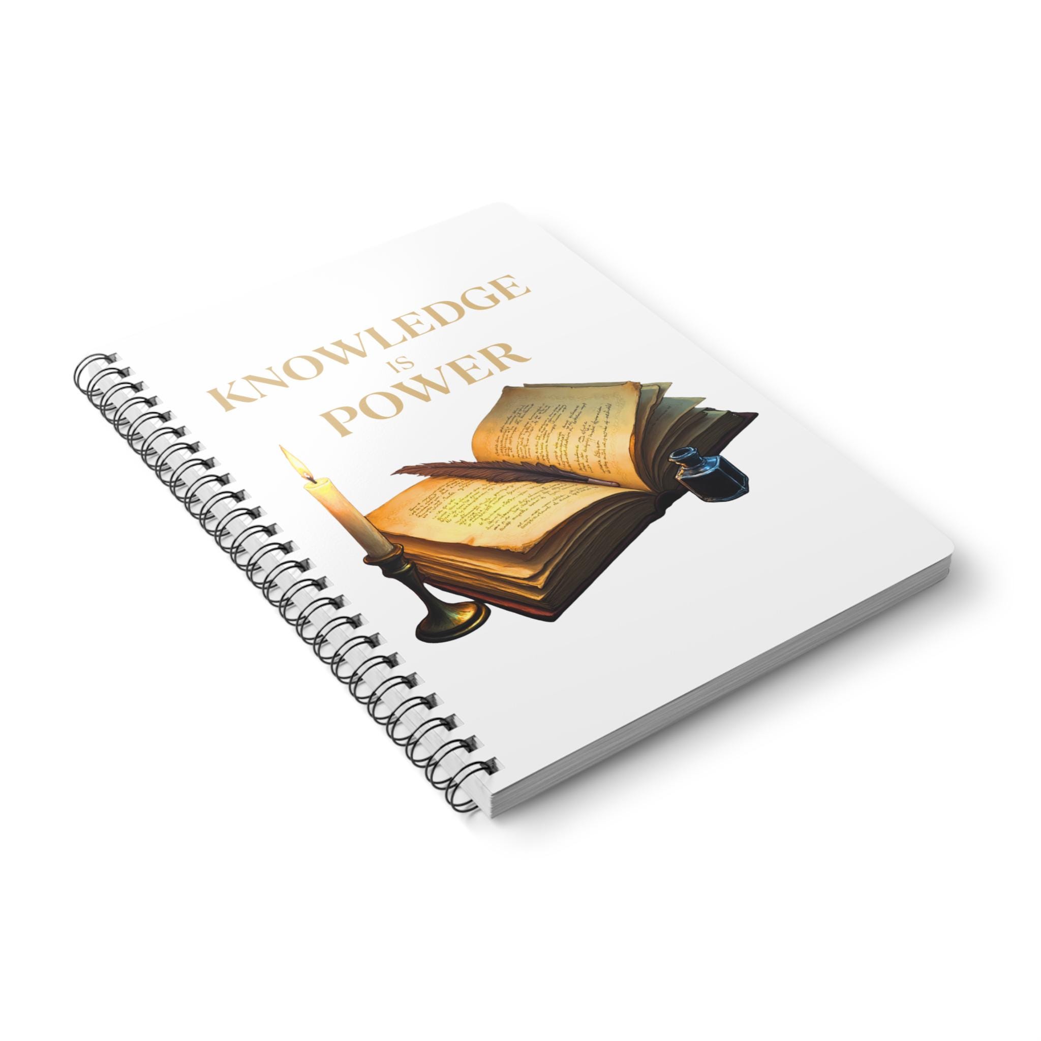 Warmly worn pages and a quiet desk lamp — this A5 wire-bound notebook brings that atmosphere to your everyday notes. The cover shows an open, ink-stained book beside a flickering candle and classic inkwell, under the steady reminder KNOWLEDGE IS POWER. It feels like a small study break: pull it out to sketch ideas, draft a short essay, or map out reading lists. The compact A5 size slips into a bag or sits beside a mug, while the black Wire-O spine lets the book lay flat for smooth writing. Bright, glossy cover art keeps the illustration vivid through regular use, and the lined 90gsm pages (150 total) take pens and everyday pencils with confidence.