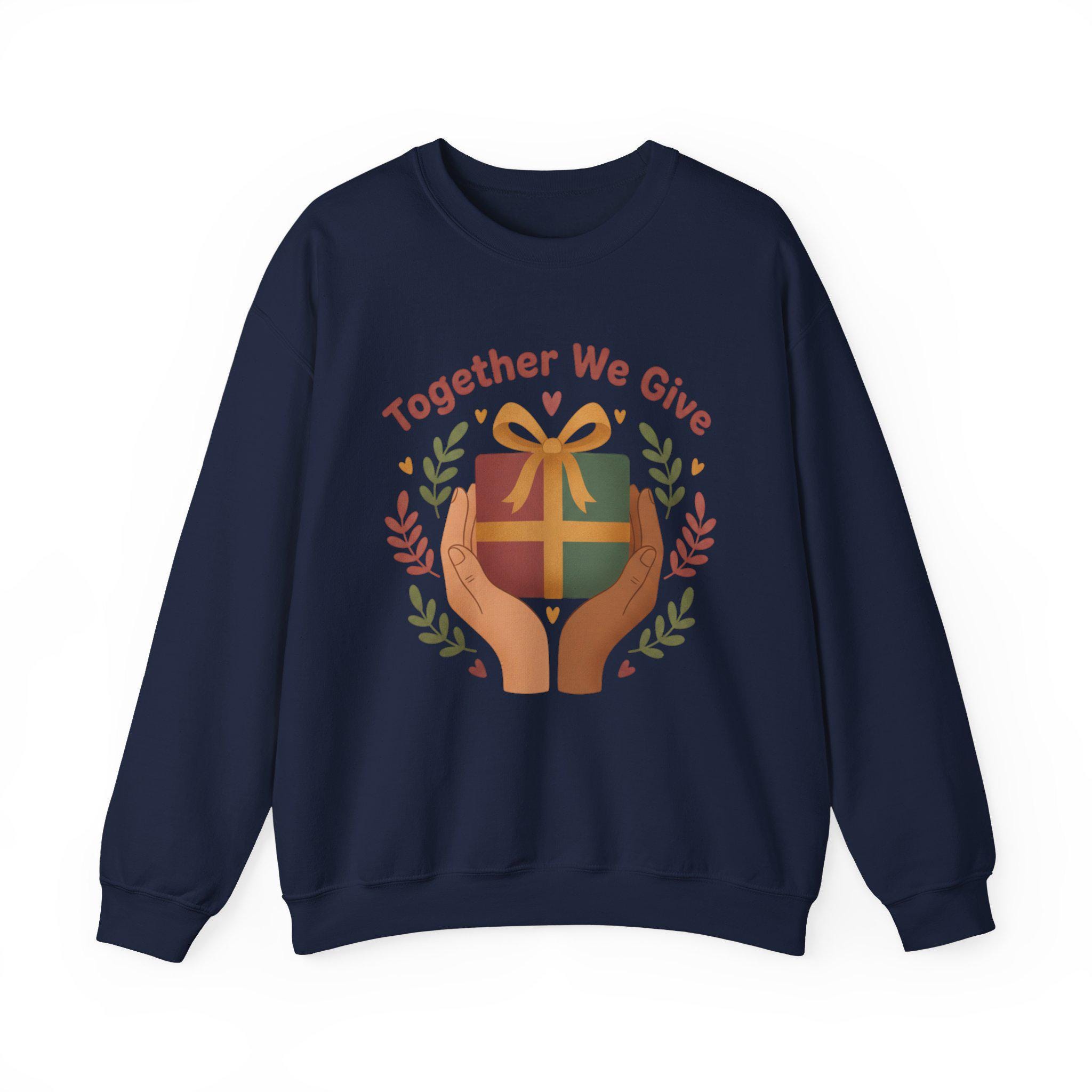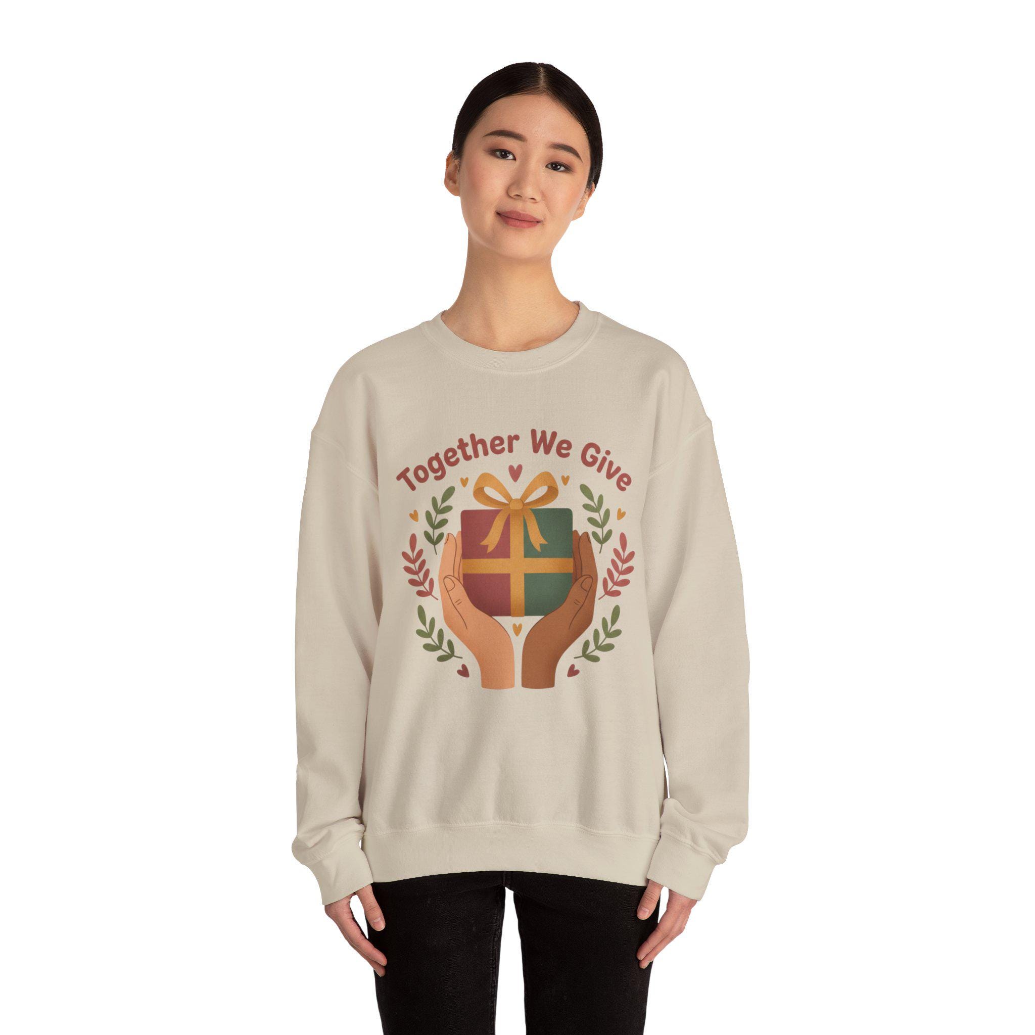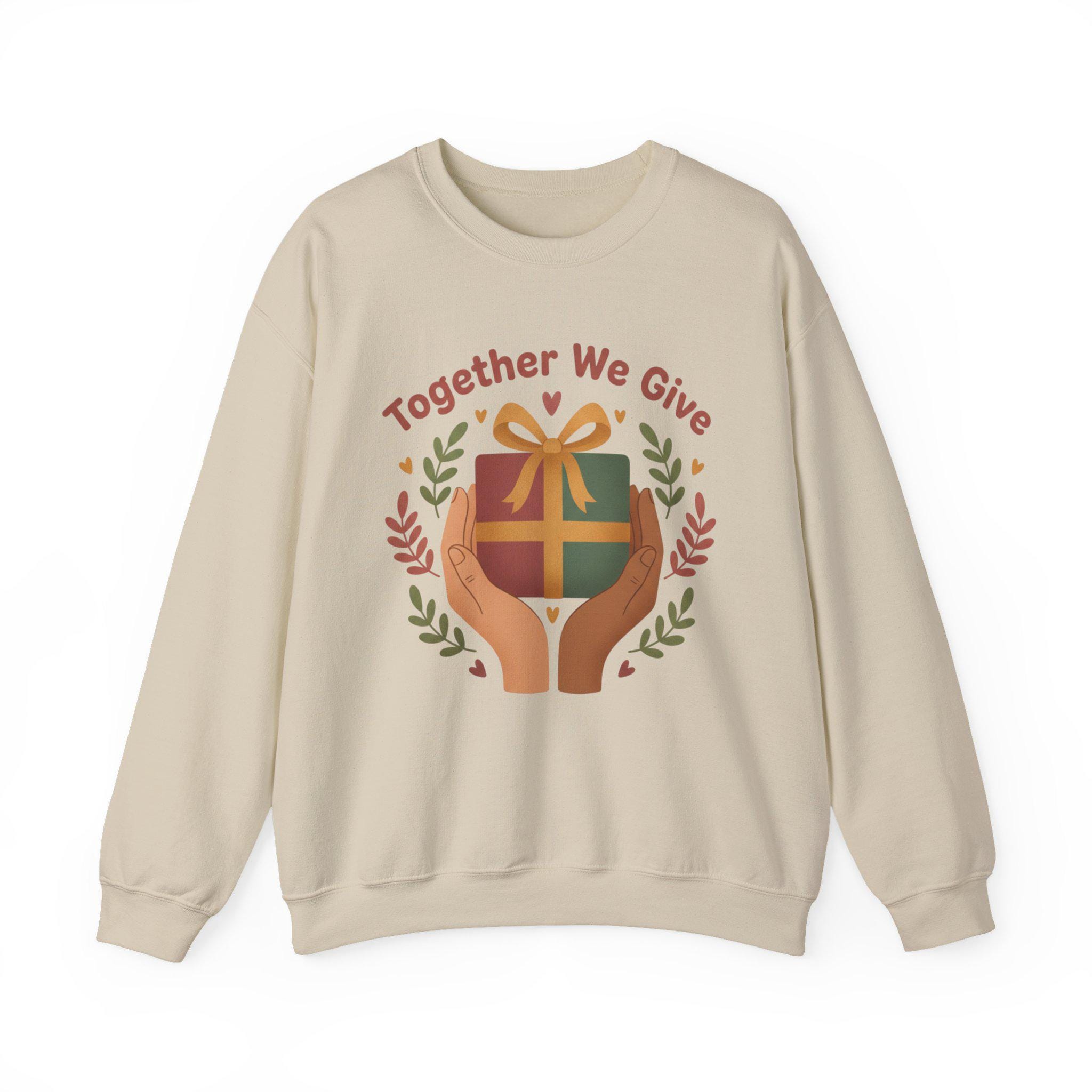 Warm, message-led sweatshirt with a community-first design: a stylized hand holding a wrapped present framed by laurel sprigs and the phrase “Together We Give.” Earthy tones and a friendly sans layout convey holiday giving, local support, and paying it forward without referencing specific brands. The simple emblem reads well on a light crewneck and fits into a seasonal wardrobe focused on generosity and community values.