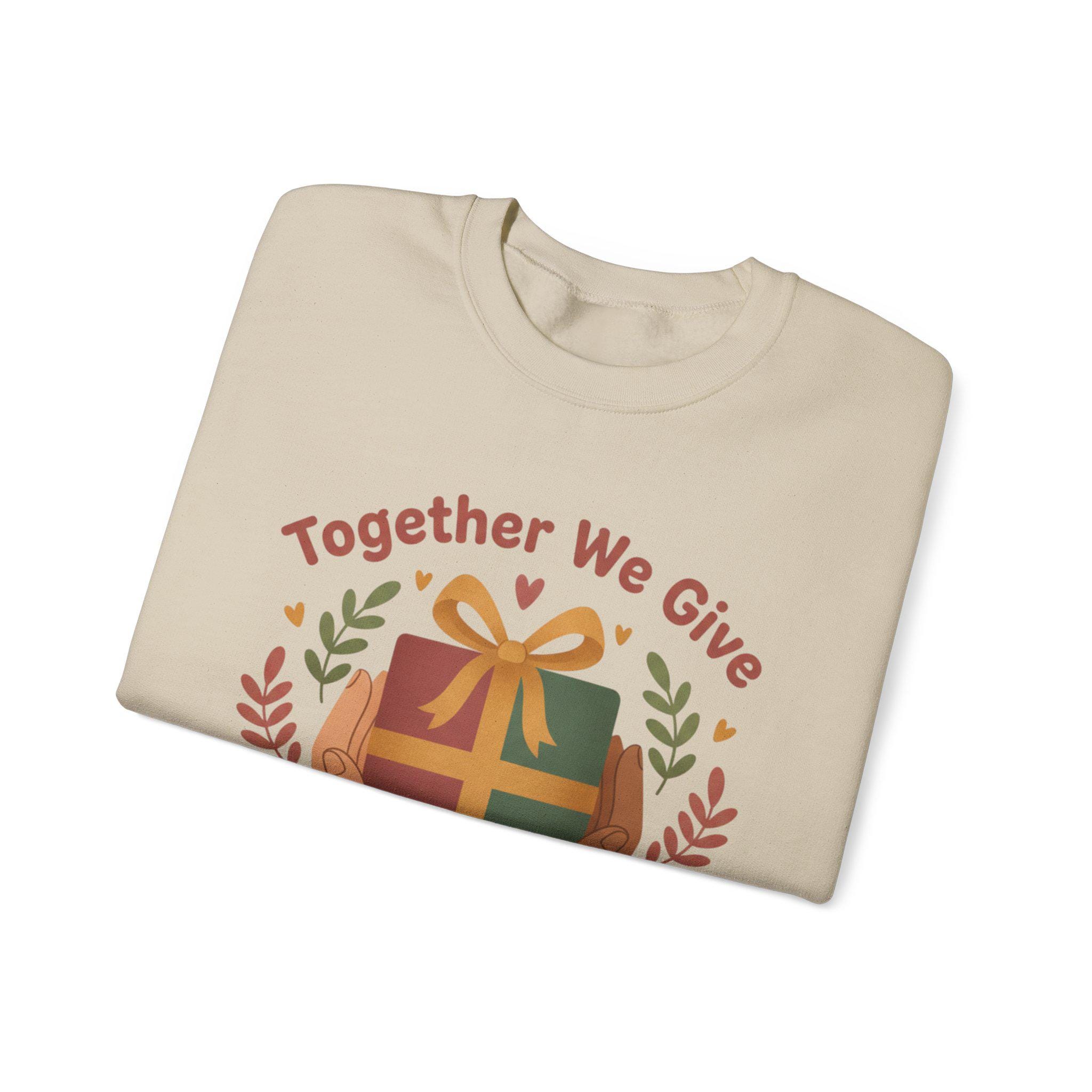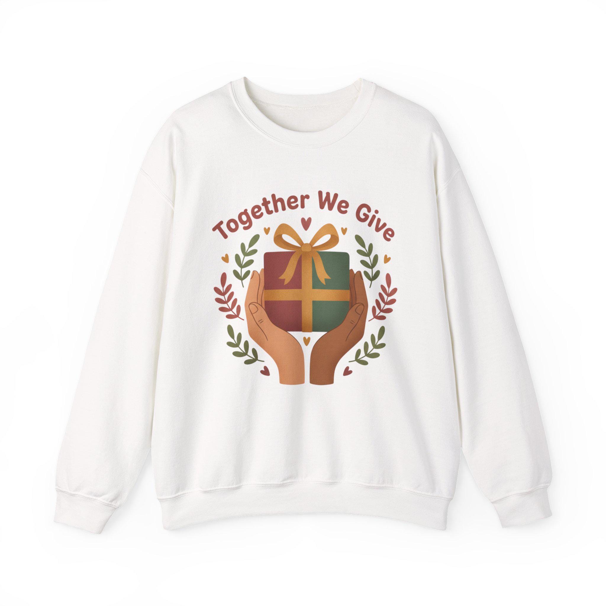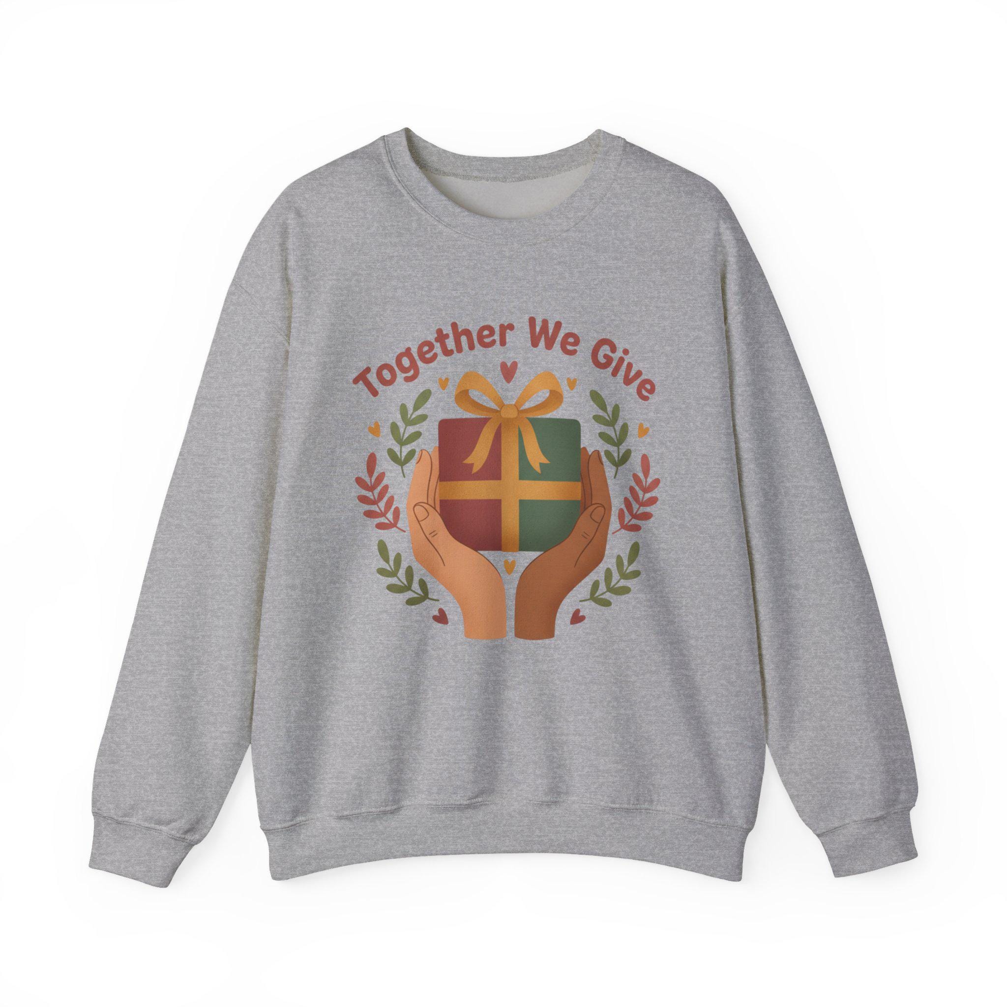 Warm, message-led sweatshirt with a community-first design: a stylized hand holding a wrapped present framed by laurel sprigs and the phrase “Together We Give.” Earthy tones and a friendly sans layout convey holiday giving, local support, and paying it forward without referencing specific brands. The simple emblem reads well on a light crewneck and fits into a seasonal wardrobe focused on generosity and community values.