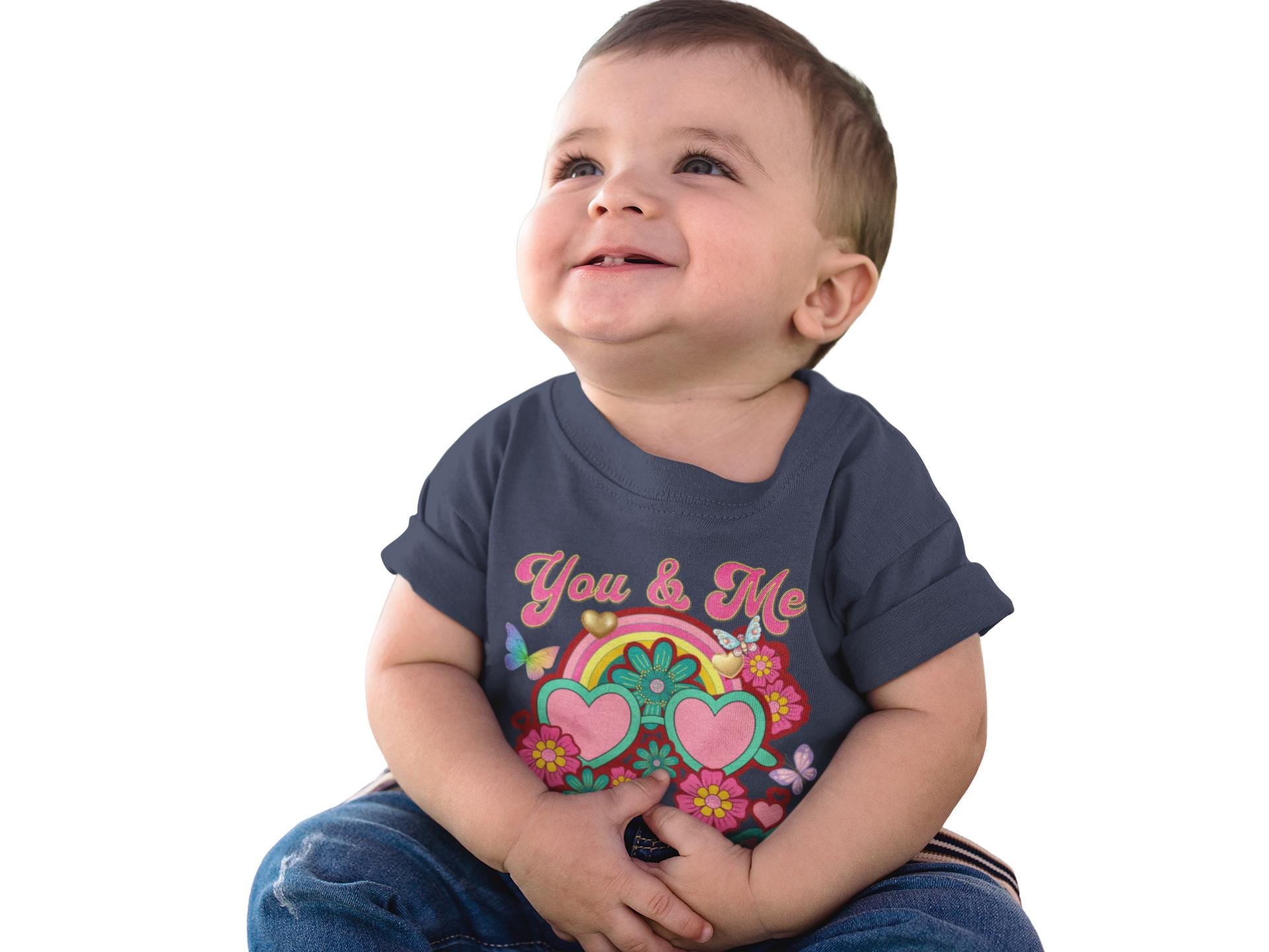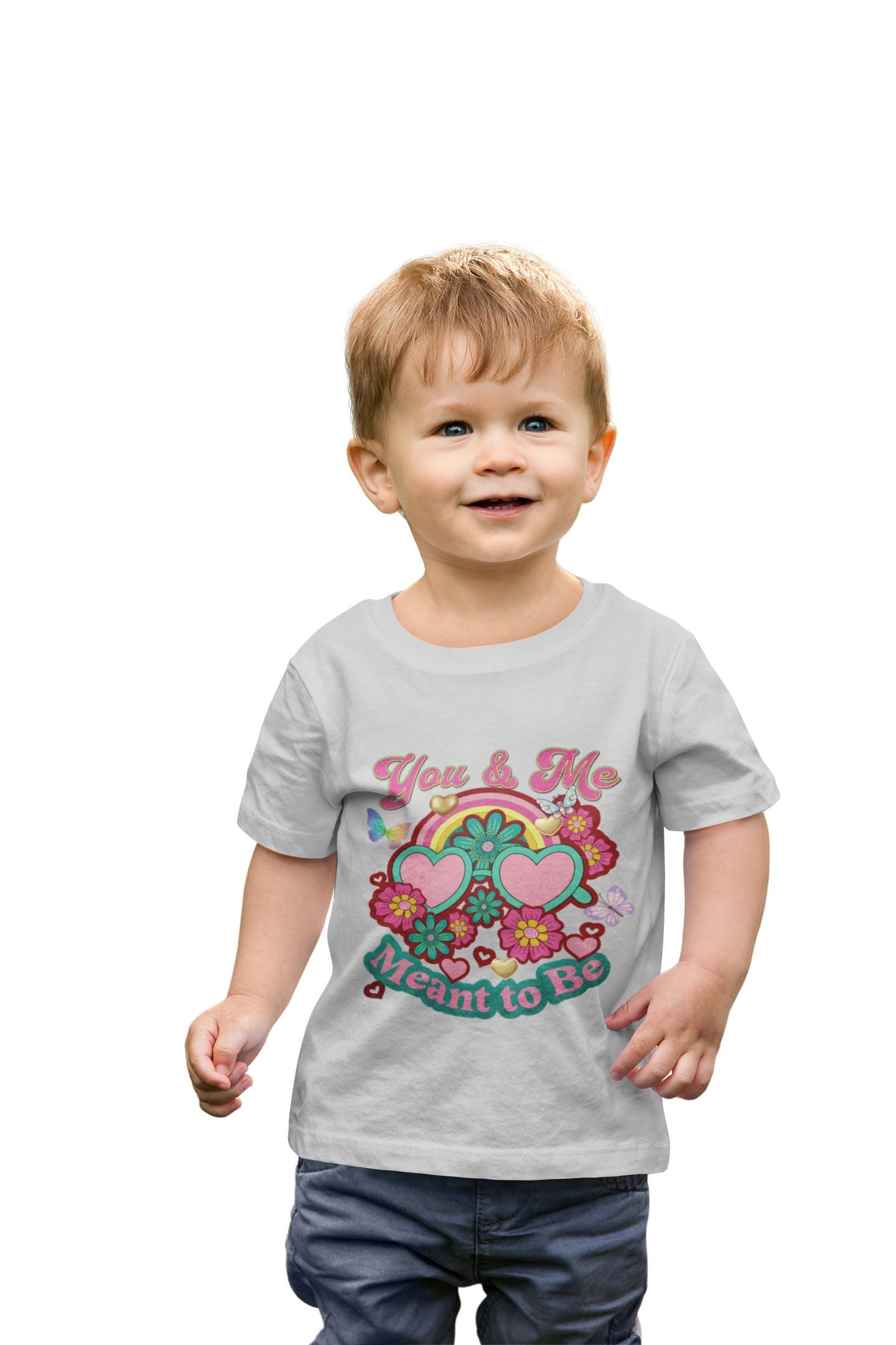A cheerful, retro-inspired toddler tee that brings playful color and sweet sentiment to little wardrobes. Soft medium-weight cotton with a classic cut makes it comfortable for all-day play. The front art mixes heart-shaped sunglasses, smiling flowers, and a rainbow banner that reads “You & Me Meant to Be,” creating a sunny, nostalgic vibe. Lightweight structure and tear-away label keep it fuss-free for parents and cozy for curious kids. This shirt slips easily under sweaters or wears alone on warm days — a bright, wearable reminder of affection during family outings, photo moments, or everyday adventures.