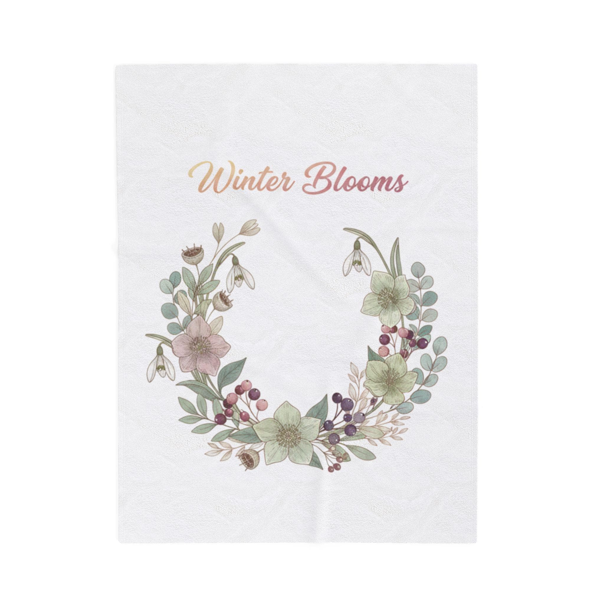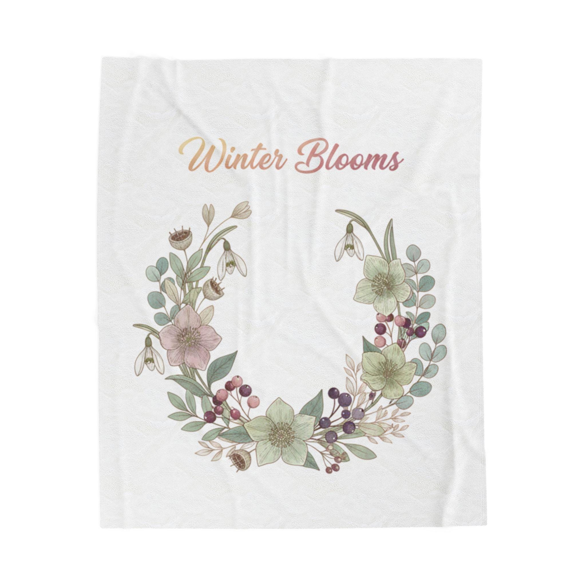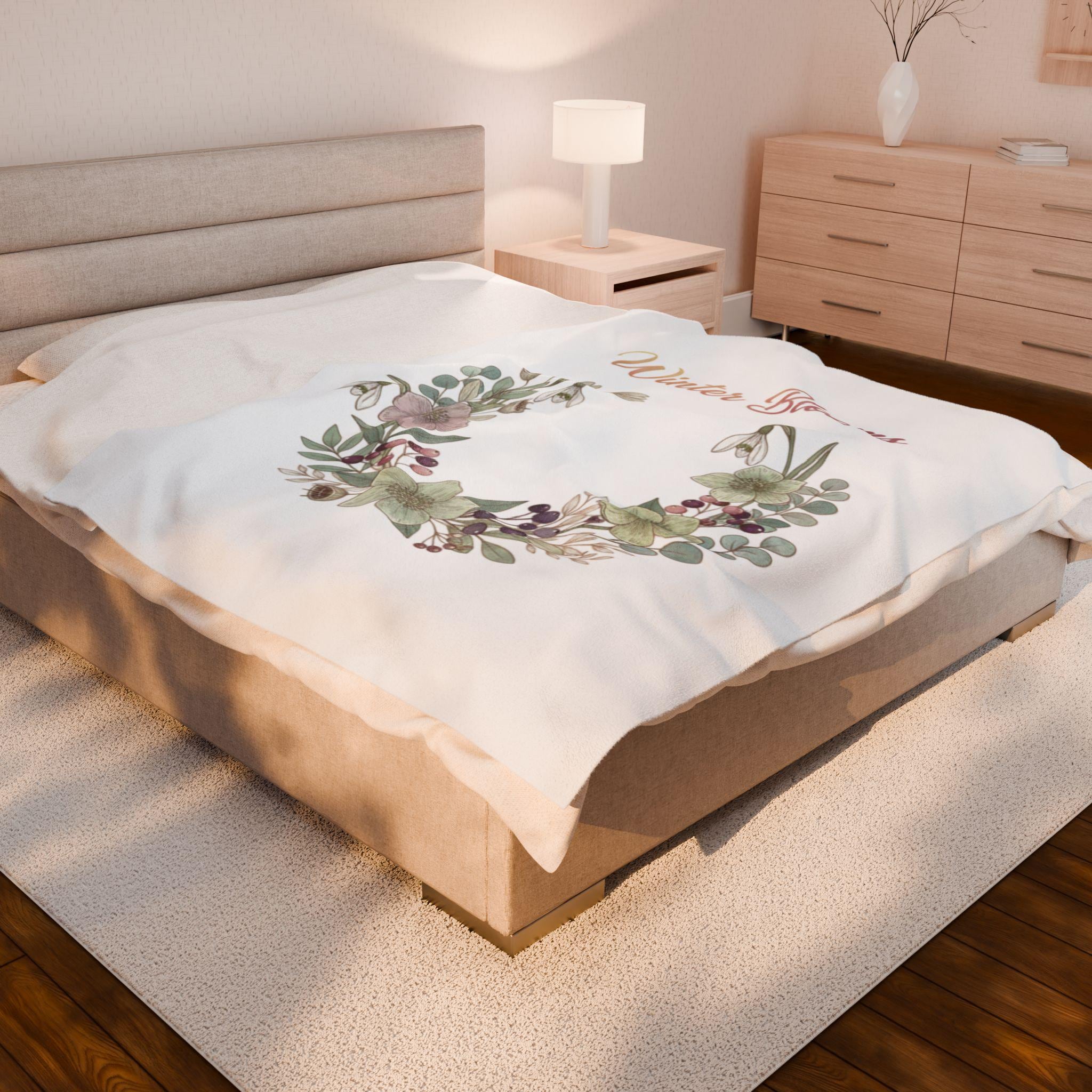 A soft velveteen throw featuring a hand-drawn, muted winter floral wreath in cream, soft greens, and berry tones—subtle botanicals arranged in airy, organic spacing that evoke cottagecore winter and cozy botanical print aesthetics. The artwork is printed on one side in fine detail, giving a pastoral, nature-romantic accent to a living room or reading nook without bold text or busy patterns. Its understated palette and delicate linework blend into rustic or woodland decor, adding a gentle, nostalgic layer of warmth during cooler months.