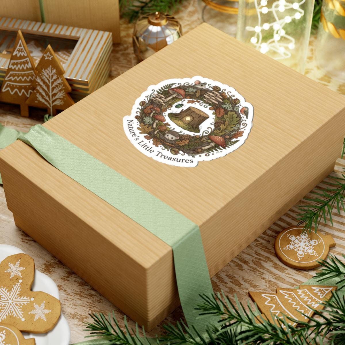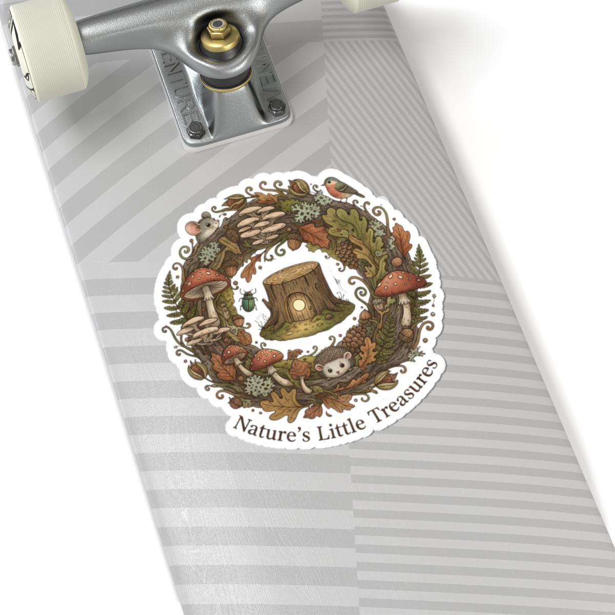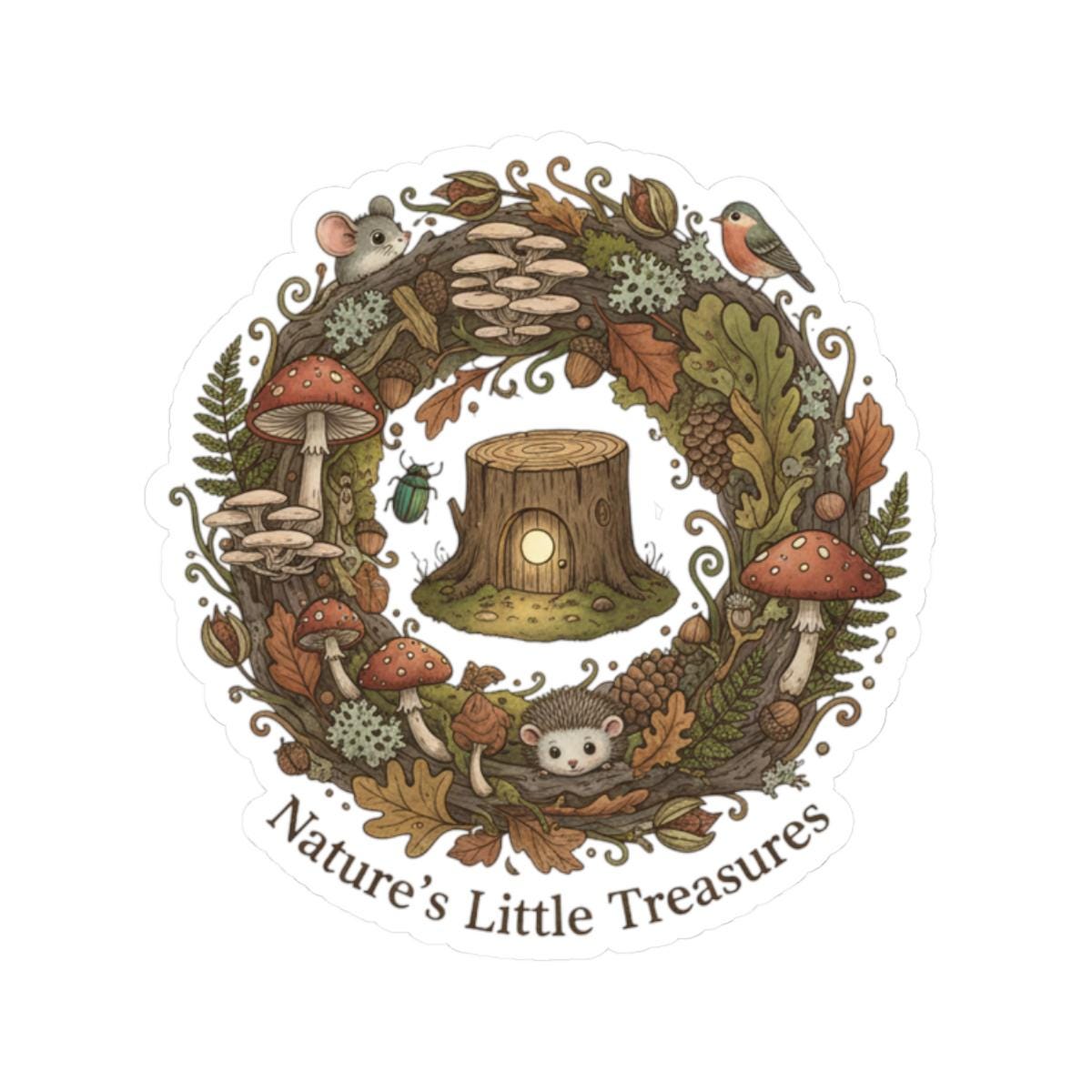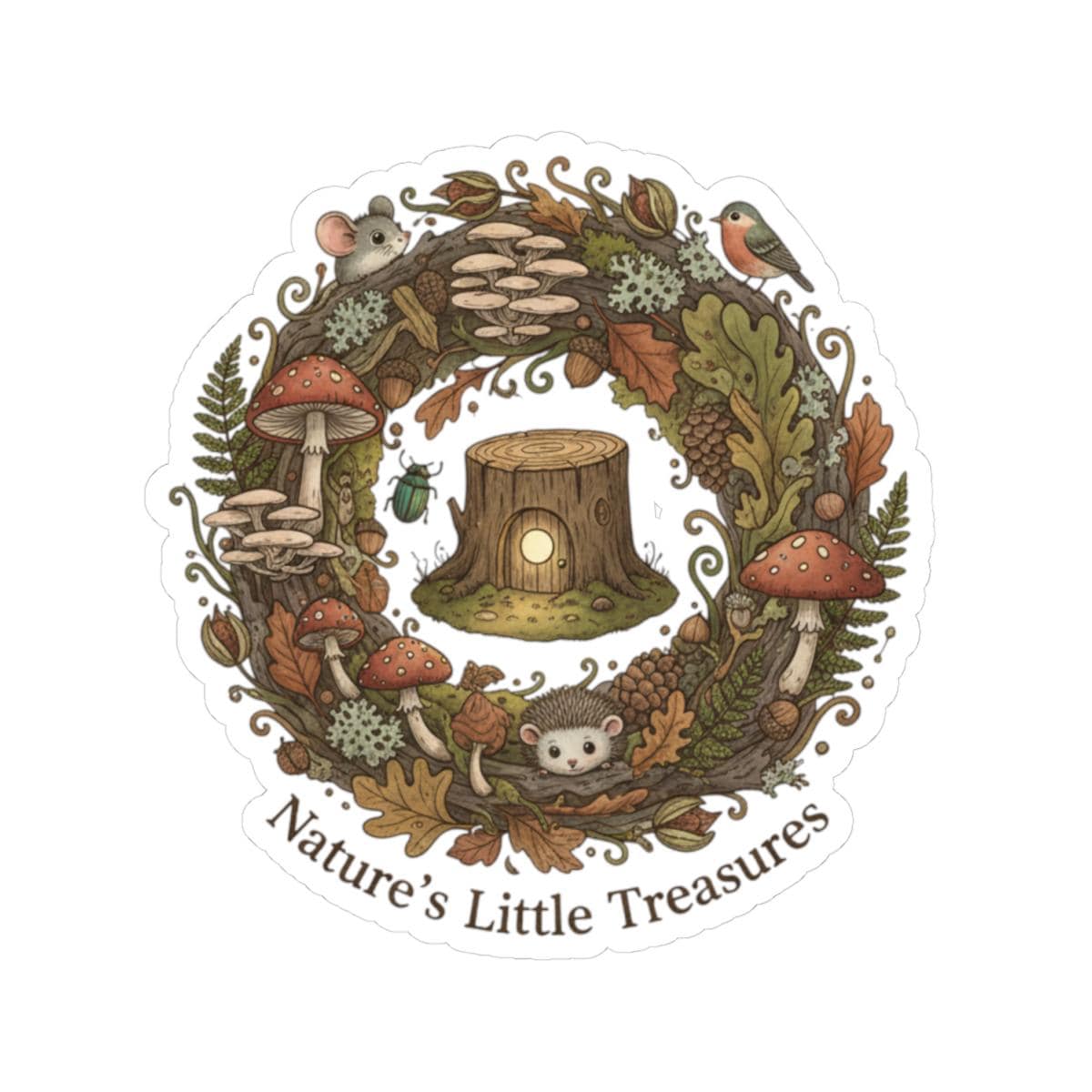 A tiny, earthy sticker featuring a warm woodland wreath of mushrooms, leaves, acorns and a little stump—rendered in soft muted greens, rusts and cream. The hand-drawn, cottagecore-to-goblincore illustration reads as a quiet celebration of found-nature treasures and fits into micro-niche aesthetics like goblincore and mushroom aesthetic, adding a subtle lo-fi charm to personal items without large text or branding.