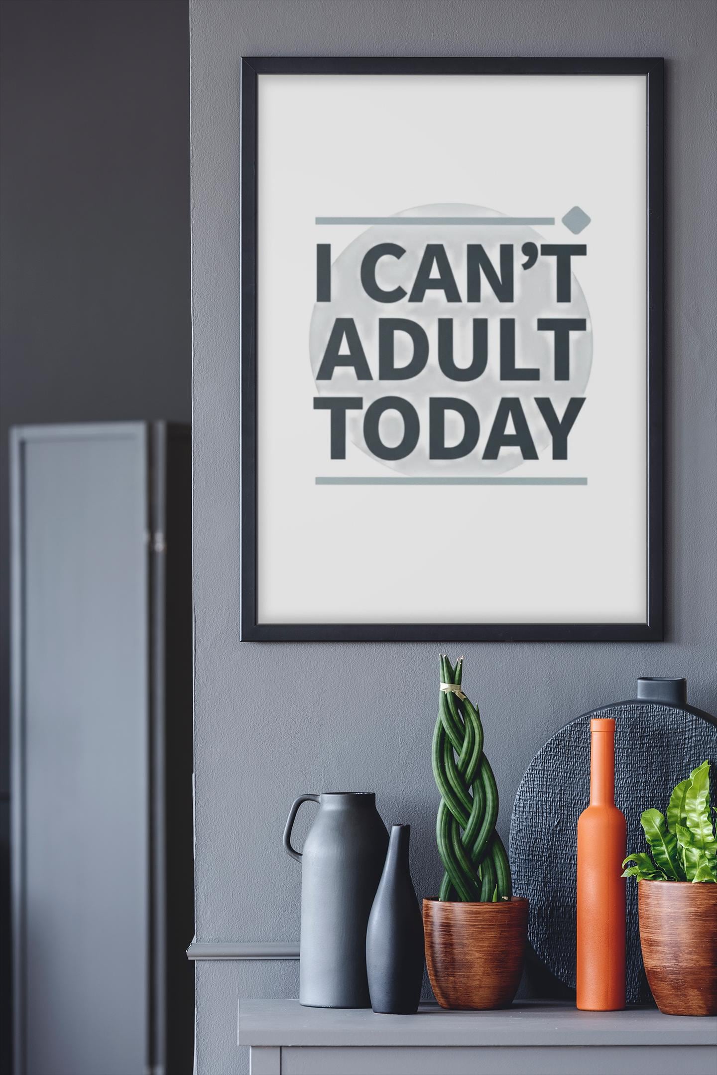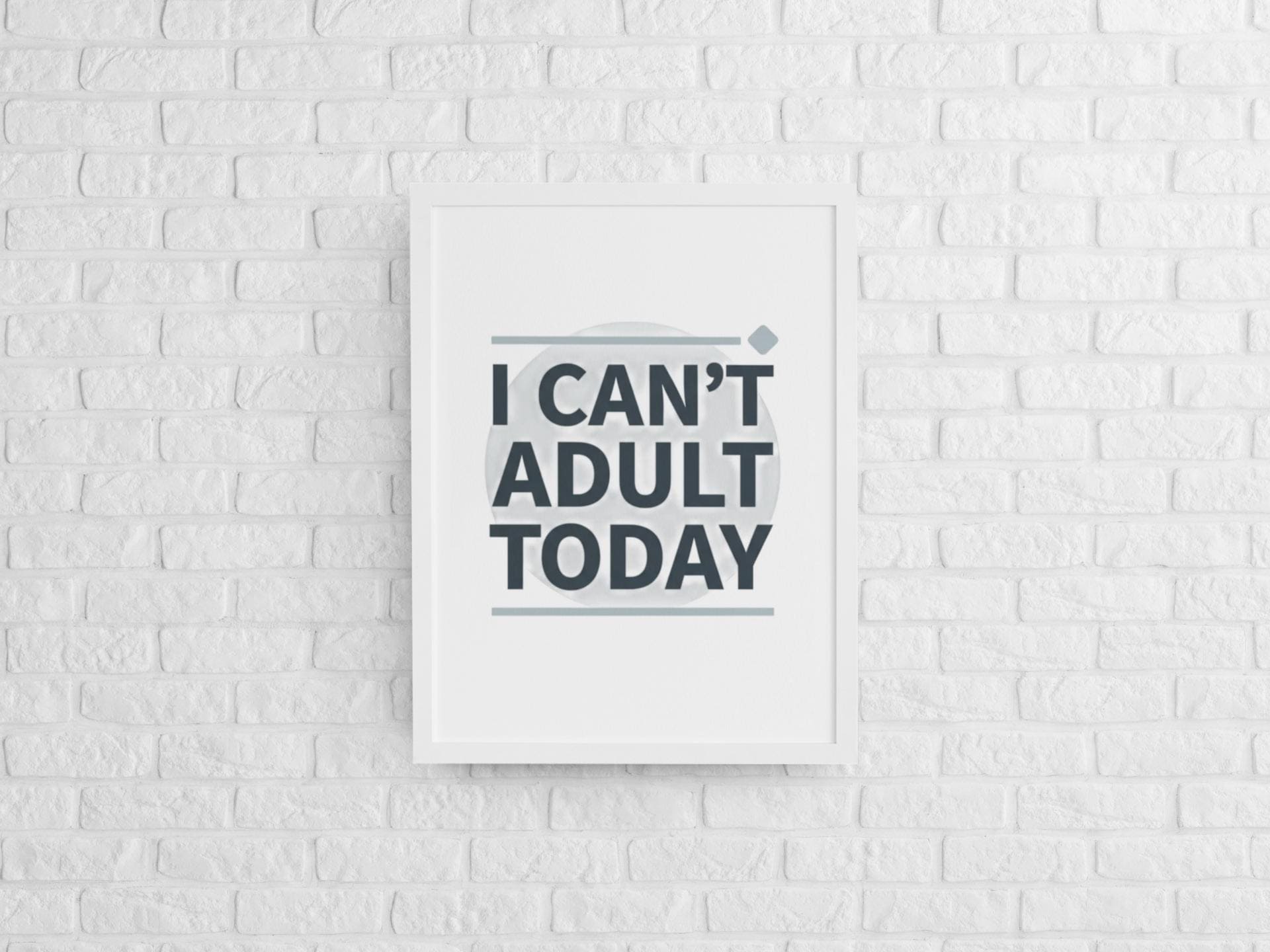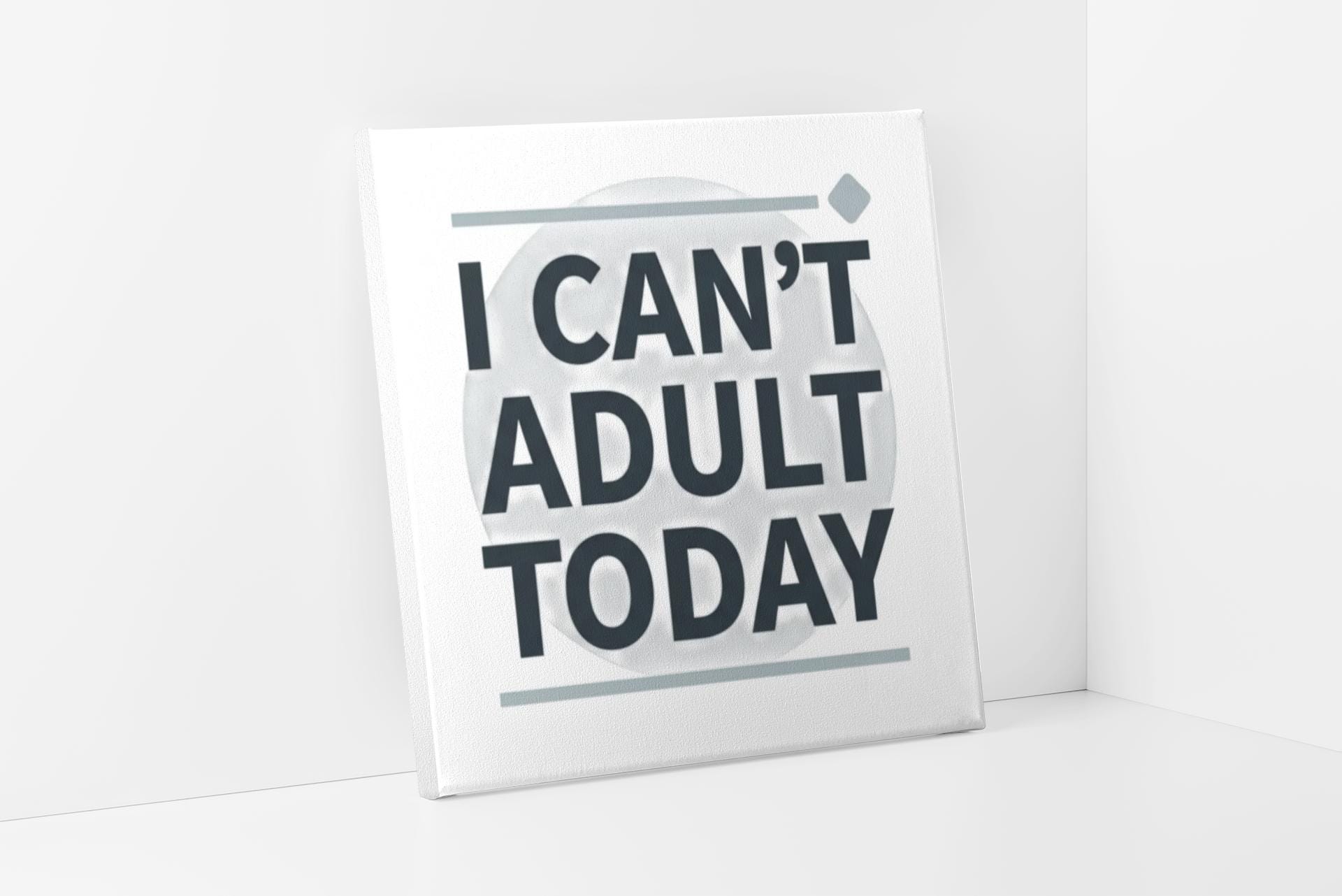 Minimal, deadpan wall art that leans into sarcastic, self-deprecating humor — bold condensed type reads “I CAN’T ADULT TODAY” centered against a high-contrast neutral background. The design uses a utilitarian sans layout and subtle geometric accents to keep focus on the short, meme-ready statement. Sized and stretched on matte canvas, it fits into casual home offices, dorms, or lounges where buyers want a quiet, ironic nod to everyday exhaustion and introvert energy.