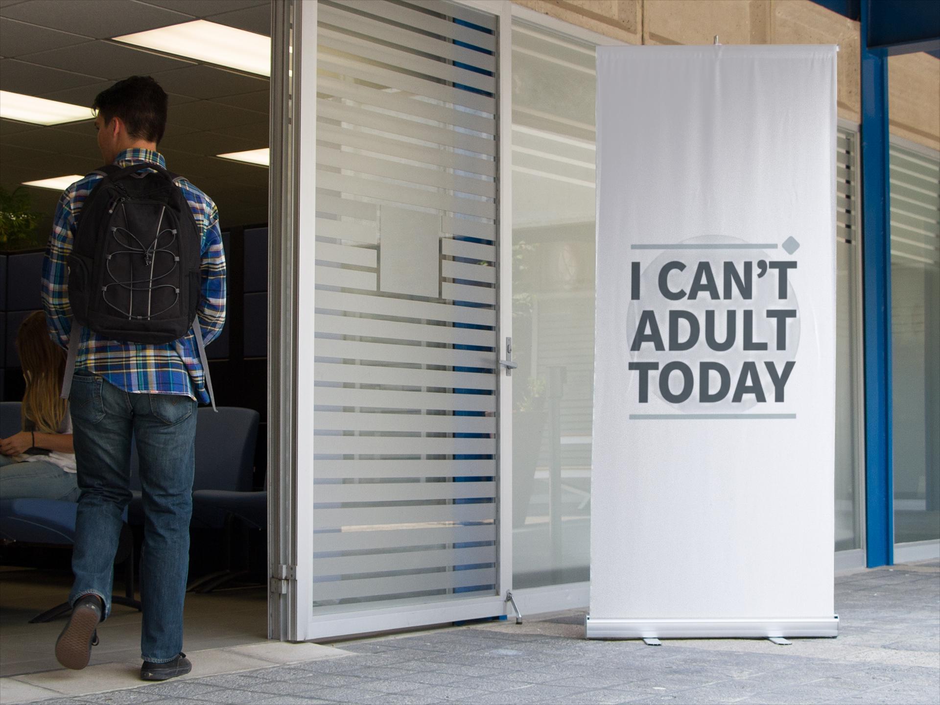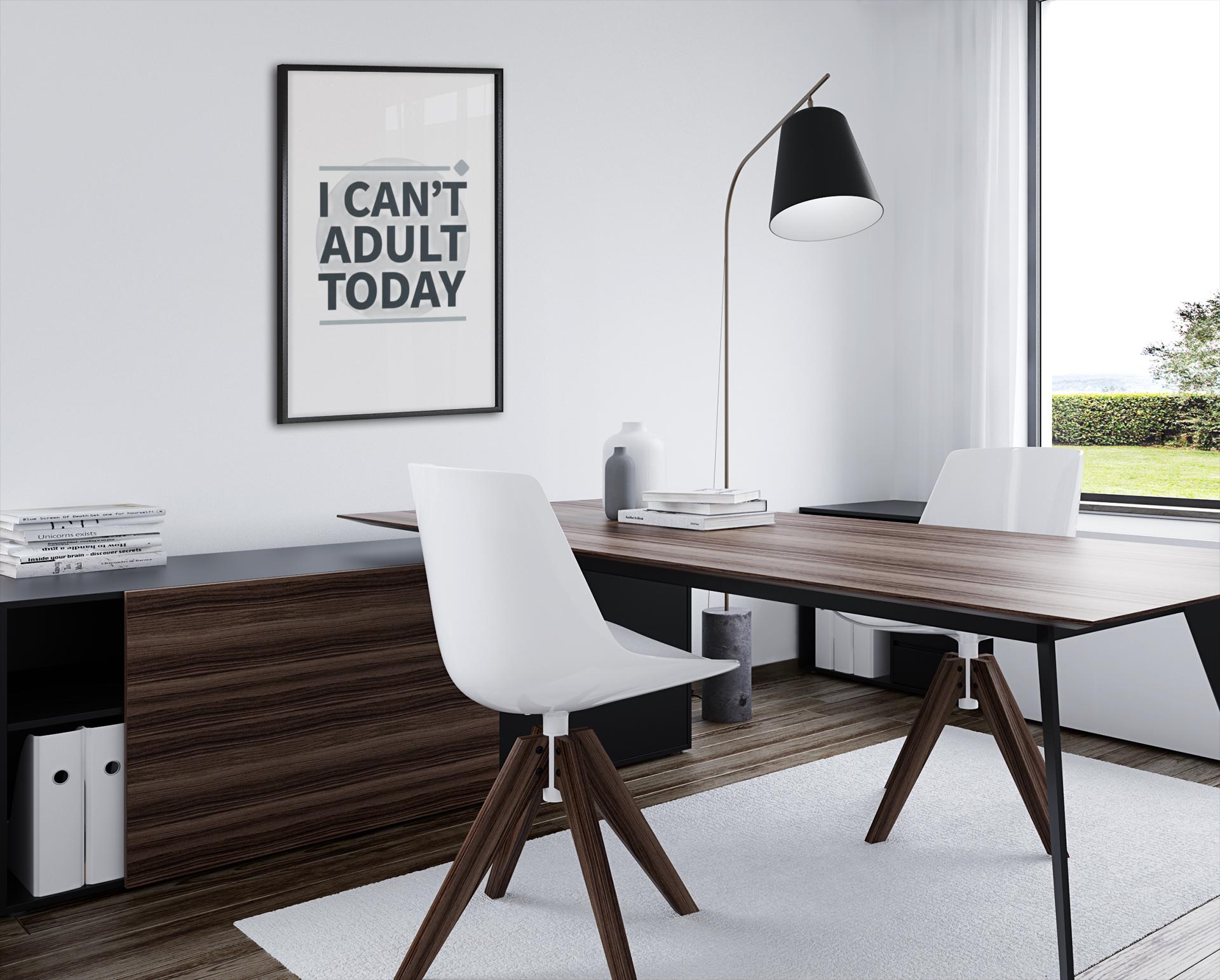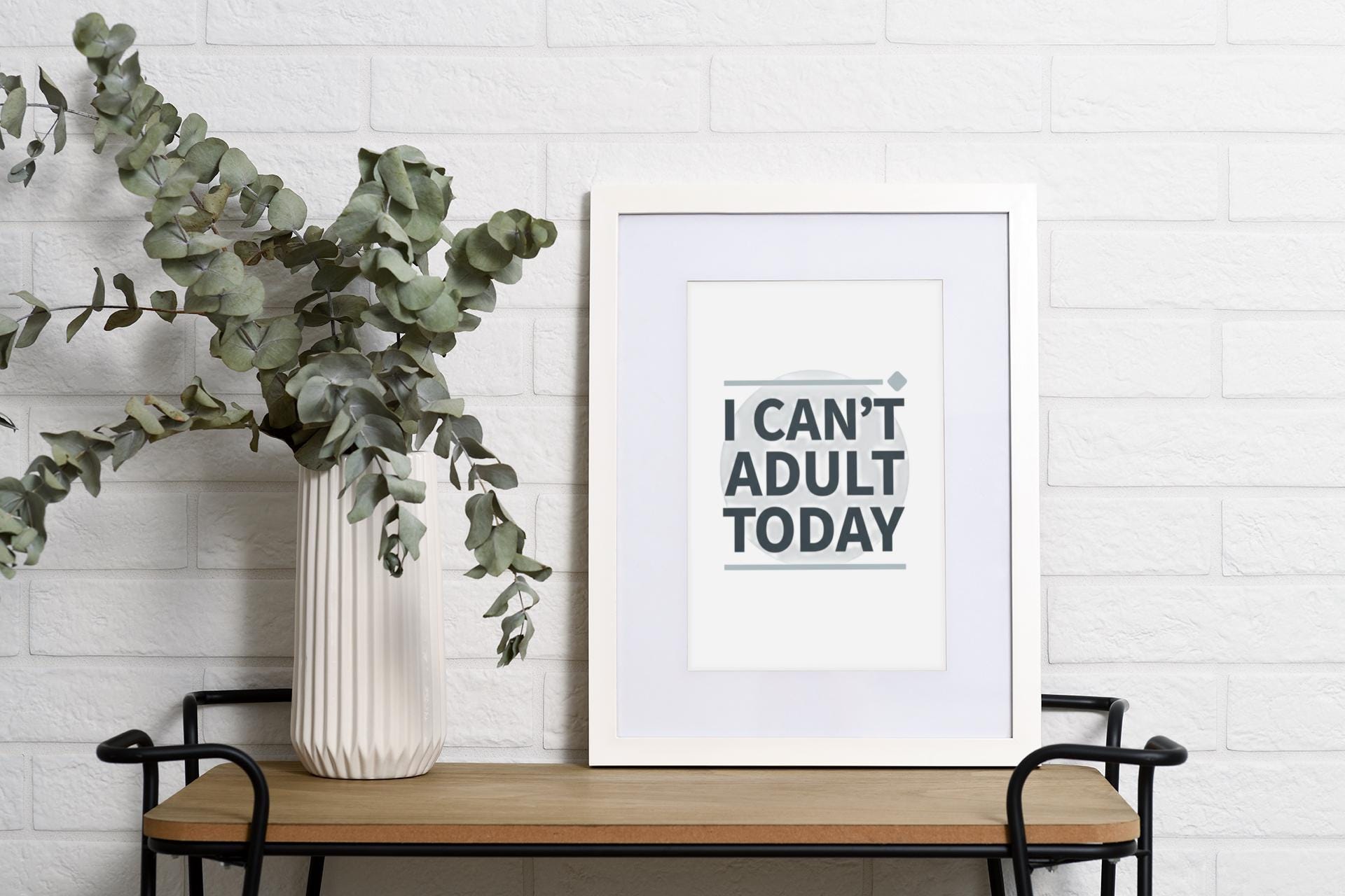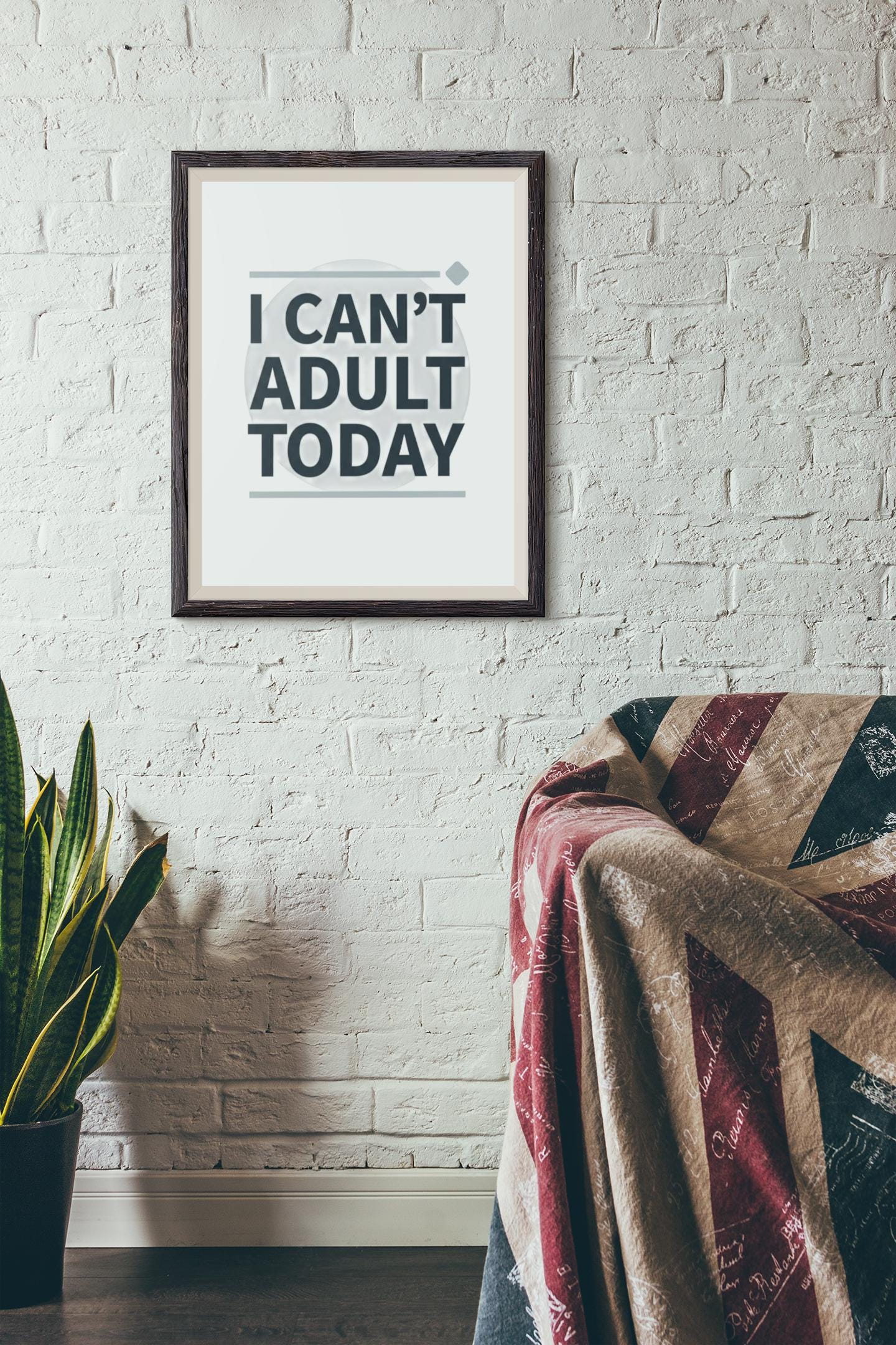 Minimal, deadpan wall art that leans into sarcastic, self-deprecating humor — bold condensed type reads “I CAN’T ADULT TODAY” centered against a high-contrast neutral background. The design uses a utilitarian sans layout and subtle geometric accents to keep focus on the short, meme-ready statement. Sized and stretched on matte canvas, it fits into casual home offices, dorms, or lounges where buyers want a quiet, ironic nod to everyday exhaustion and introvert energy.