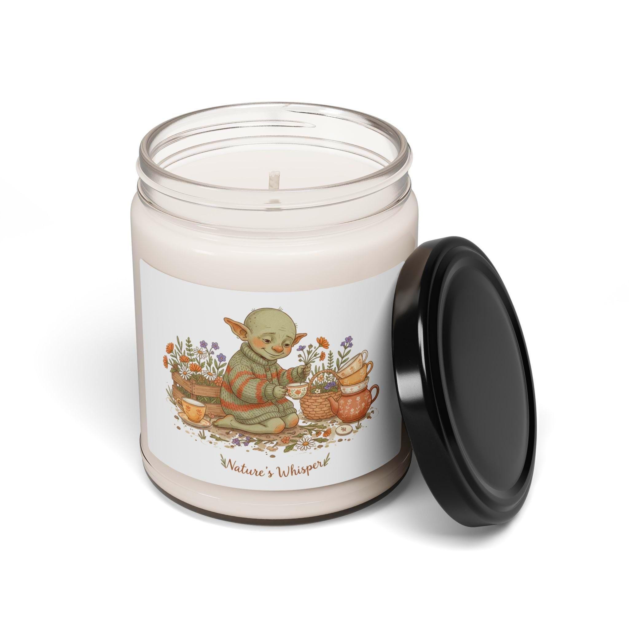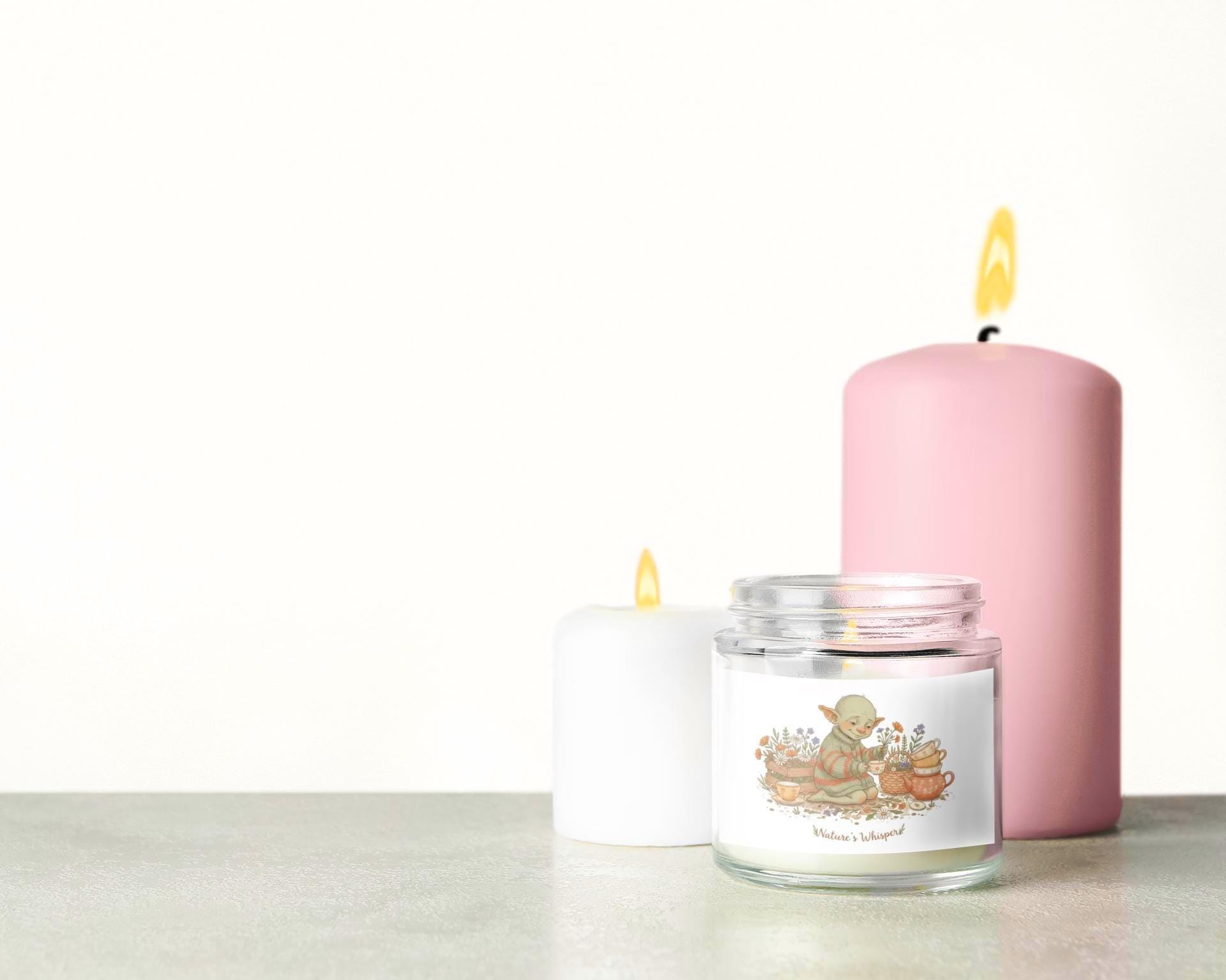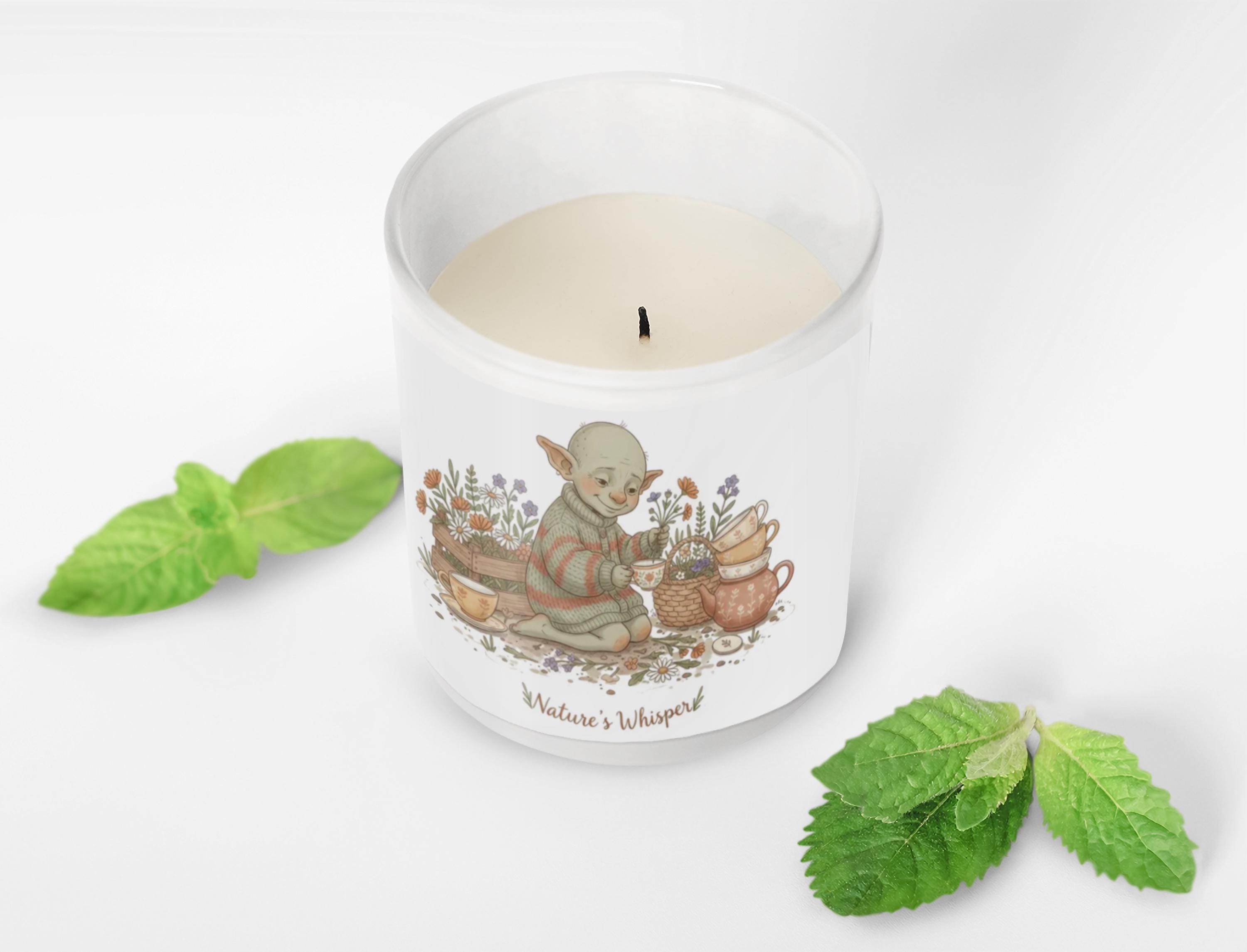 Soft, earthen candle with a whimsical woodland helper illustration and gentle aromatics tuned to goblincore and cottagecore sensibilities. The artwork leans into mossy greens, warm terracotta, and hand-drawn linework, pairing a cozy, slightly mischievous mood with comforting home fragrance. Friendly for shelf displays or quiet evenings, the piece reads as an intimate, aesthetic object for collectors who enjoy small, story-rich accents in their space.