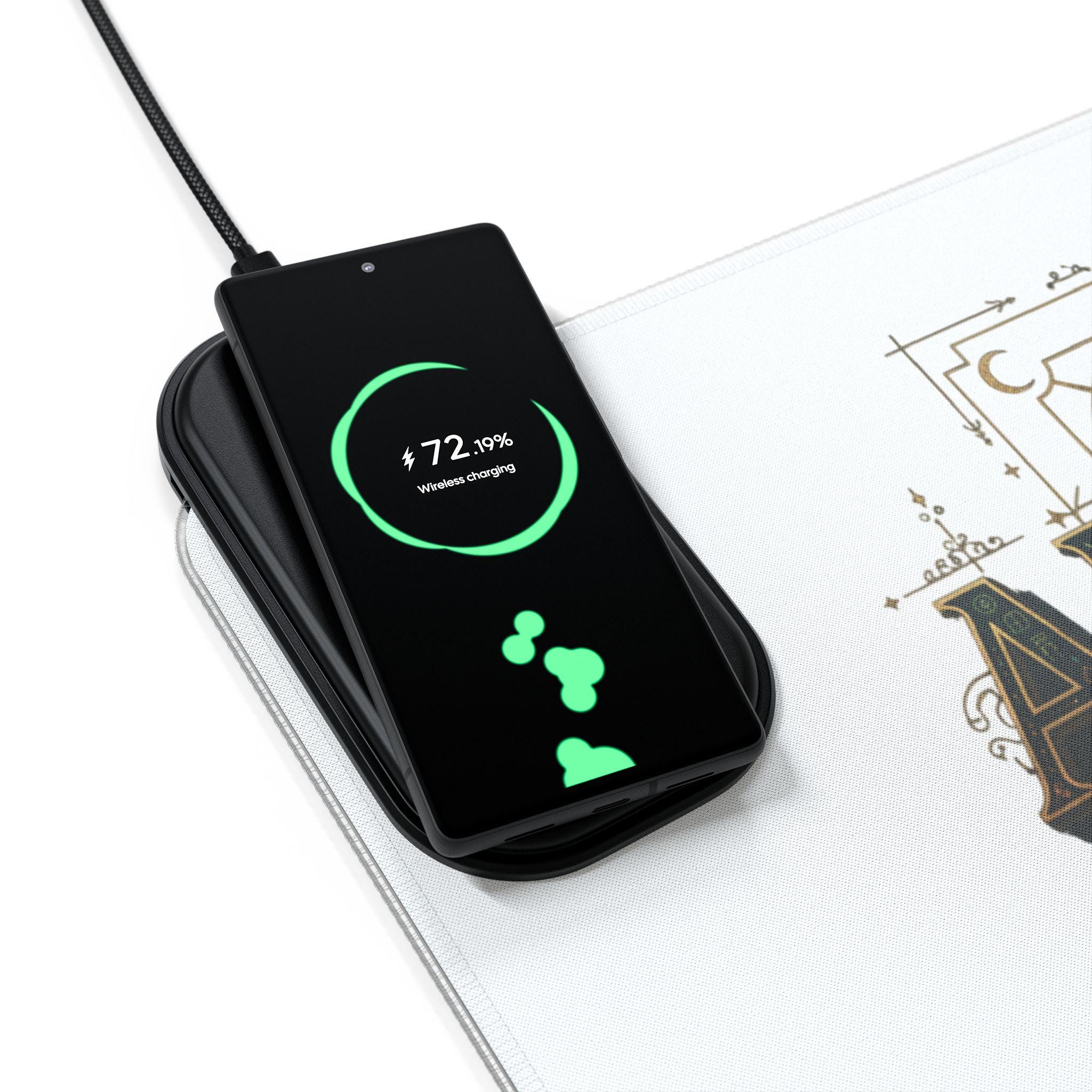 Bright, immersive desk accessory that doubles as a wireless charging station and ambient light source. The large mouse pad surface is printed with a bold alchemy motif, giving your setup a mysterious, artisanal vibe while providing a smooth tracking surface for mice. Edge RGB and multi-mode LED effects create motion and color to match focus sessions, late-night raids, or creative flow. The built-in 15W Qi wireless charger sits within easy reach for phones and Qi-compatible devices, so cables stay tucked away and your workspace feels intentionally curated. Durable polyester top and anti-slip rubber base keep everything steady through fast mouse swipes and everyday use. Available in multiple sizes to fit compact desks or extended gaming battlestations.