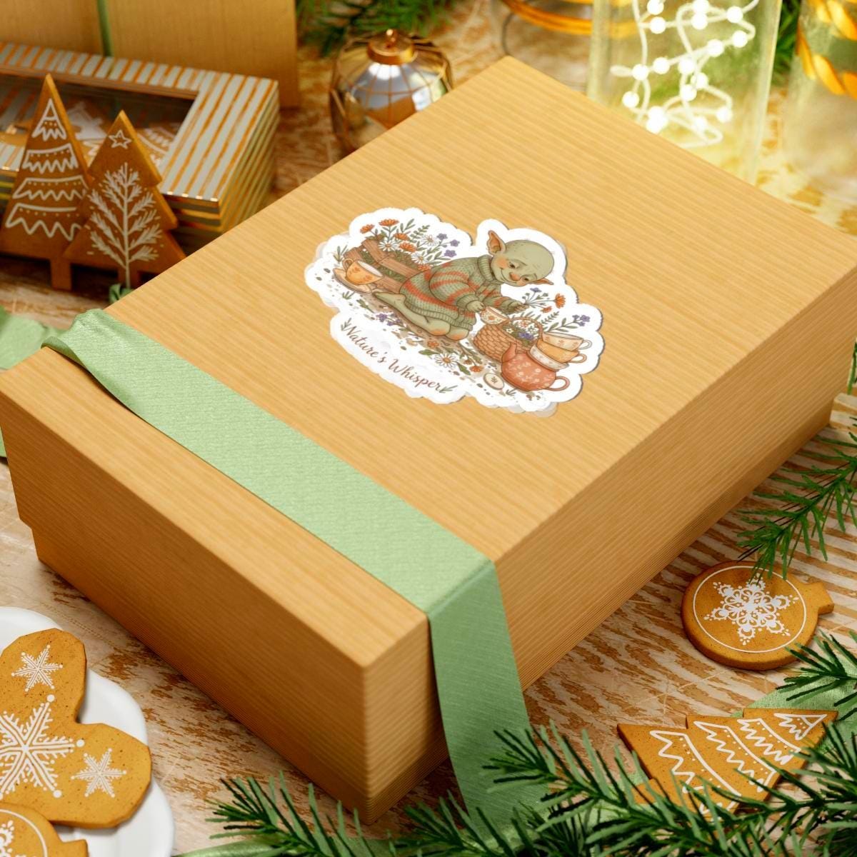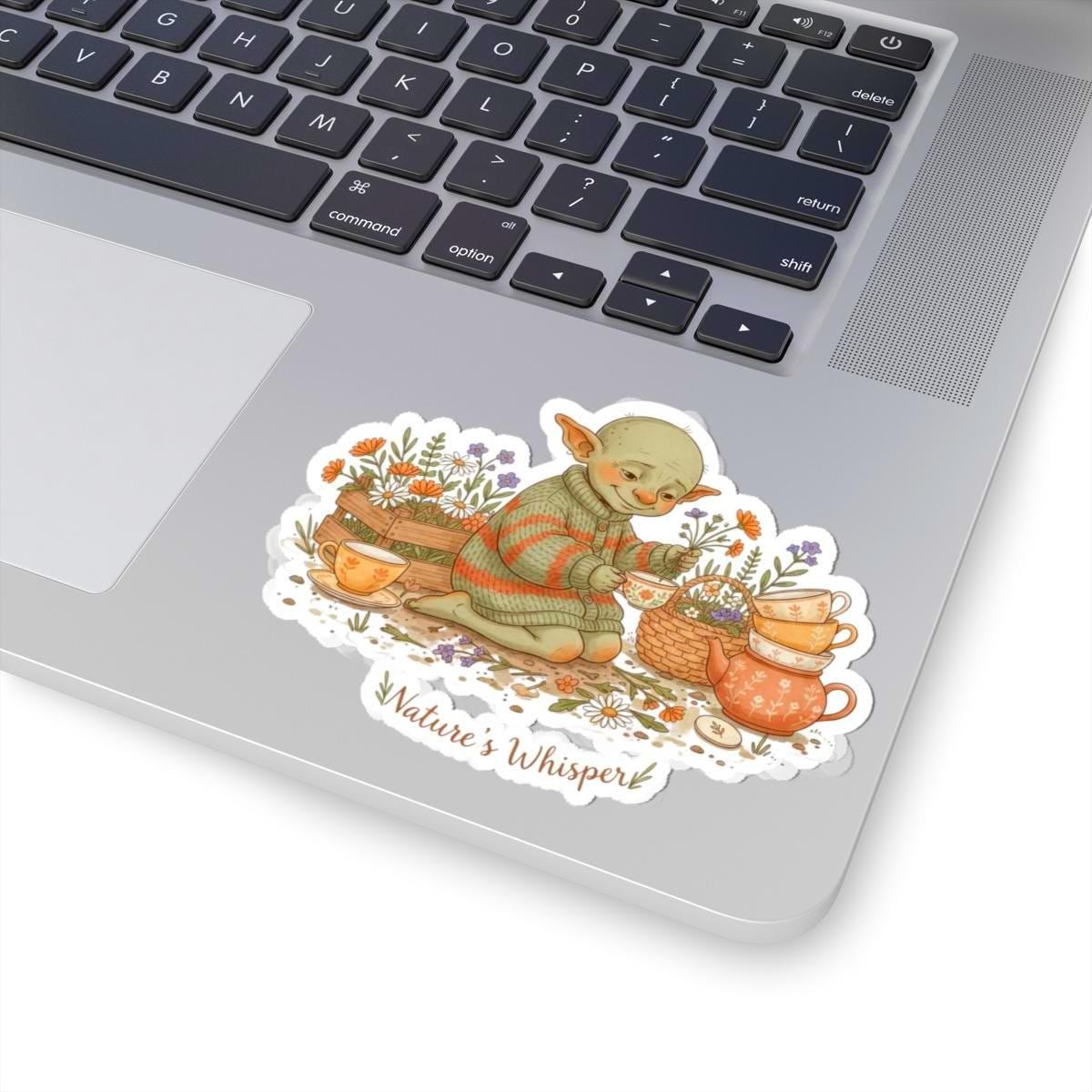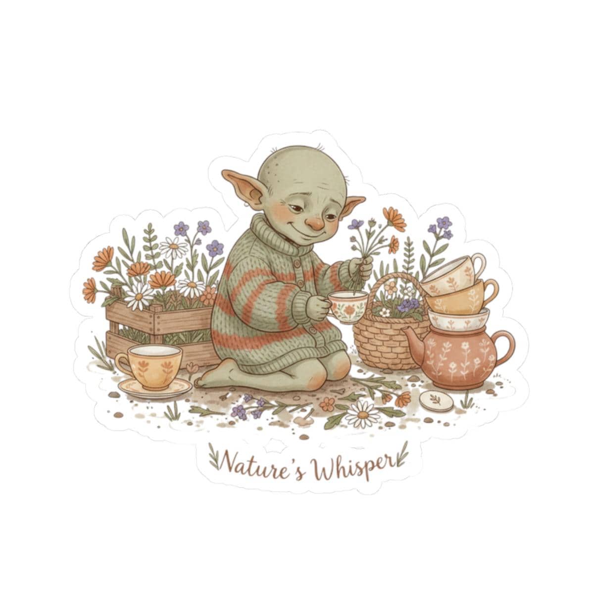 A soft, earthy sticker depicting a small, content goblin-like creature tending a cozy tea scene among wildflowers and mushrooms. The muted pastel palette, delicate linework, and gentle hand-lettered caption evoke goblincore and cottagecore moods—quiet, whimsical, and intimate—making it a subtle accent for laptops, journals, or indoor decor. The art reads as a mood piece for aesthetic collectors who favor lo-fi, nature-forward motifs and sincere visual storytelling.