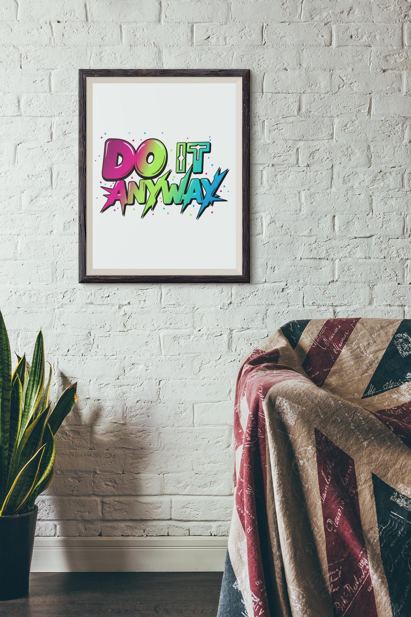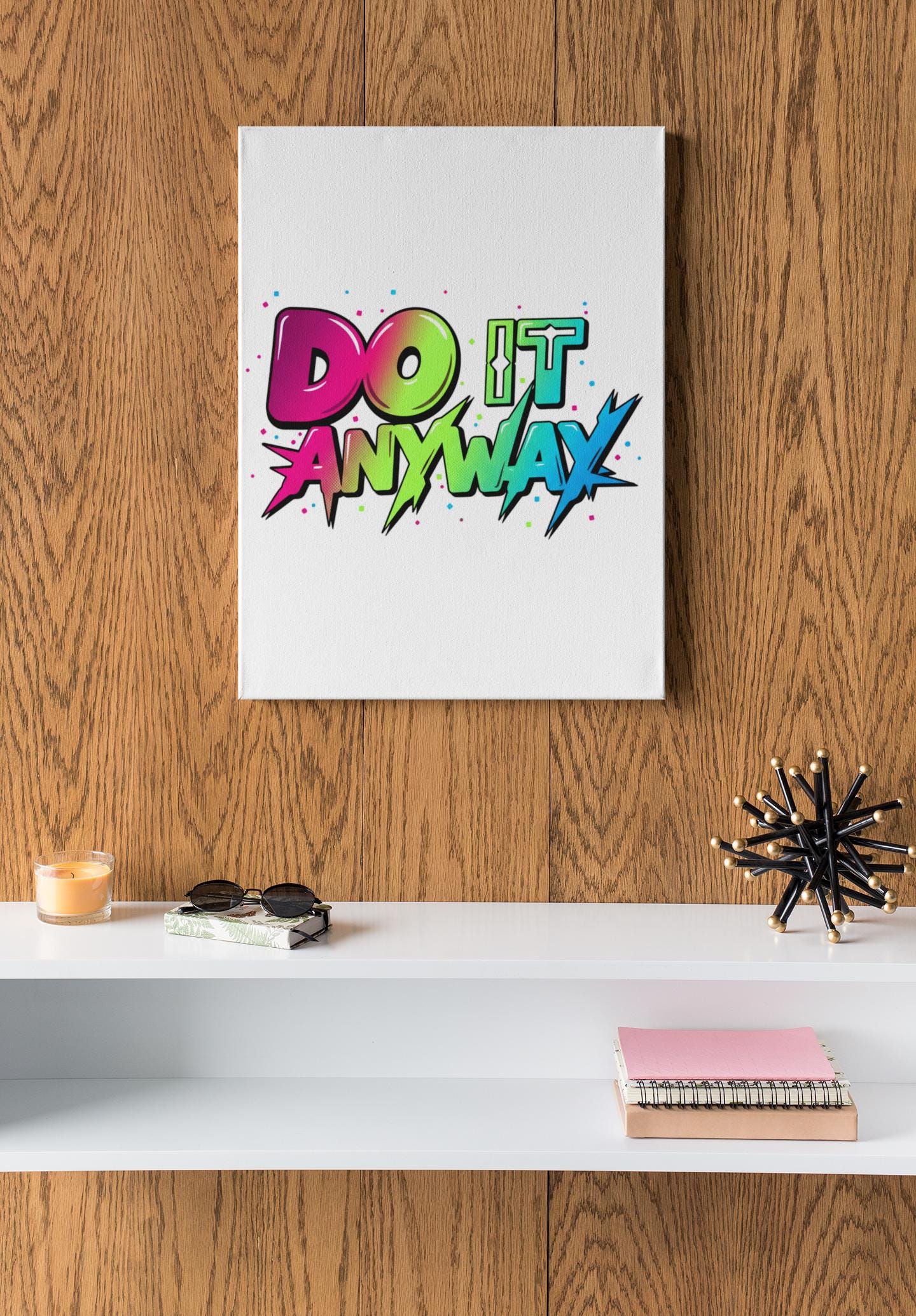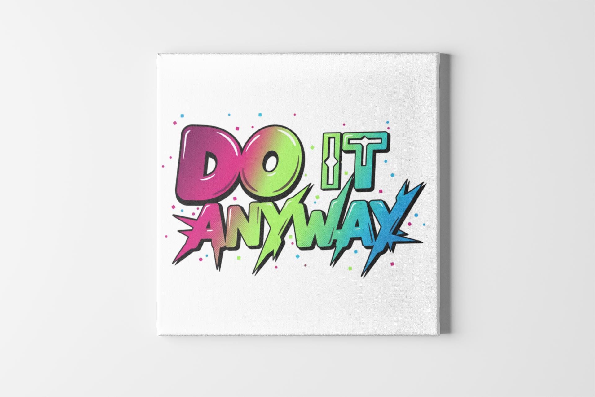 Vivid stacked typography bursts across a clean matte canvas — saturated, mixed-font lettering reads as a wearable-poster for loud optimism. The bold, color-blocked type uses energetic gradients and graphic spikes to capture the maximalist typography trend’s dopamine-driven punch, positioned centrally on a crisp white field to amplify contrast and visual impact. This stretched canvas fits modern, statement-focused spaces where type-driven art functions as bold wall expression.