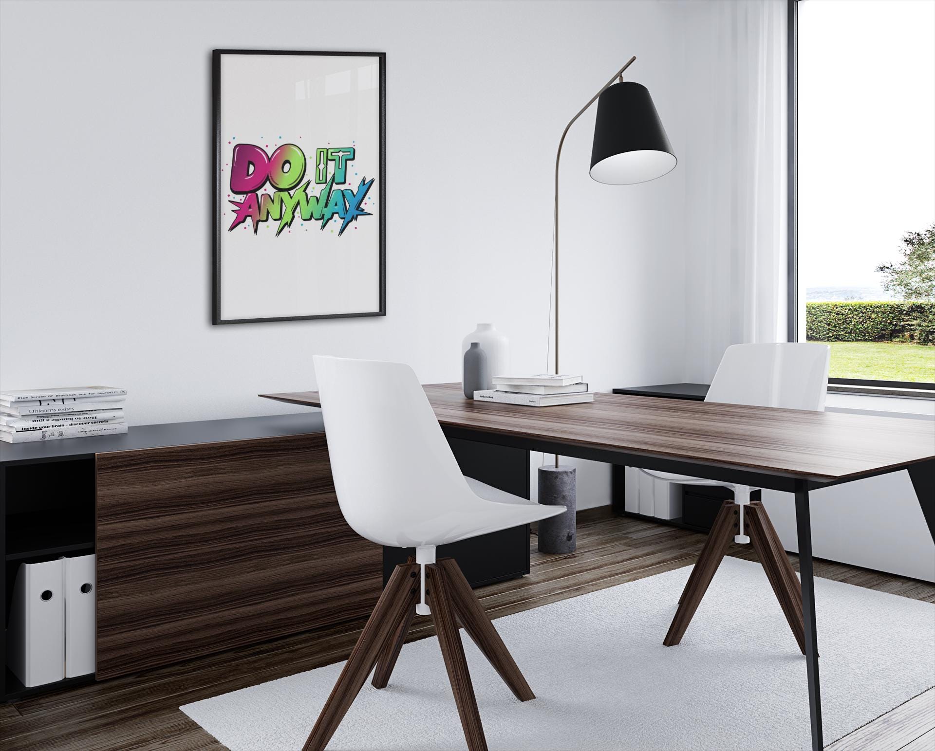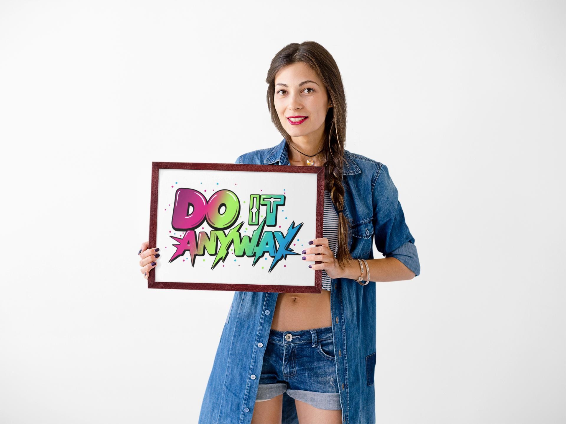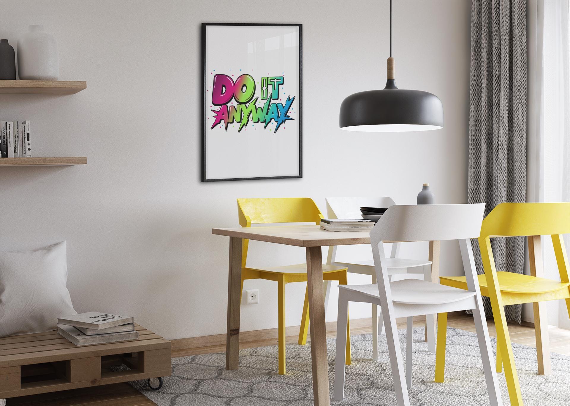 Vivid stacked typography bursts across a clean matte canvas — saturated, mixed-font lettering reads as a wearable-poster for loud optimism. The bold, color-blocked type uses energetic gradients and graphic spikes to capture the maximalist typography trend’s dopamine-driven punch, positioned centrally on a crisp white field to amplify contrast and visual impact. This stretched canvas fits modern, statement-focused spaces where type-driven art functions as bold wall expression.