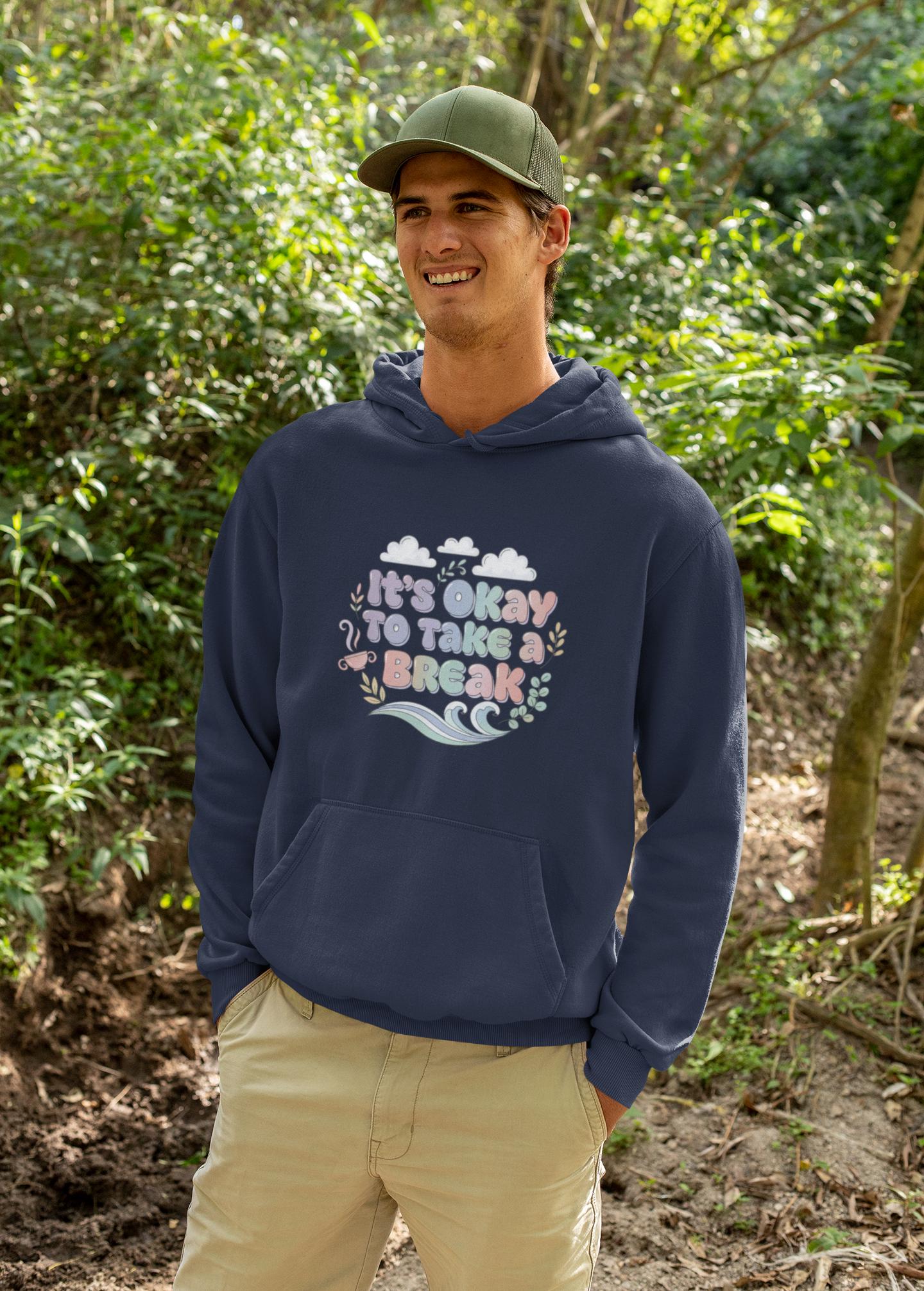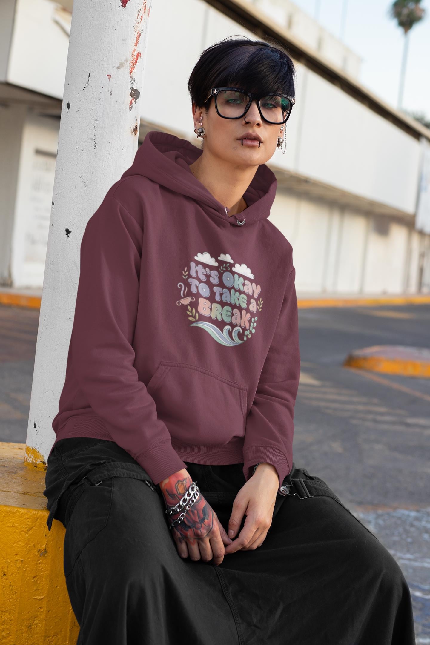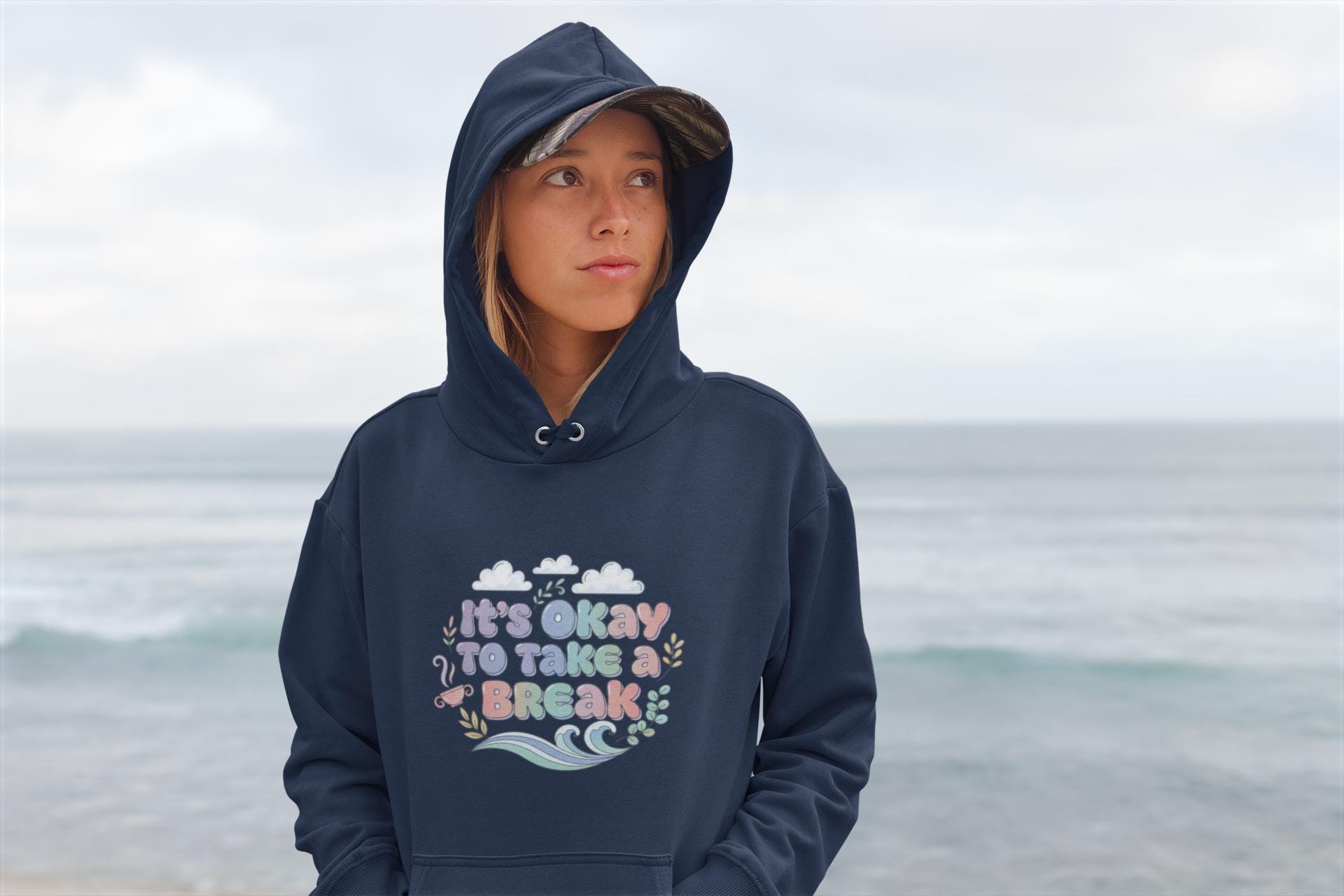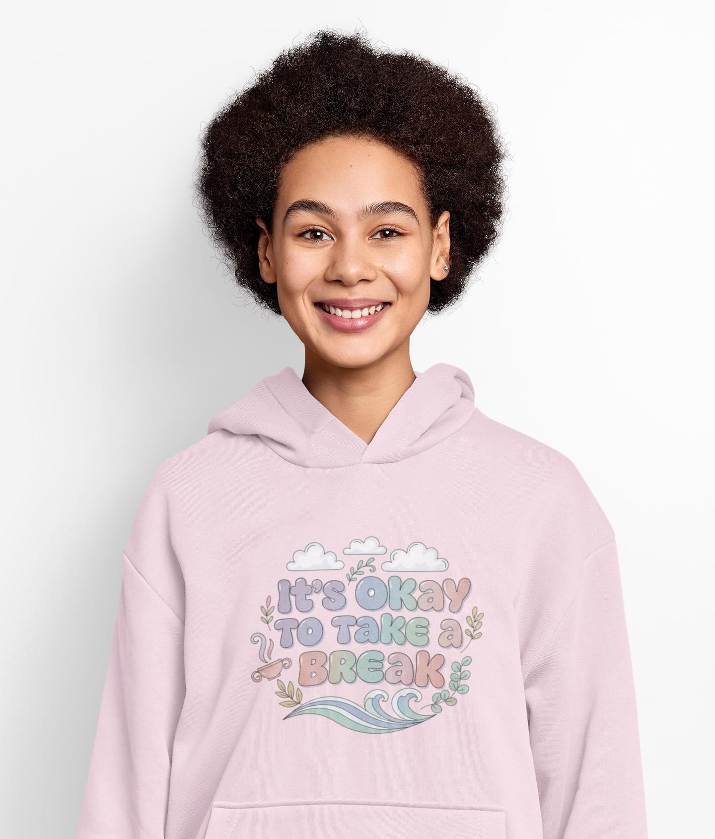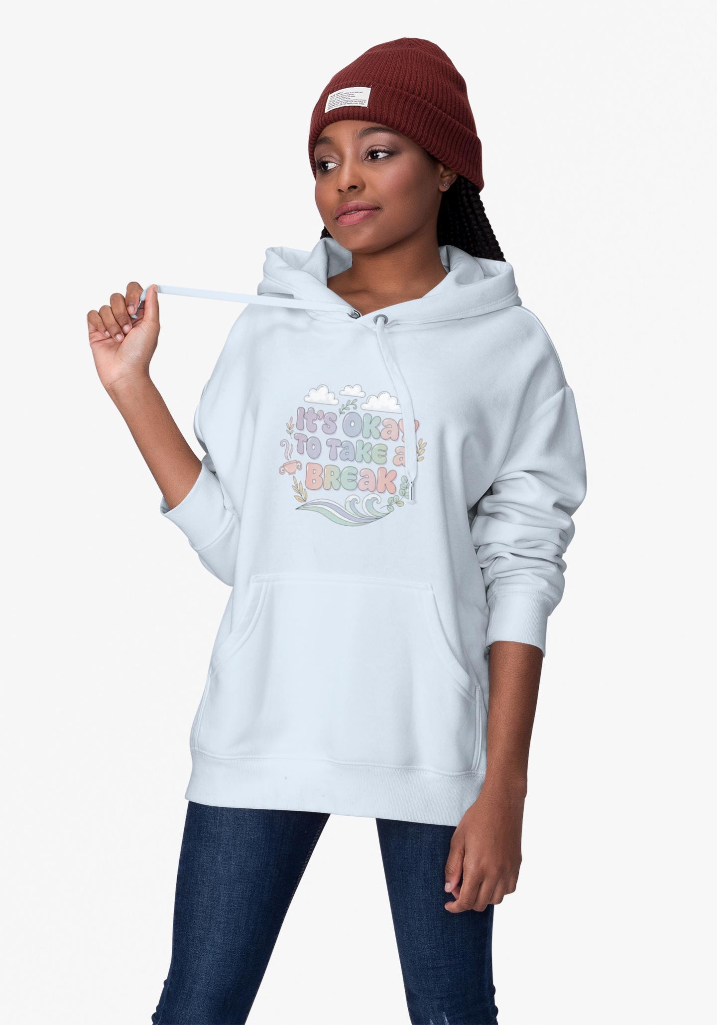Soft pastel hoodie with a small, centered affirmation that acknowledges overwhelm and gives quiet permission to rest. The artwork uses rounded, approachable lettering and soothing colors to fit burnout & mental health conversations — wearable as a gentle reminder to set boundaries and prioritize self-care during study sessions, creative work, or low-key days at home.