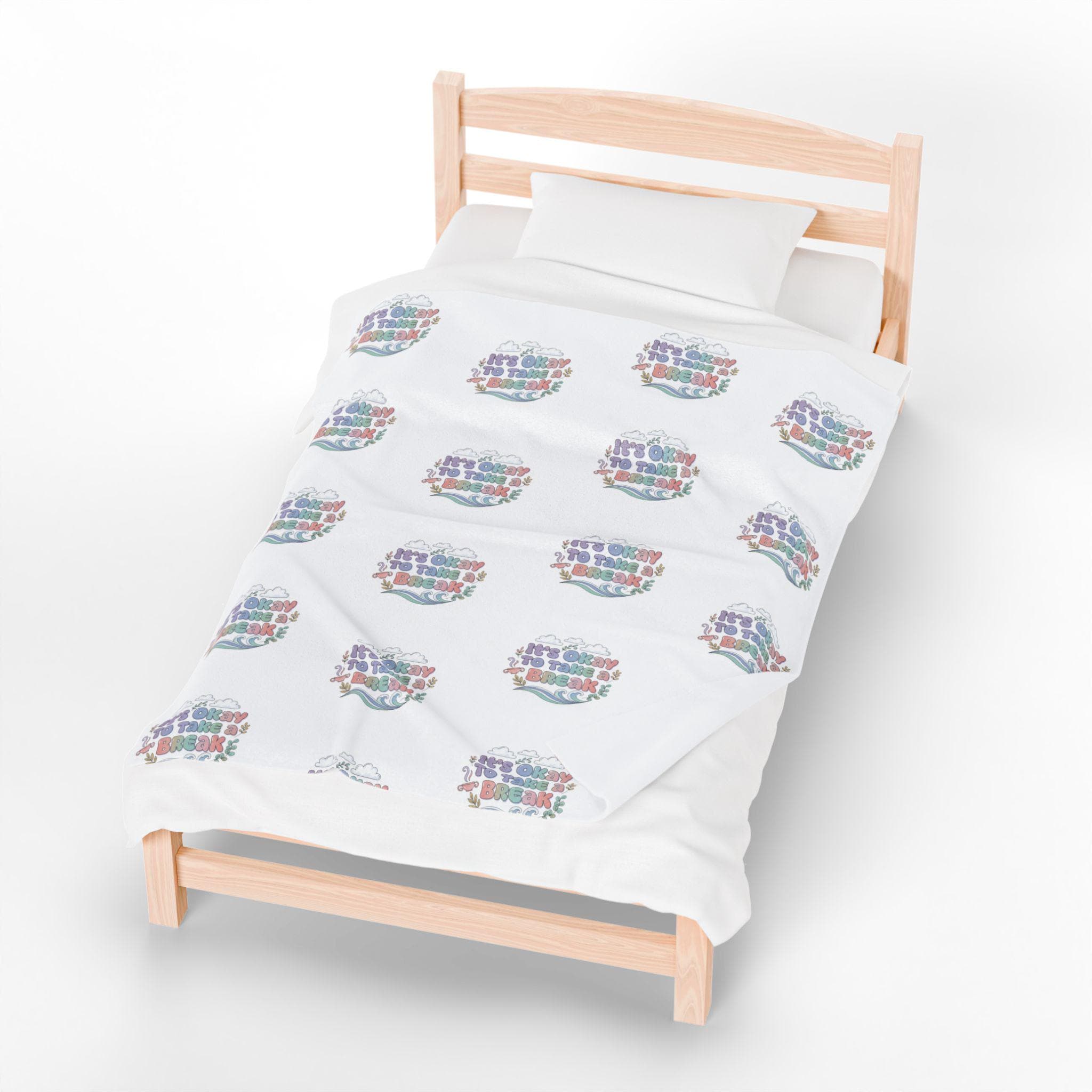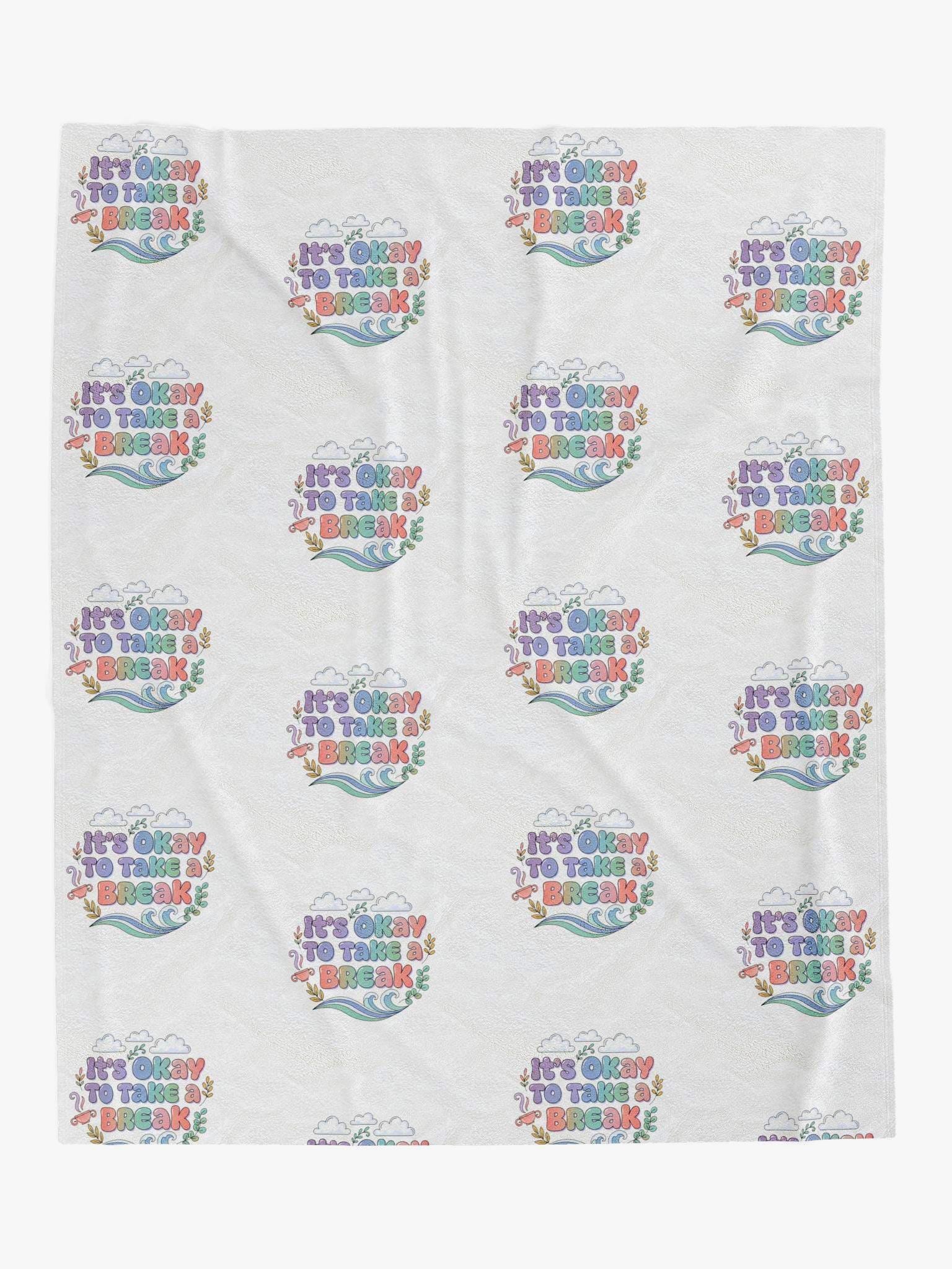 A soft, pastel-printed velveteen blanket featuring a rounded, reassuring affirmation—’It’s okay to take a break’—framed by gentle waves, clouds, and foliage. The low-contrast, calming palette and approachable lettering match anti-hustle and mental-health-aware wardrobes, offering a tactile reminder to pause and protect your energy during study sessions, studio breaks, or quiet evenings. Designed for people practicing self-care, boundary-setting, and gentle productivity, it reads like a portable comfort cue for students, caregivers, and creatives.