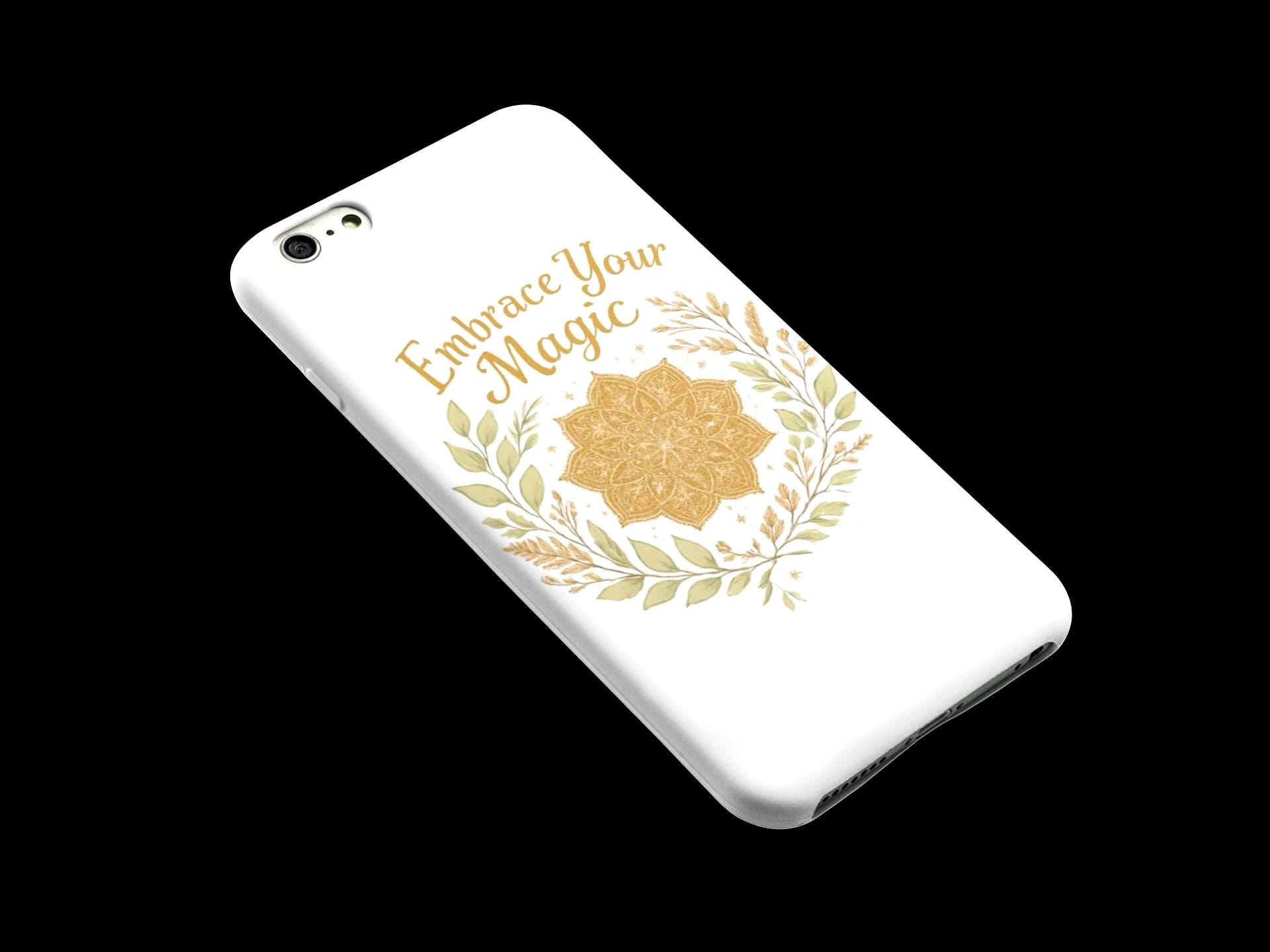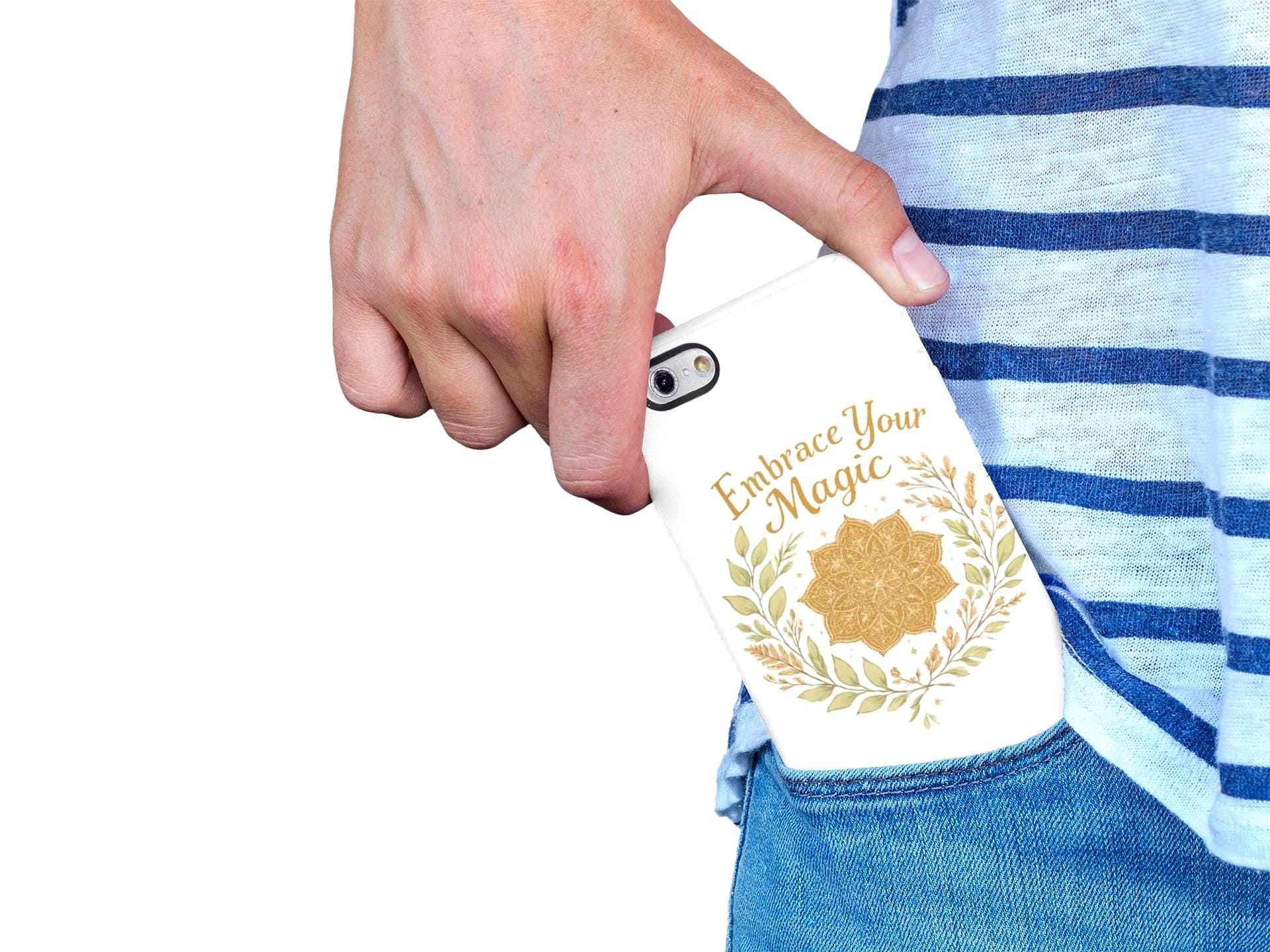 This impact-resistant phone case wraps your device in a calm, earthy design that whispers quiet confidence. A soft white background showcases an ornate golden mandala framed by olive and wheat-toned foliage, topped with the gentle script “Embrace Your Magic.” The dual-layer construction — a rigid polycarbonate shell with a cushioned TPU inner liner — absorbs shocks and guards against scratches while keeping the print vivid with full-wrap, photo-quality color. Interior magnets add MagSafe® compatibility so the case works with Apple’s magnetic accessories. Lightweight and durable, it slides into daily life with understated charm and a touch of spiritual warmth.