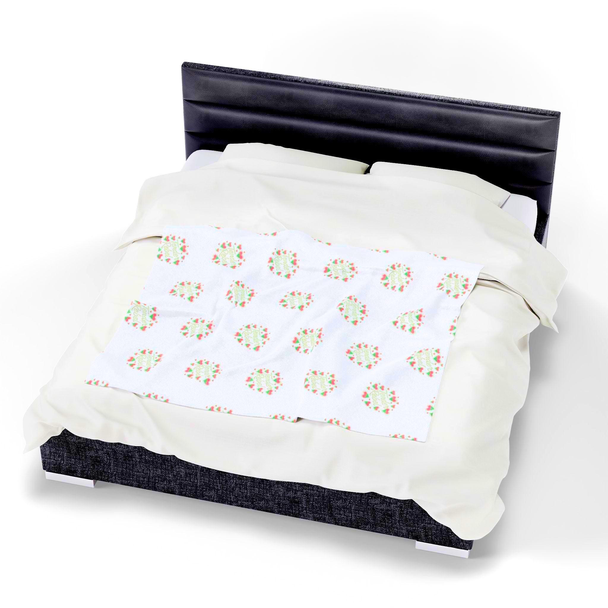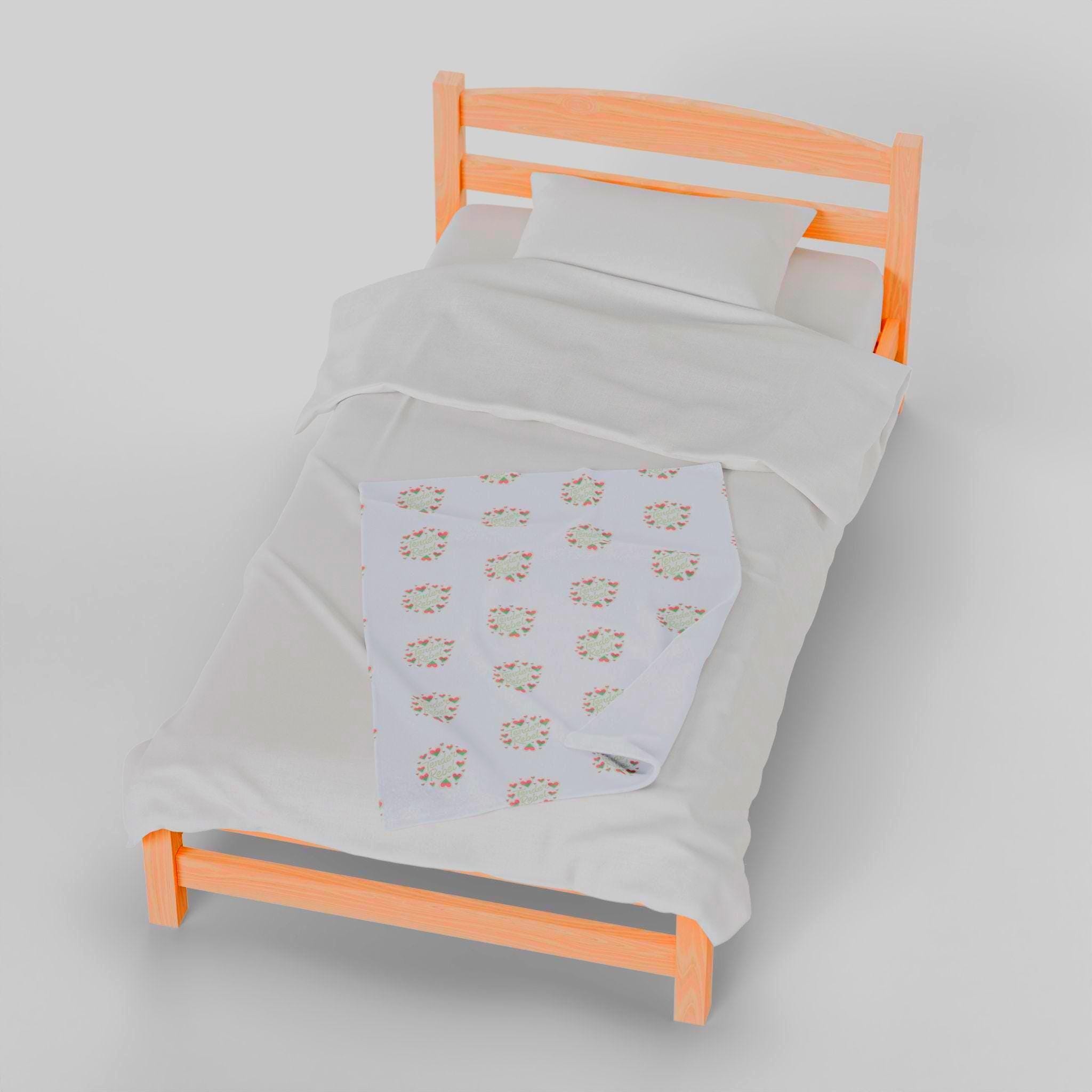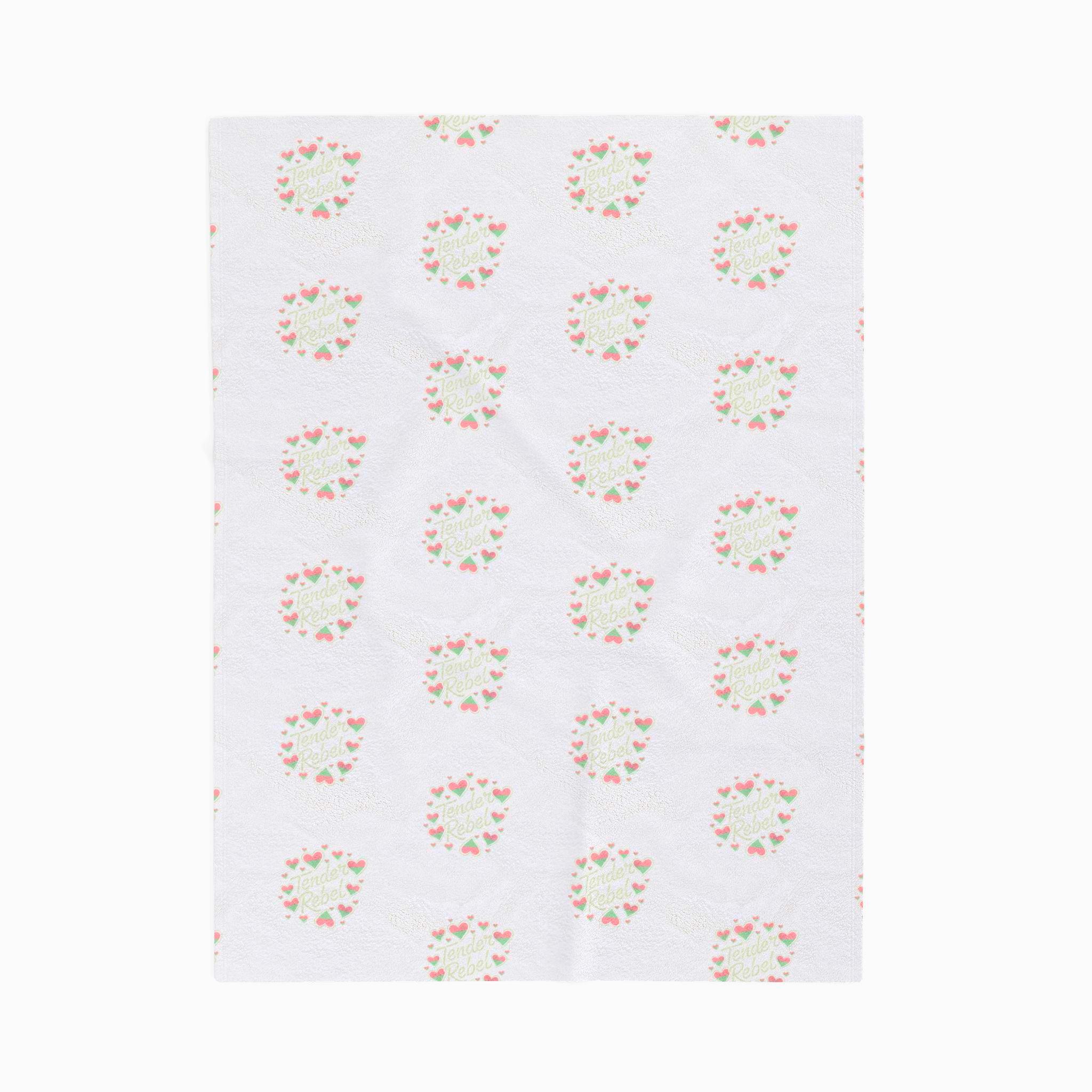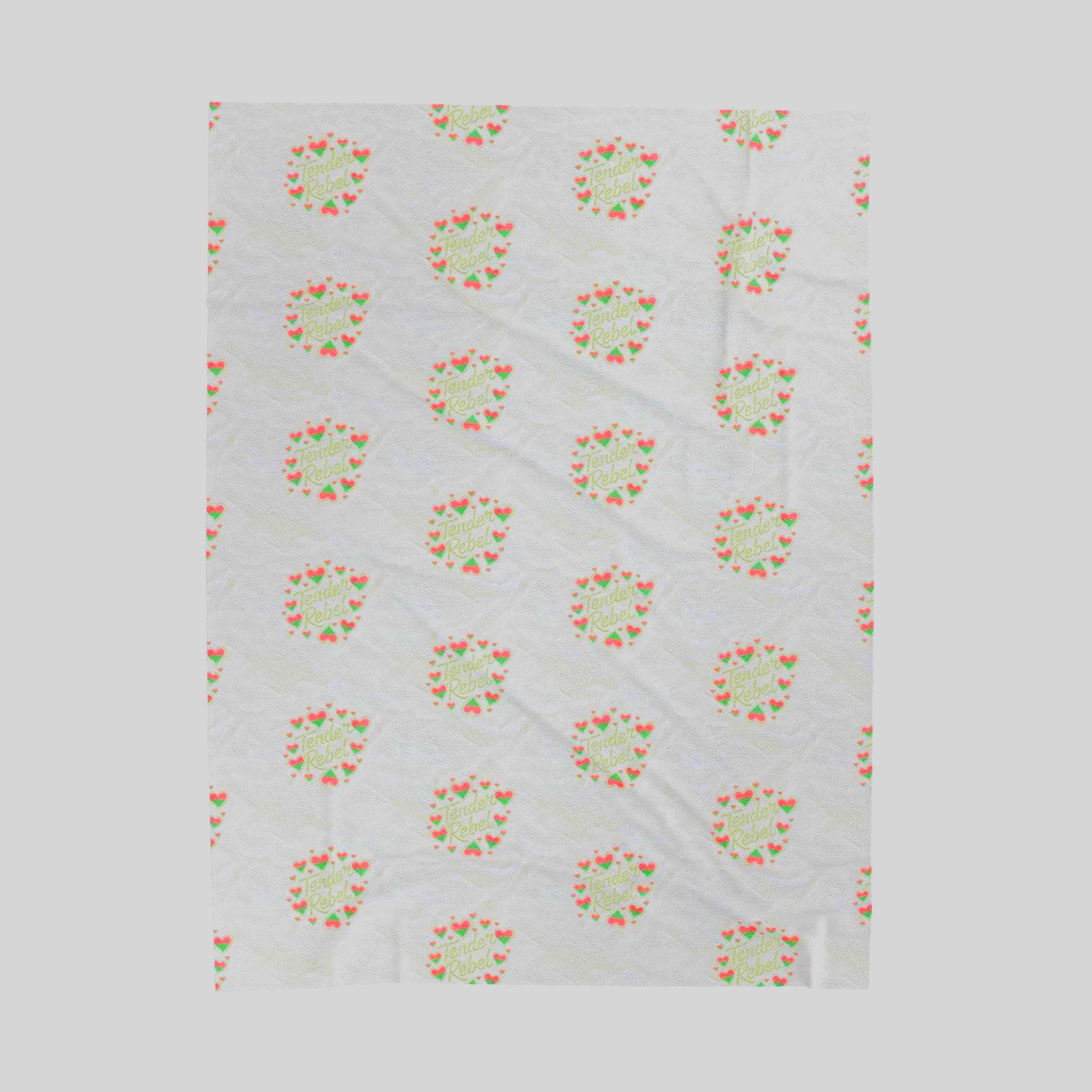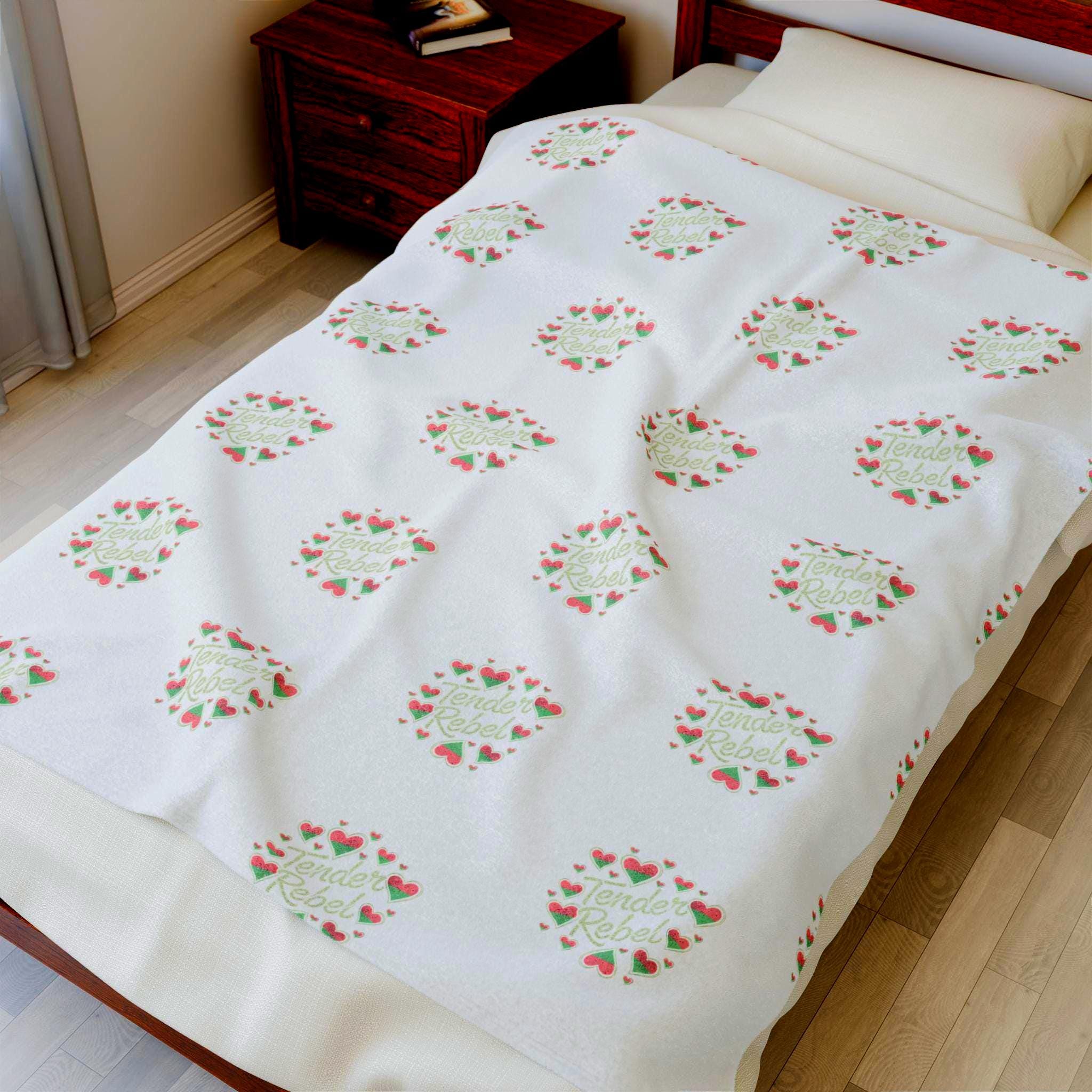 A soft velveteen blanket with a tender-defiant heart collage: distressed pink and mint hearts circle hand-lettered “Tender Rebel” for a soft grunge take on romantic motifs. The one-sided, high-detail print sits on a moody-but-supple white velveteen ground, blending worn-texture vibes with affectionate edge for alt-aesthetic, punk-adjacent wardrobes and cozy spaces.