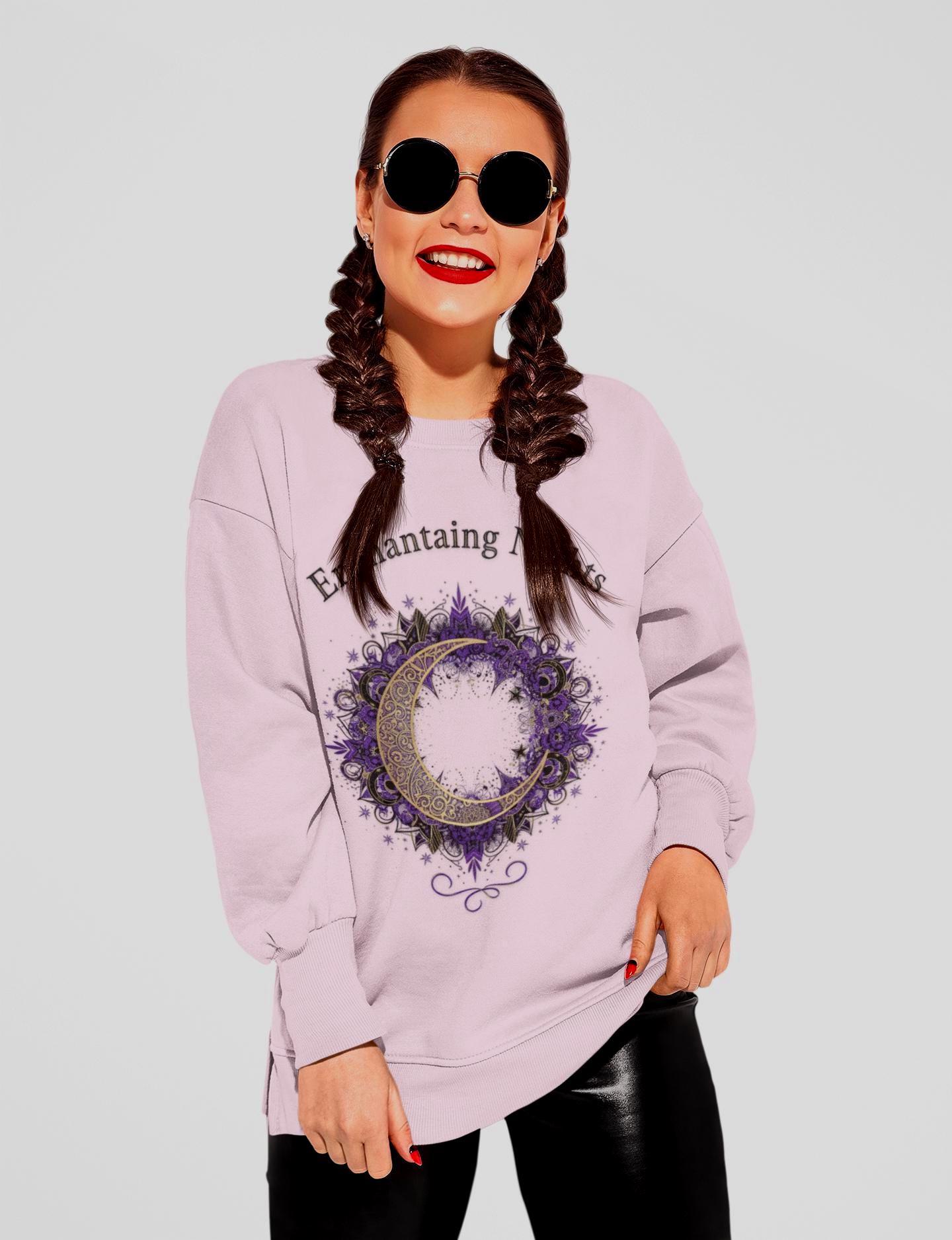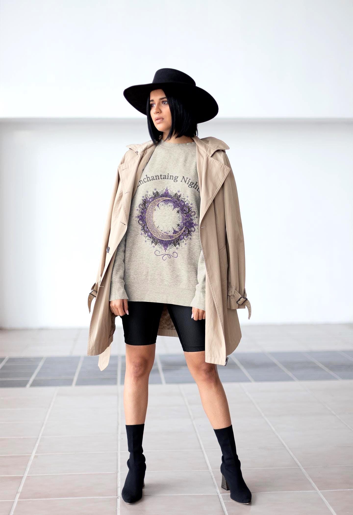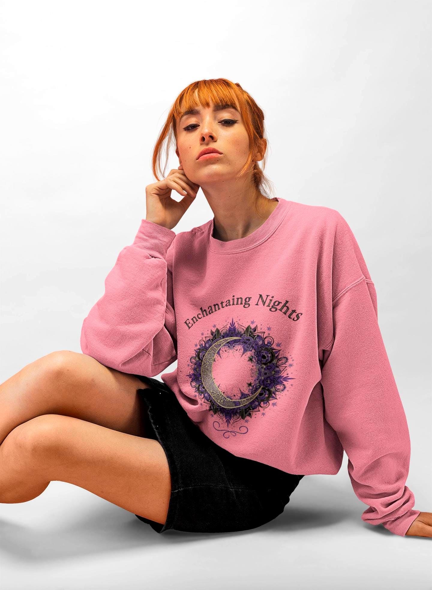 Soft, timeless, and quietly magical — this crewneck sweatshirt carries a night-sky whisper. A delicate wreath of moons, stars, and ivy sits at the chest beneath the phrase “Enchanting Nights,” rendered in gentle indigo and muted gold tones. It wraps you in the familiar weight of a well-made sweatshirt while inviting a moment of calm and wonder each time you slip it on. The fit is classic and roomy enough for layering; the embroidered-style artwork reads like a keepsake, not a logo. Wear it on slow evenings with tea, at midnight walks beneath streetlamps, or while curled up with a favorite book — it feels like a soft exhale after a long day.