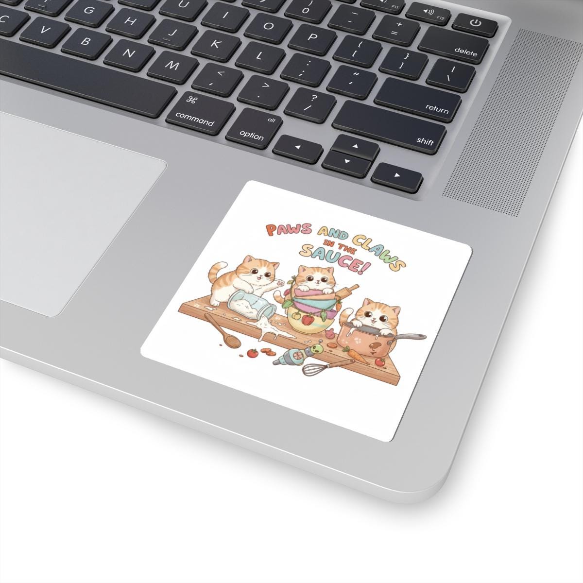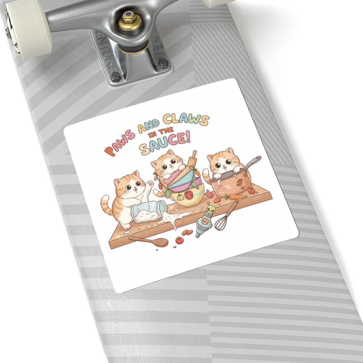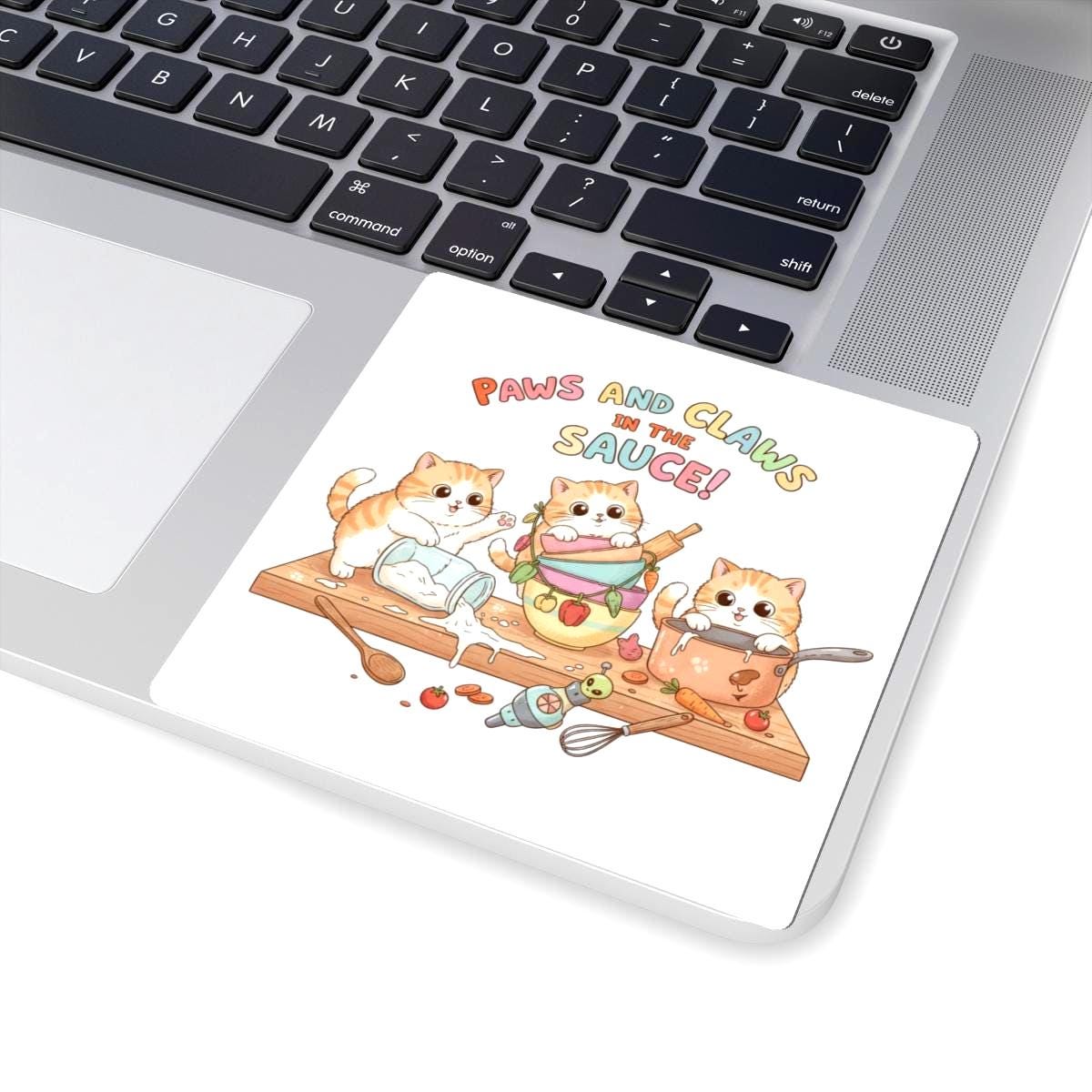 Three mischievous kittens crowd a wooden counter, covered in flour, bowls, and spilled batter—each one caught mid-mess with soft, pastel expressions. The illustration feels warm, silly, and gentle, like a cozy afternoon baking with friends. This glossy kiss-cut sticker brings that playful kitchen chaos to your laptop, journal, or recipe box. Its bright, eco-solvent printed colors and smooth finish make the artwork pop while maintaining a lightweight, decorative touch. The sticker hugs flat surfaces cleanly and stays put with a strong permanent adhesive, adding a slice of feline mischief to everyday items and sparking smiles whenever it’s seen.