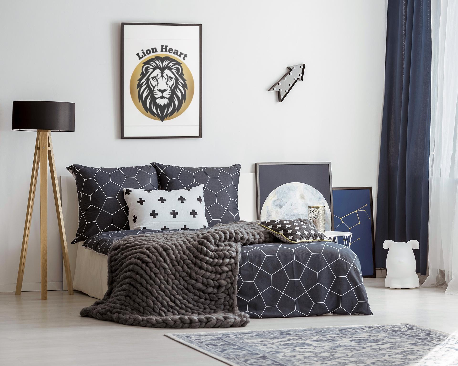 A minimalist stretched canvas print featuring a stylized lion head rendered in bold black linework set against a muted gold disc, with clean assertive type reading a short empowerment phrase above. The composition leans into a regal, resolute mood—sparse negative space and a restrained palette create a quiet, authoritative statement suited to wellness and boundary-focused spaces. This piece works as a visual anchor in home offices, meditation corners, or leadership-focused rooms where calm confidence is emphasized.