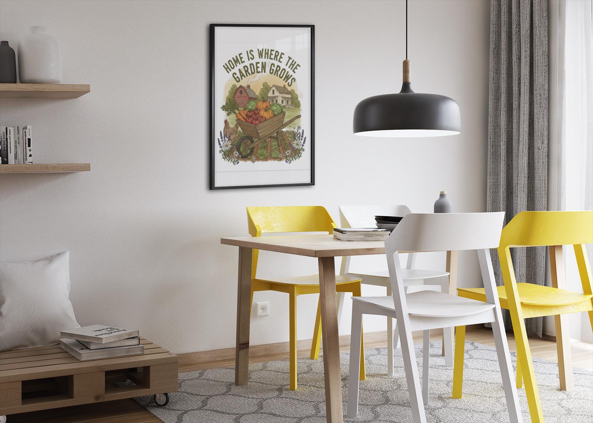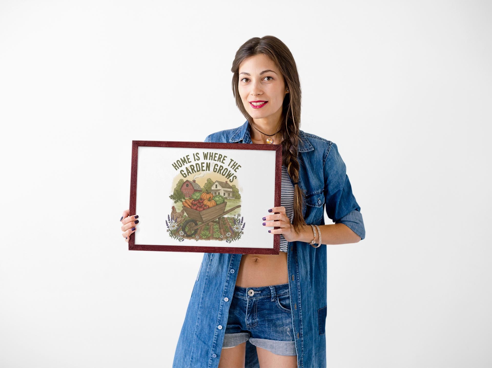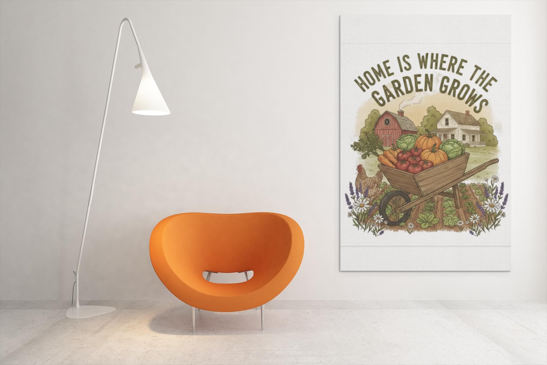 A matte stretched canvas print that brings a sunlit vegetable farm into the kitchen, stamped with the phrase “Home Is Where the Garden Grows.” The image feels warm and lived-in — rows of produce, soft earth tones, and a handcrafted farmhouse vibe that settles into a cozy cooking space. Lightweight but substantial, the canvas uses a unique Greenguard Gold-certified coating and latex inks for rich, non-toxic color that won’t overpower the room. Stretched over a 1.25" pine frame and fitted with soft rubber dots and back hanging hardware, it sits flush and steady on the wall. This piece speaks to home gardeners and kitchen keepers who love the ritual of growing, harvesting, and cooking from their own patch of earth — a quiet reminder of the seasons every time you wash the dishes or pull something from the oven.