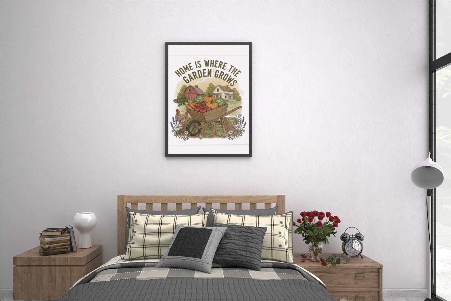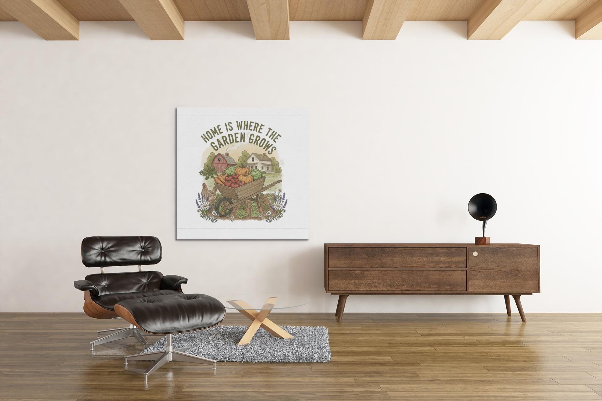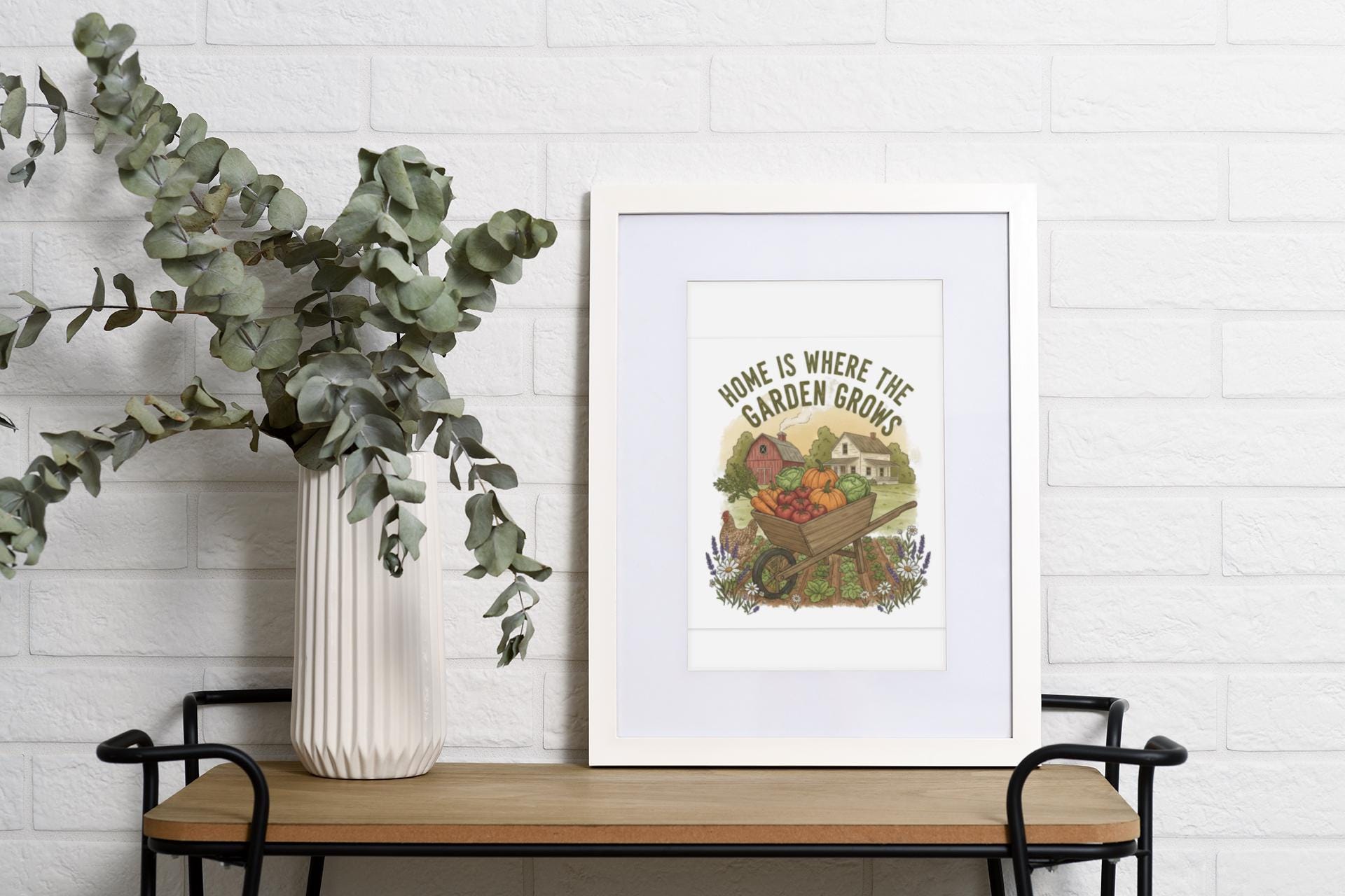 A matte stretched canvas print that brings a sunlit vegetable farm into the kitchen, stamped with the phrase “Home Is Where the Garden Grows.” The image feels warm and lived-in — rows of produce, soft earth tones, and a handcrafted farmhouse vibe that settles into a cozy cooking space. Lightweight but substantial, the canvas uses a unique Greenguard Gold-certified coating and latex inks for rich, non-toxic color that won’t overpower the room. Stretched over a 1.25" pine frame and fitted with soft rubber dots and back hanging hardware, it sits flush and steady on the wall. This piece speaks to home gardeners and kitchen keepers who love the ritual of growing, harvesting, and cooking from their own patch of earth — a quiet reminder of the seasons every time you wash the dishes or pull something from the oven.