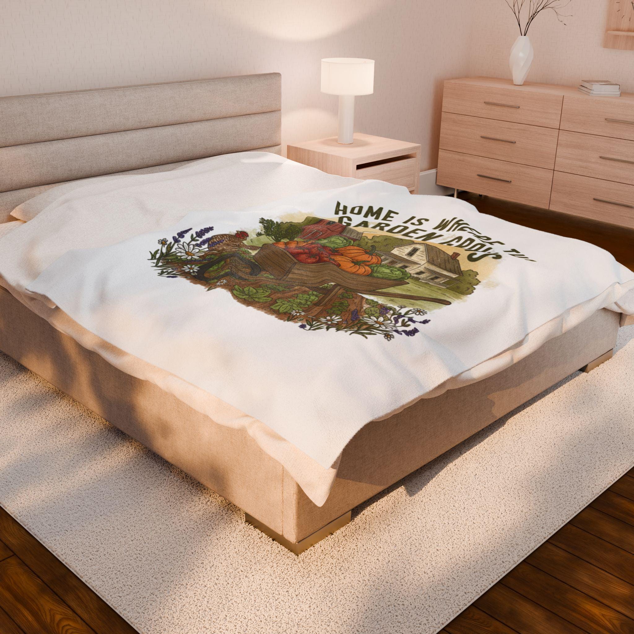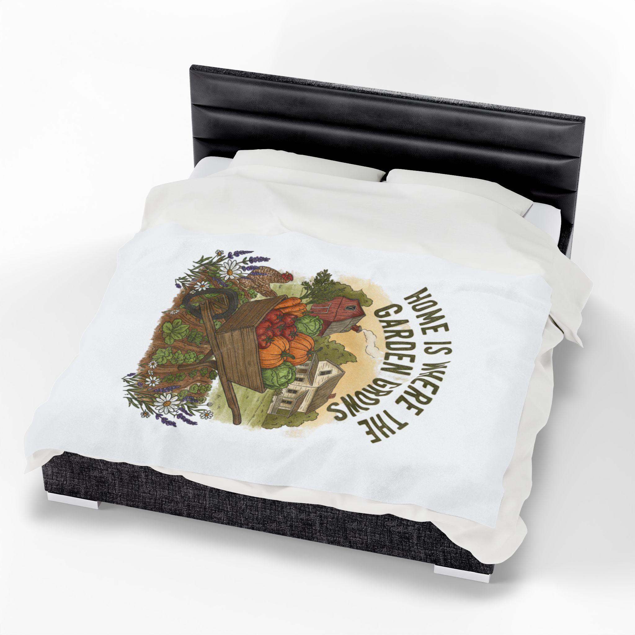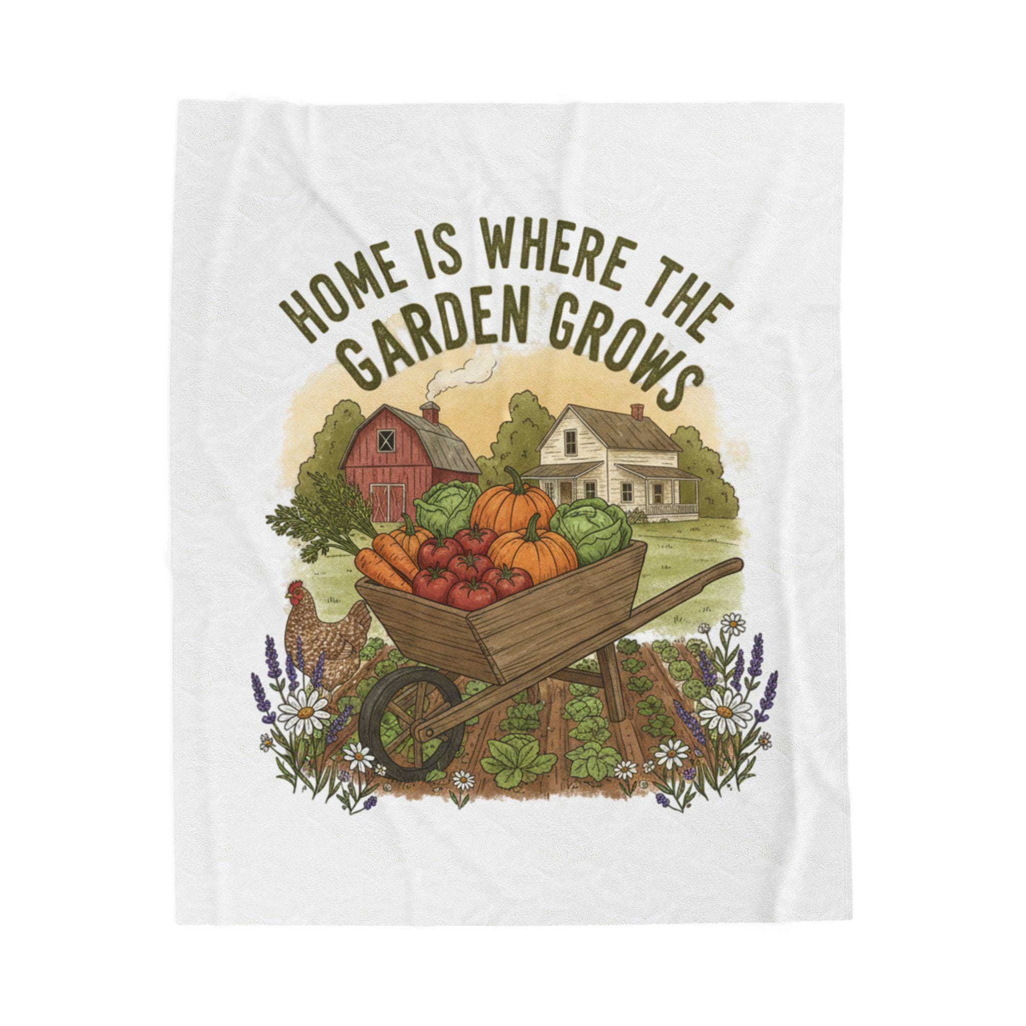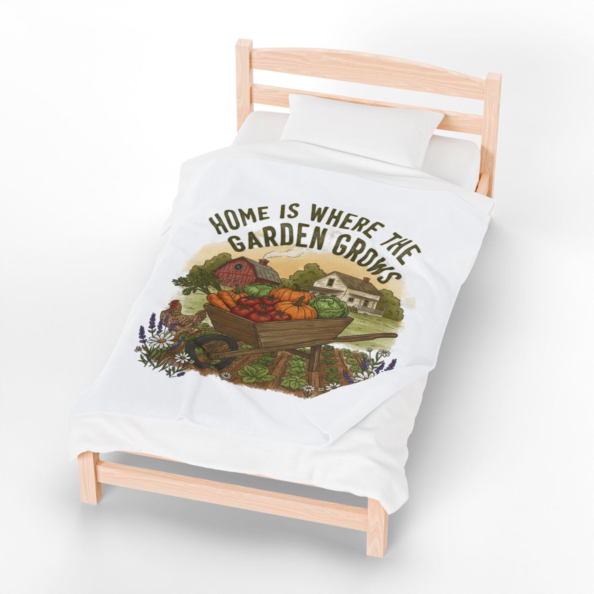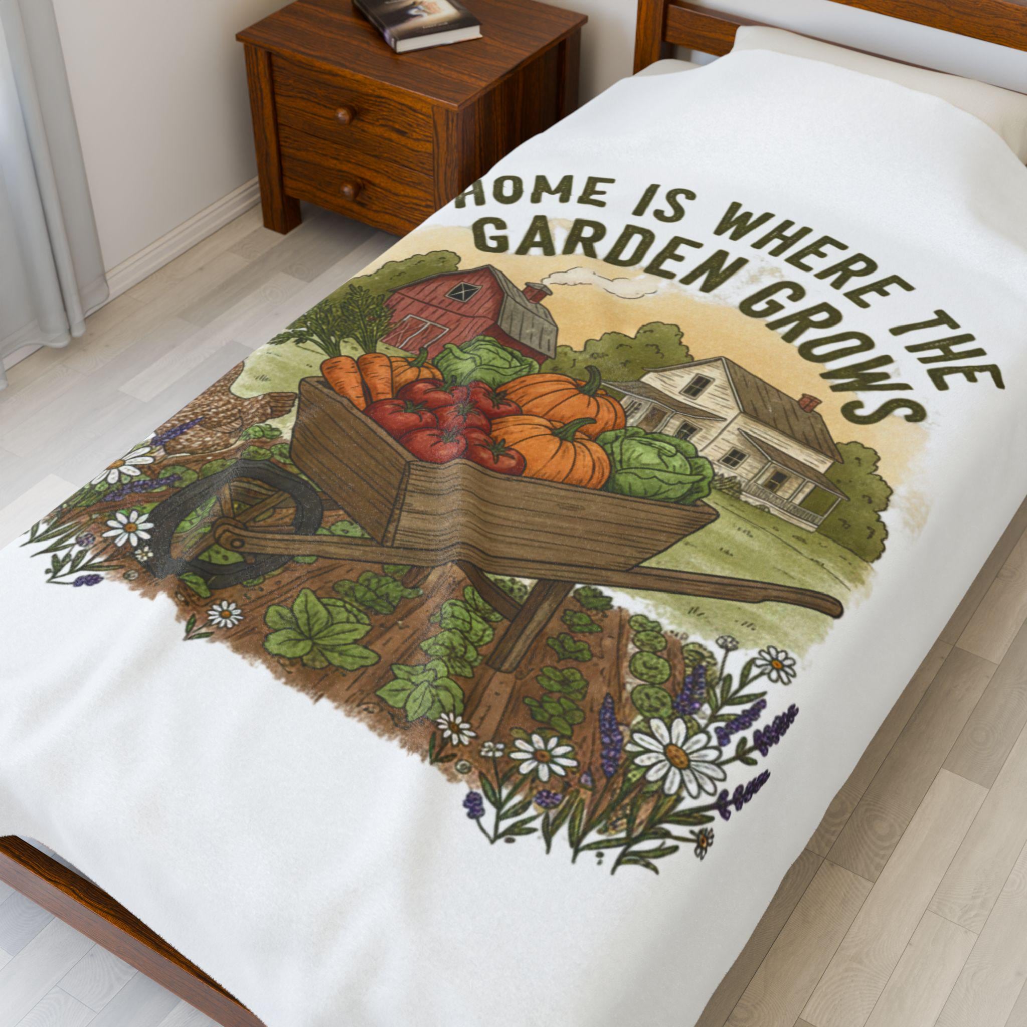 Wrap yourself in the quiet comfort of a garden at dusk. This velveteen plush blanket brings the phrase "Home is where the garden grows" to life with a soft, slightly weighted drape that feels like a warm evening on the porch. It settles around your shoulders, muffling the world and leaving room for small, contented moments—reading by lamplight, nursing a cup of tea, or tucking into the couch after a long day. The printed side shows clear, vibrant detail so the phrase and any accompanying design read like a gentle reminder of rootedness and slow-growing joy. Made for grown-up spaces, it layers easily over a sofa or folds neatly at the foot of a bed, adding a tactile, botanical whisper to your home.