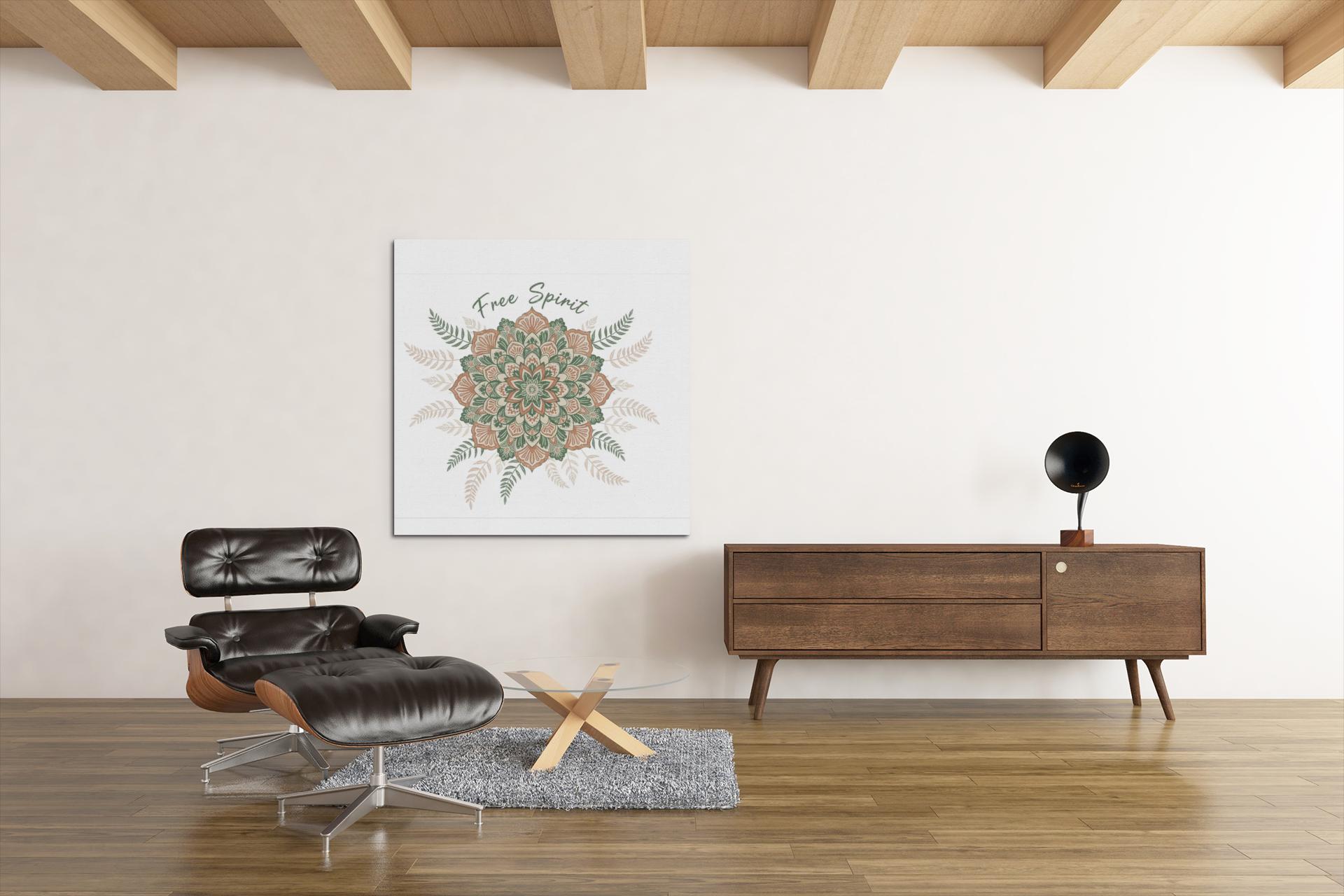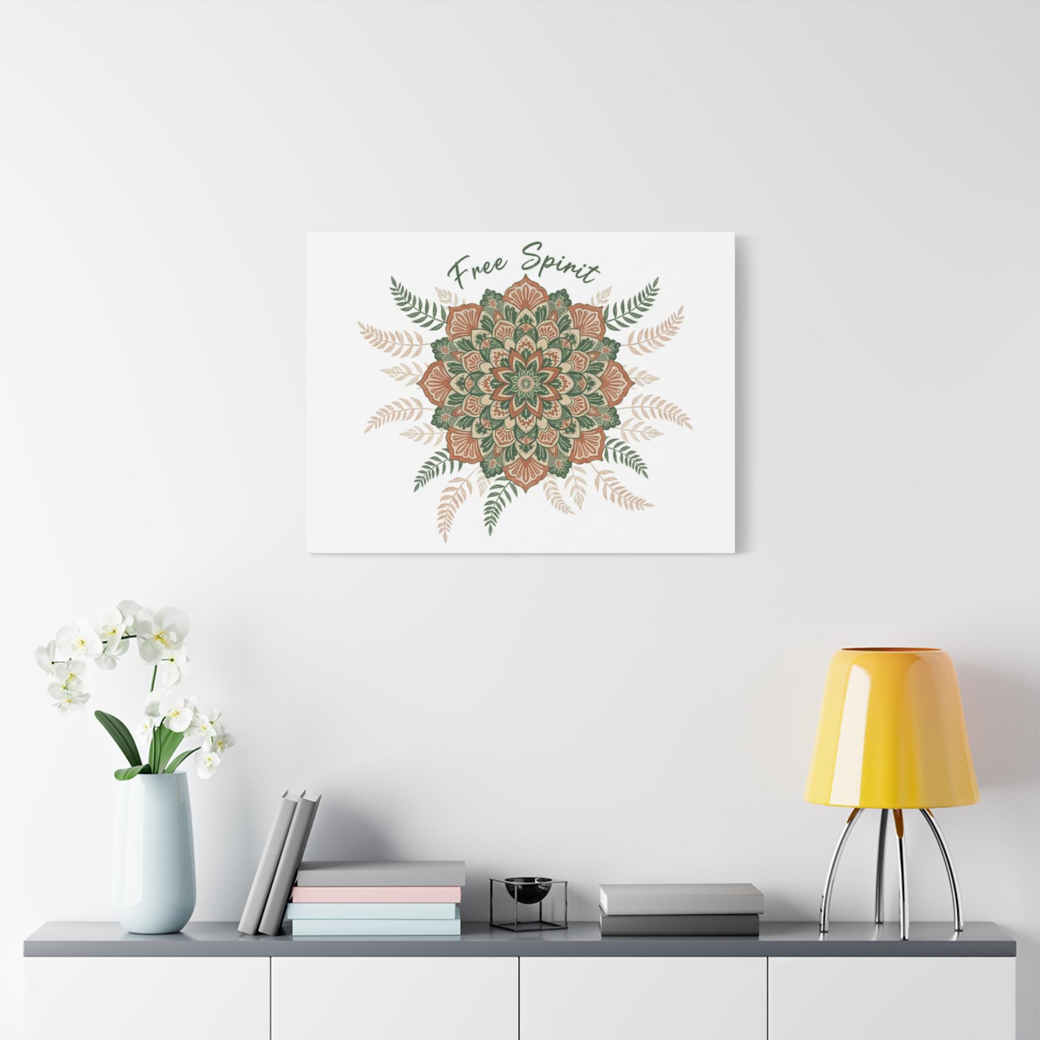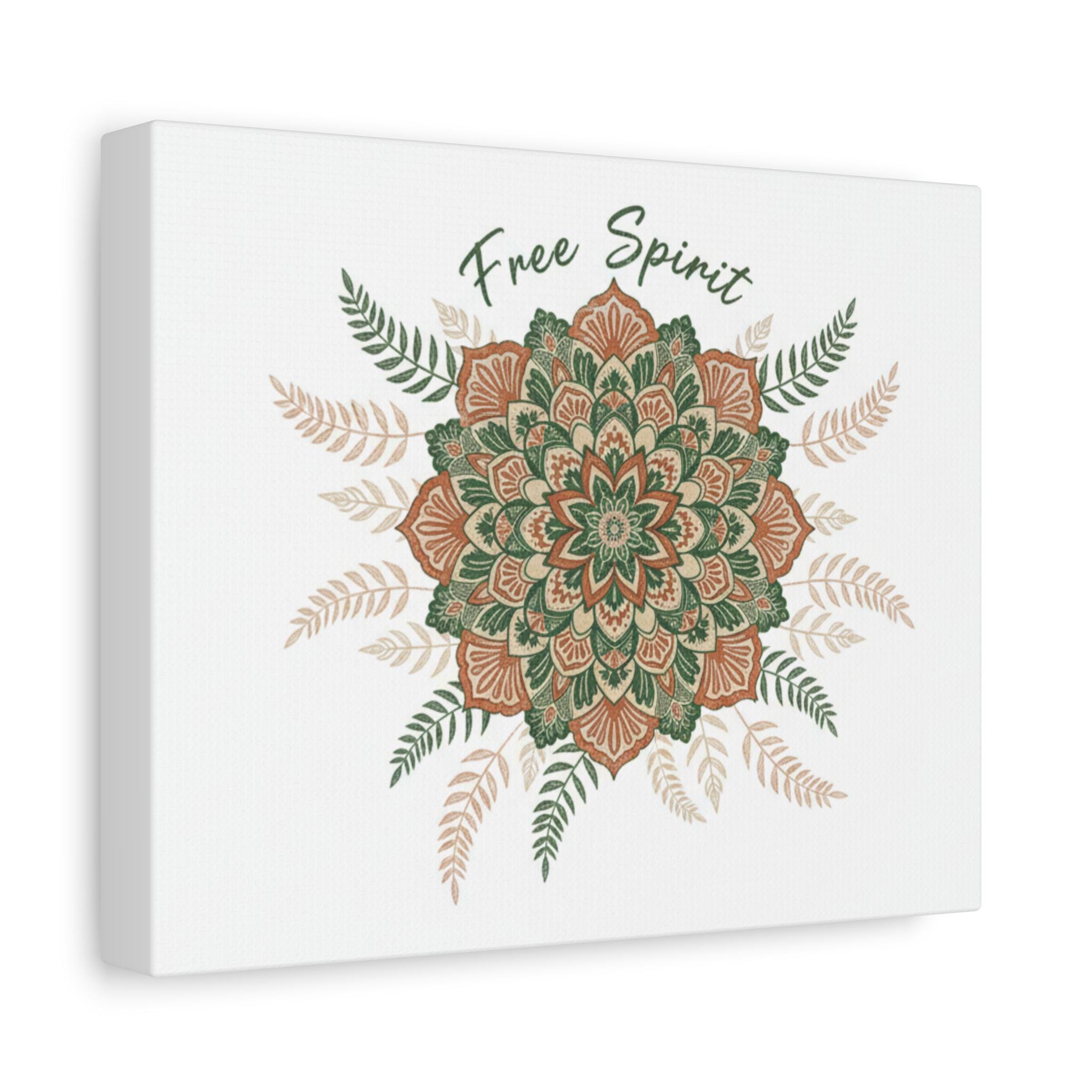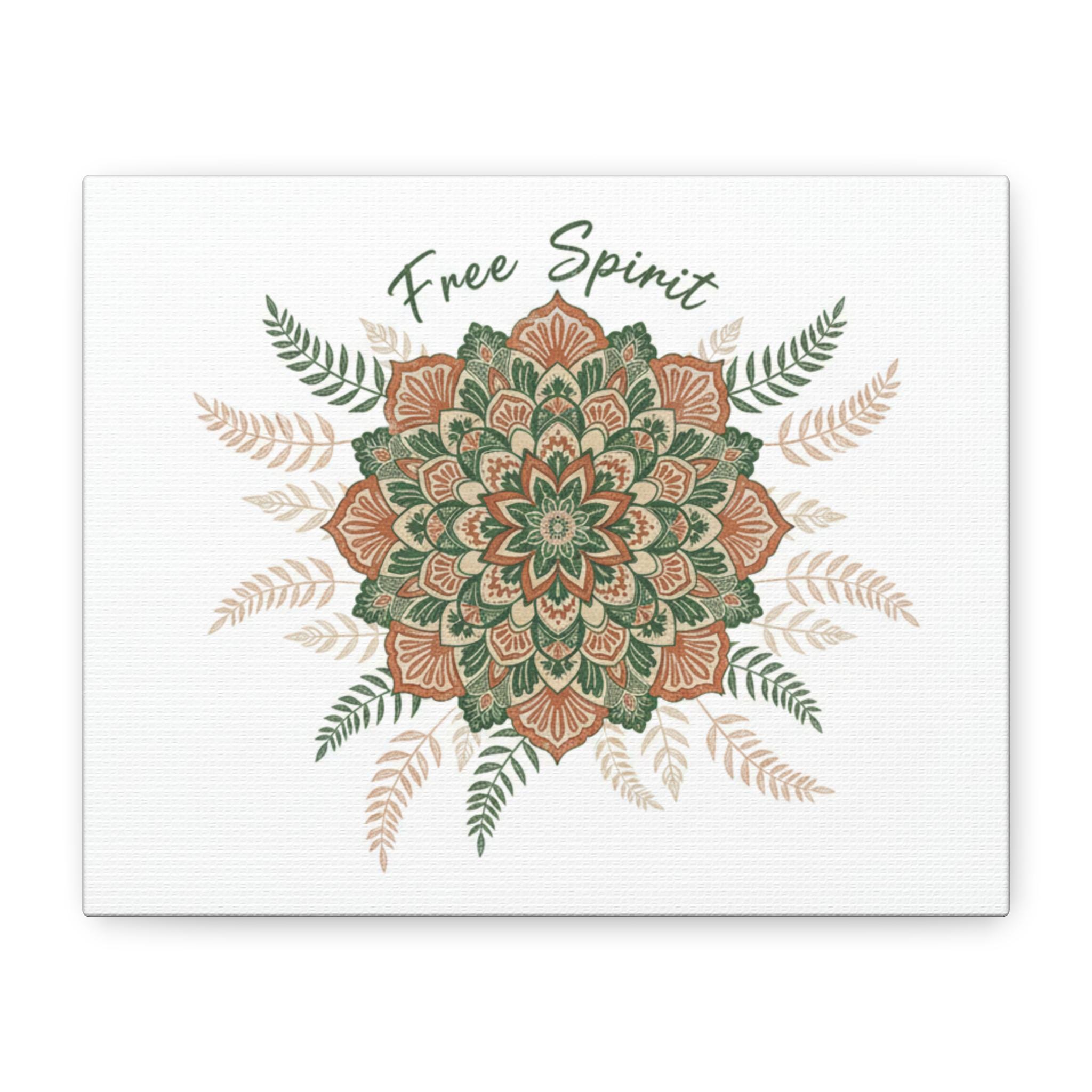 Hand-drawn mandala in warm terracotta and muted sage hues, printed on a matte stretched canvas for an earthy, artisanal boho look. The slightly imperfect, textured motif and surrounding fern accents read like handcrafted textile work—aligned with boho tapestry and mandala pattern trends—bringing a relaxed, nostalgic vibe to a living room, studio wall, or cozy corner. Subtle “Free Spirit” script integrates with the ornamental design without dominating it, appealing to shoppers drawn to boho aesthetic and vintage paisley-inspired patterns.