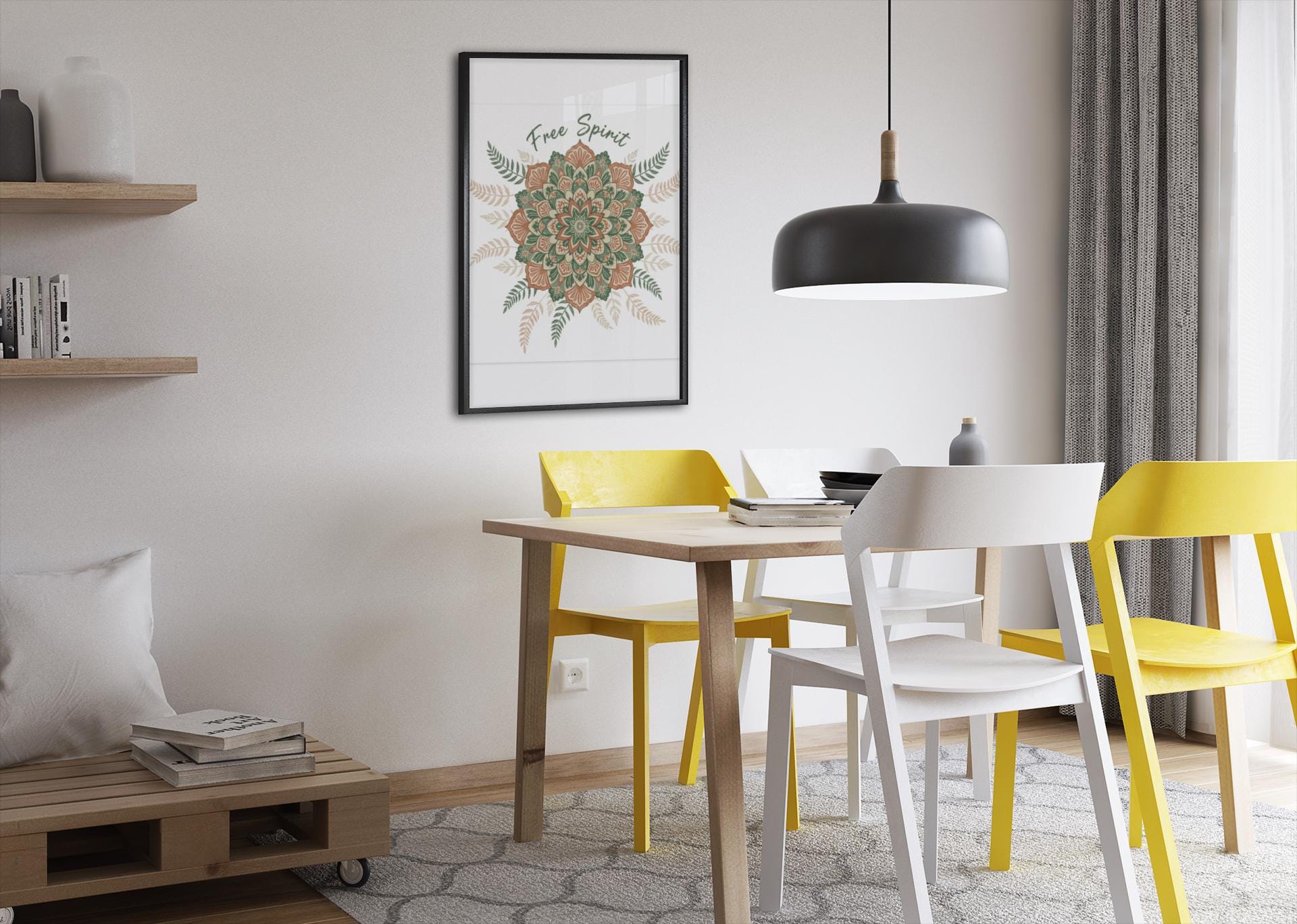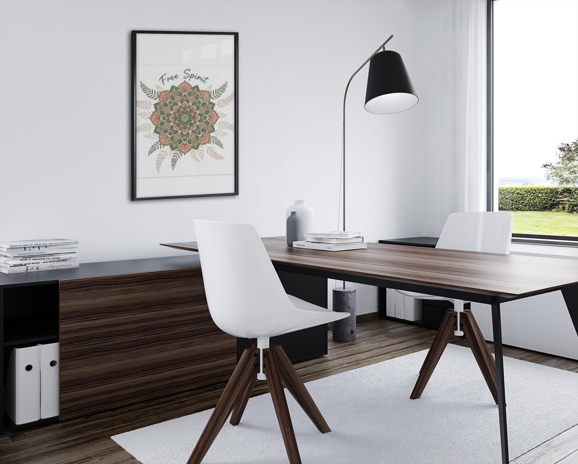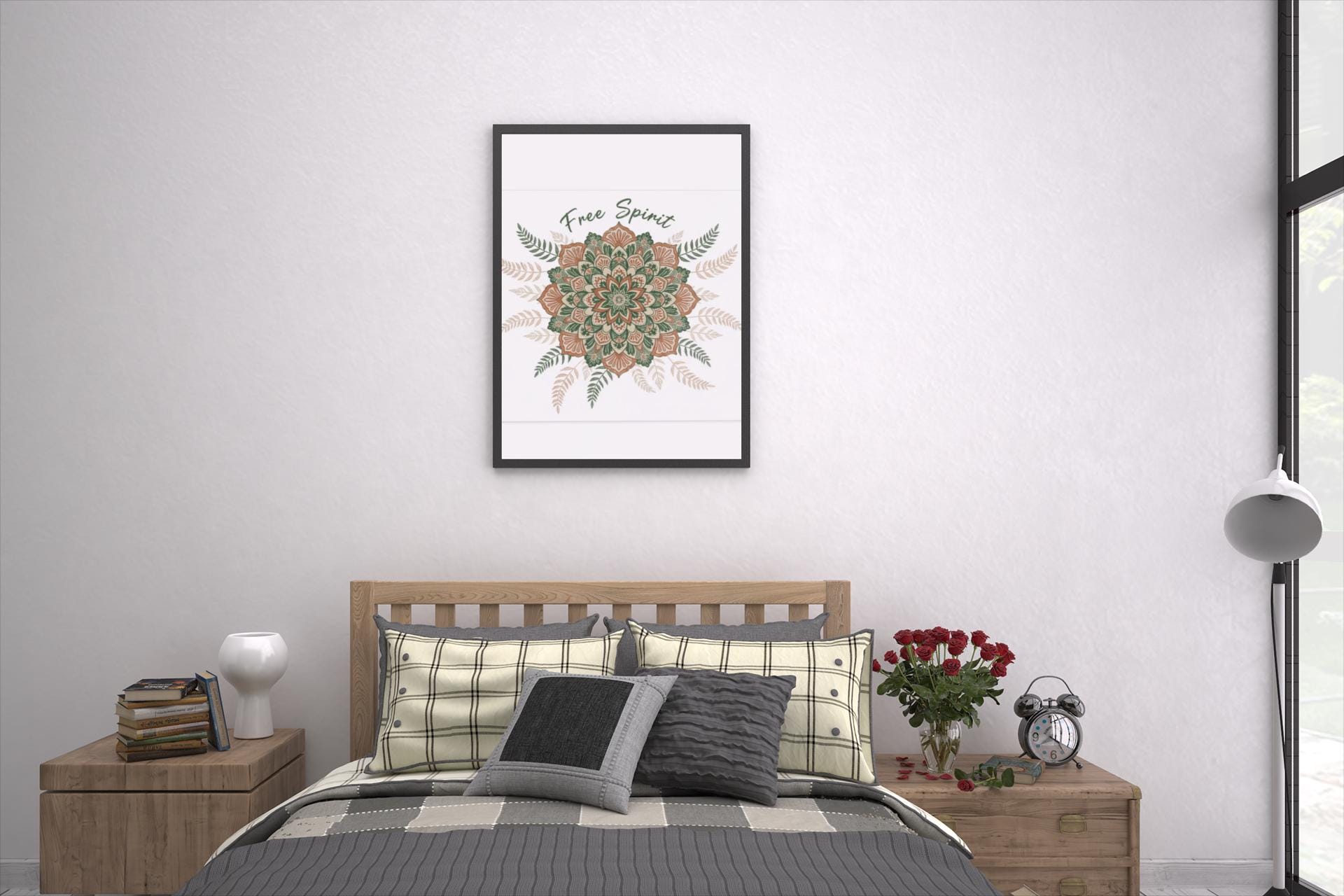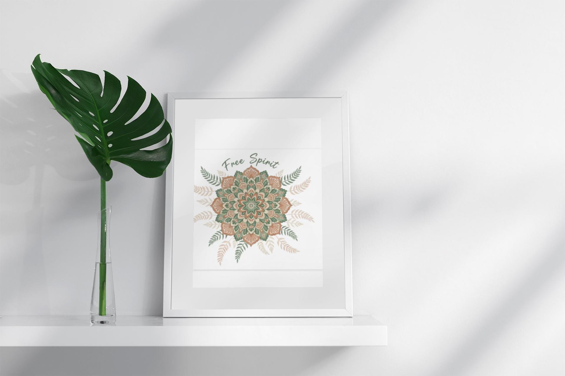 Hand-drawn mandala in warm terracotta and muted sage hues, printed on a matte stretched canvas for an earthy, artisanal boho look. The slightly imperfect, textured motif and surrounding fern accents read like handcrafted textile work—aligned with boho tapestry and mandala pattern trends—bringing a relaxed, nostalgic vibe to a living room, studio wall, or cozy corner. Subtle “Free Spirit” script integrates with the ornamental design without dominating it, appealing to shoppers drawn to boho aesthetic and vintage paisley-inspired patterns.