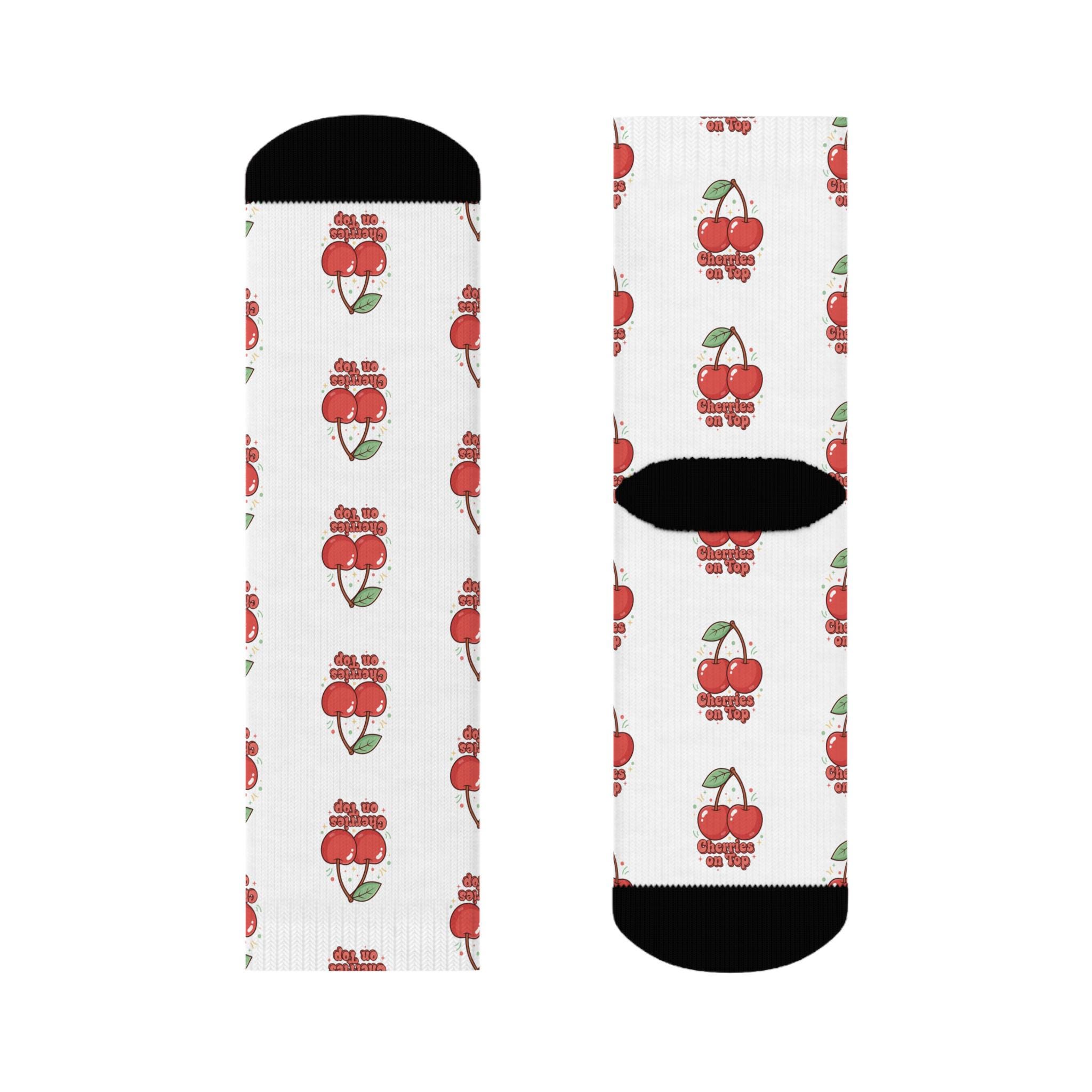 Soft crew socks patterned with a playful cherry motif. These lightweight, durable polyester socks keep their shape and dry quickly, while a cushioned sole adds an extra layer of comfort for long days on your feet. The clean white background makes the tiny red cherries pop, and the black heel and toe contrast give a vintage, quirky look that slips easily into casual and streetwear outfits. Wear them with rolled jeans, sneakers, or a skirt for a subtle touch of retro fun during weekend outings, farmers’ market mornings, or cozy nights in.