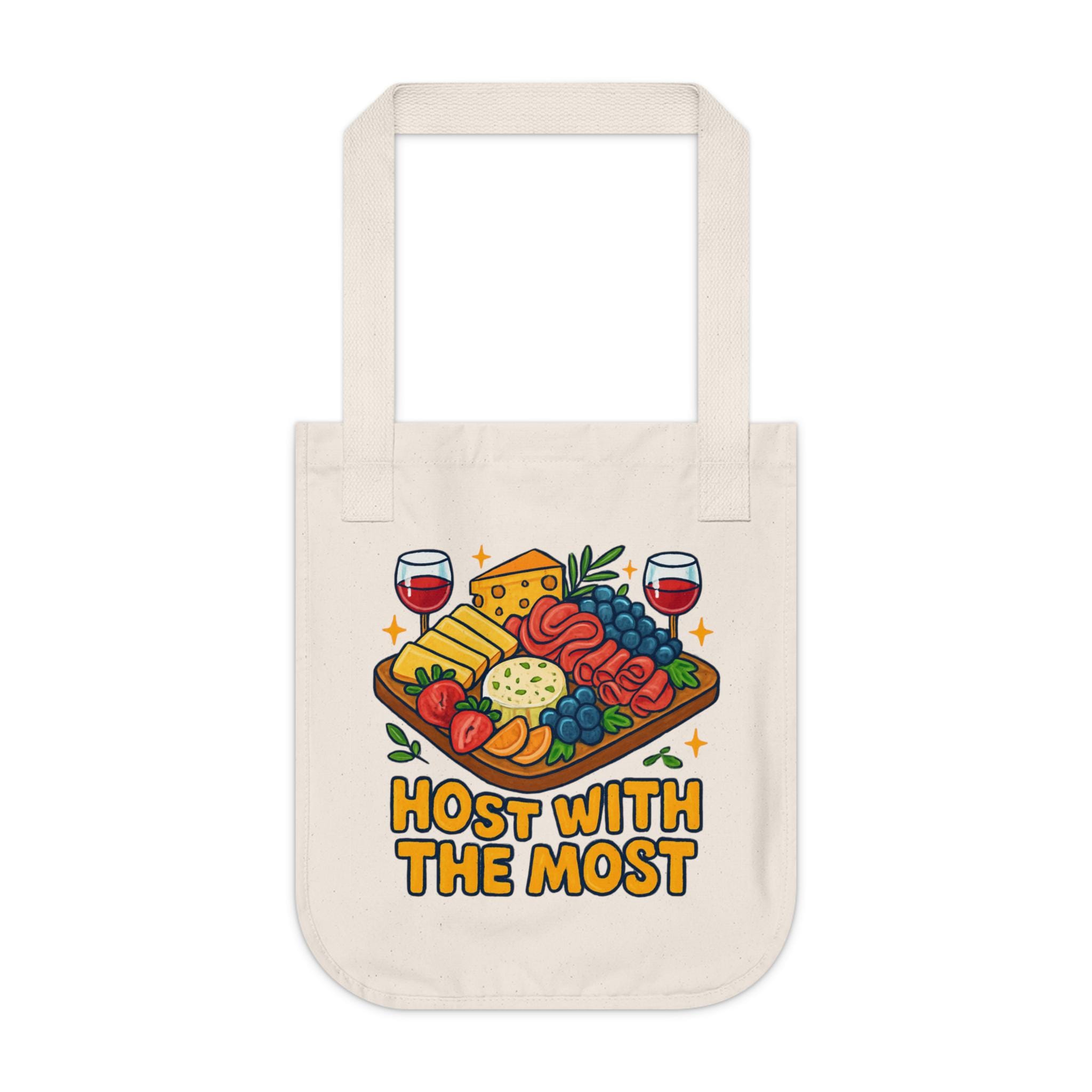 Carry your hosting energy wherever you go. This organic canvas tote shows off a colorful charcuterie board illustration and the playful line “Host With The Most,” evoking relaxed evenings of good food, clinking glasses, and lively conversation. The natural, slightly flecked canvas and sturdy cotton web handles give it a warm, handmade feel that fits right in at farmers markets, grocery runs, or when you’re loading up snacks for a picnic. It sits comfortably over the shoulder and opens wide to hold platters, bottles, or a change of plans—an everyday companion for anyone who loves gathering people around a table.