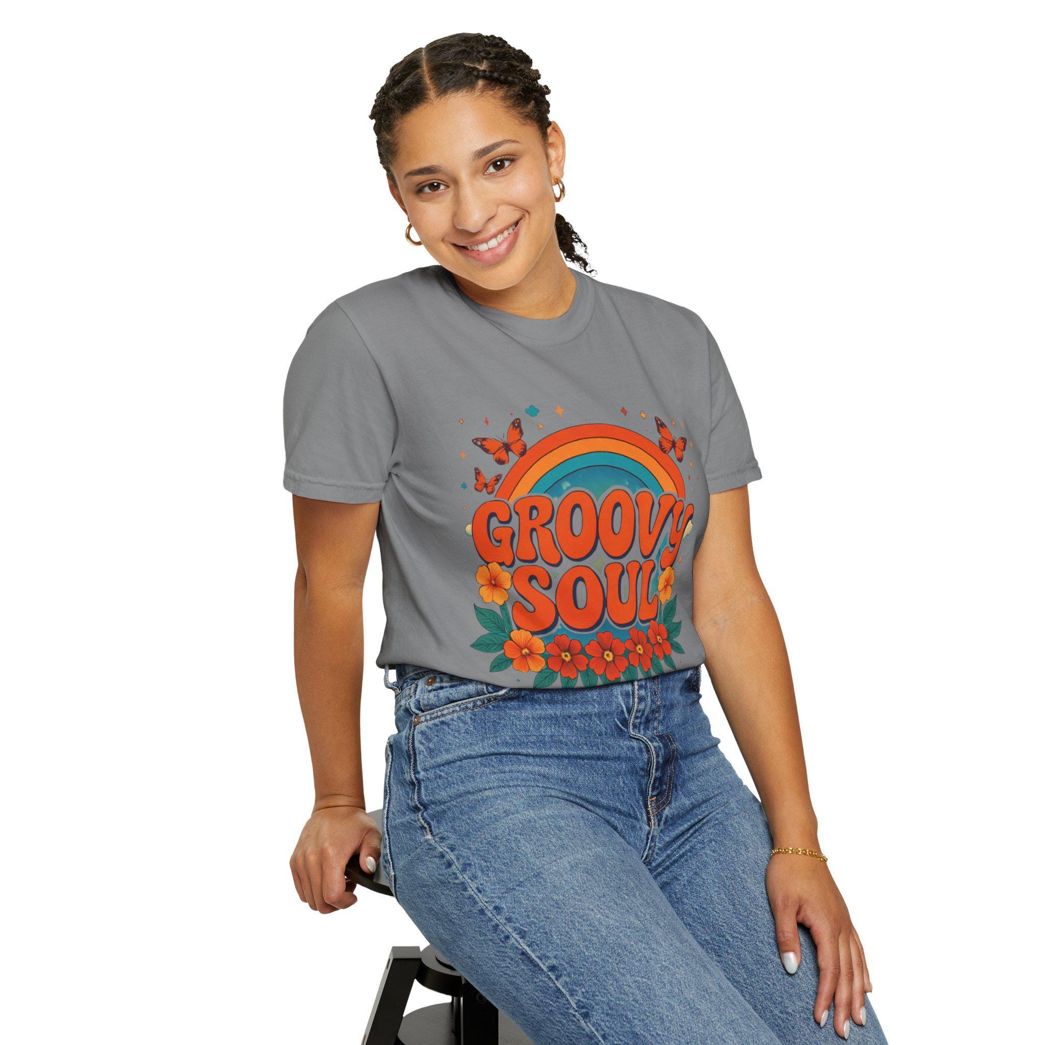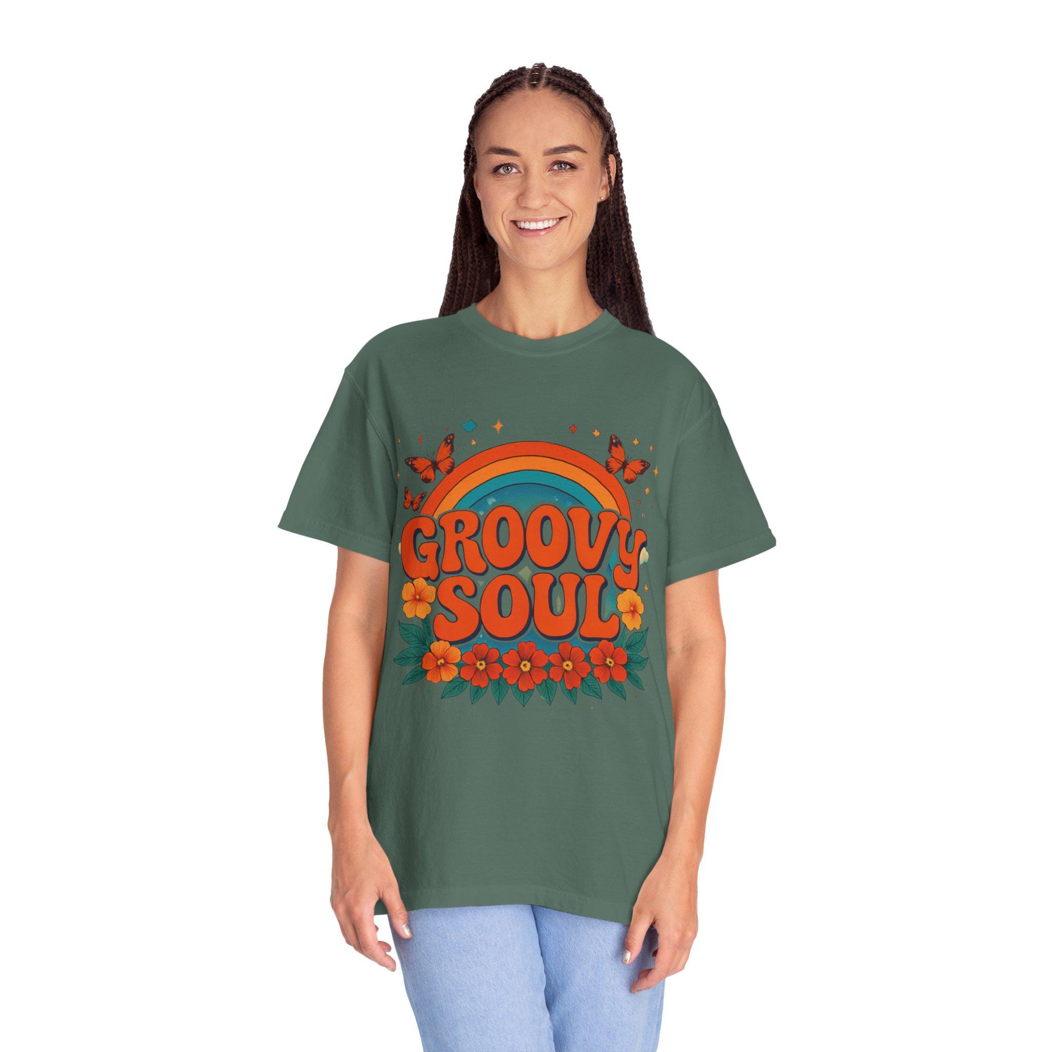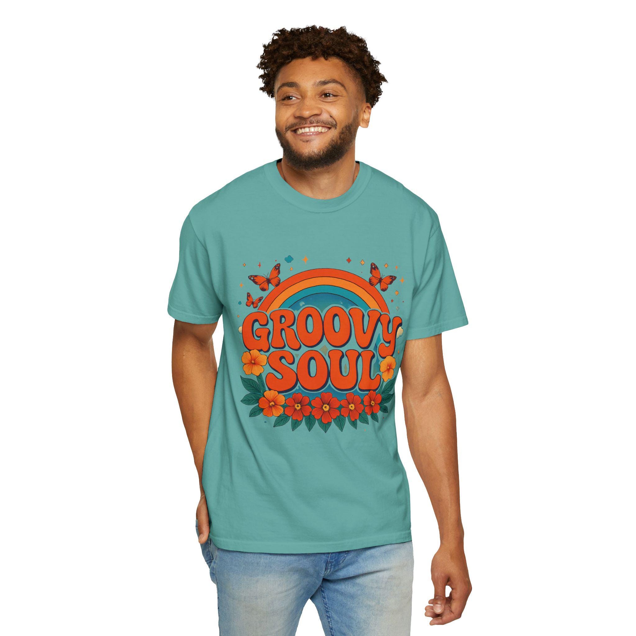 Soft, lived-in cotton meets sun-drenched retro charm. This relaxed-fit tee carries a warm, garment-dyed hand and a cheerful ’70s-inspired print — curving rainbow, bold “GROOVY SOUL” lettering, butterflies and vintage florals — that looks like it’s been part of your rotation for years. It sits loose without feeling boxy, the heavyweight fabric giving structure while the pre-shrunk ring-spun cotton keeps it comfortable through washes. Wear it to slow afternoons at a record store, weekend coffee runs, or backyard sunsets where conversation and vinyl are on the agenda.
