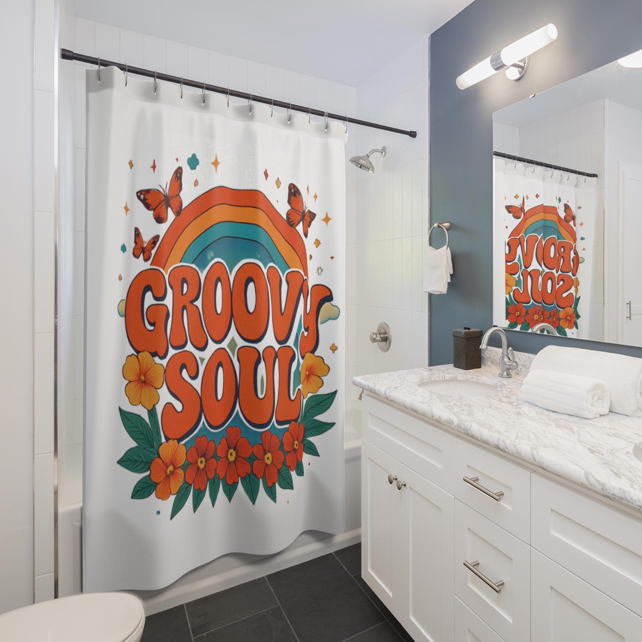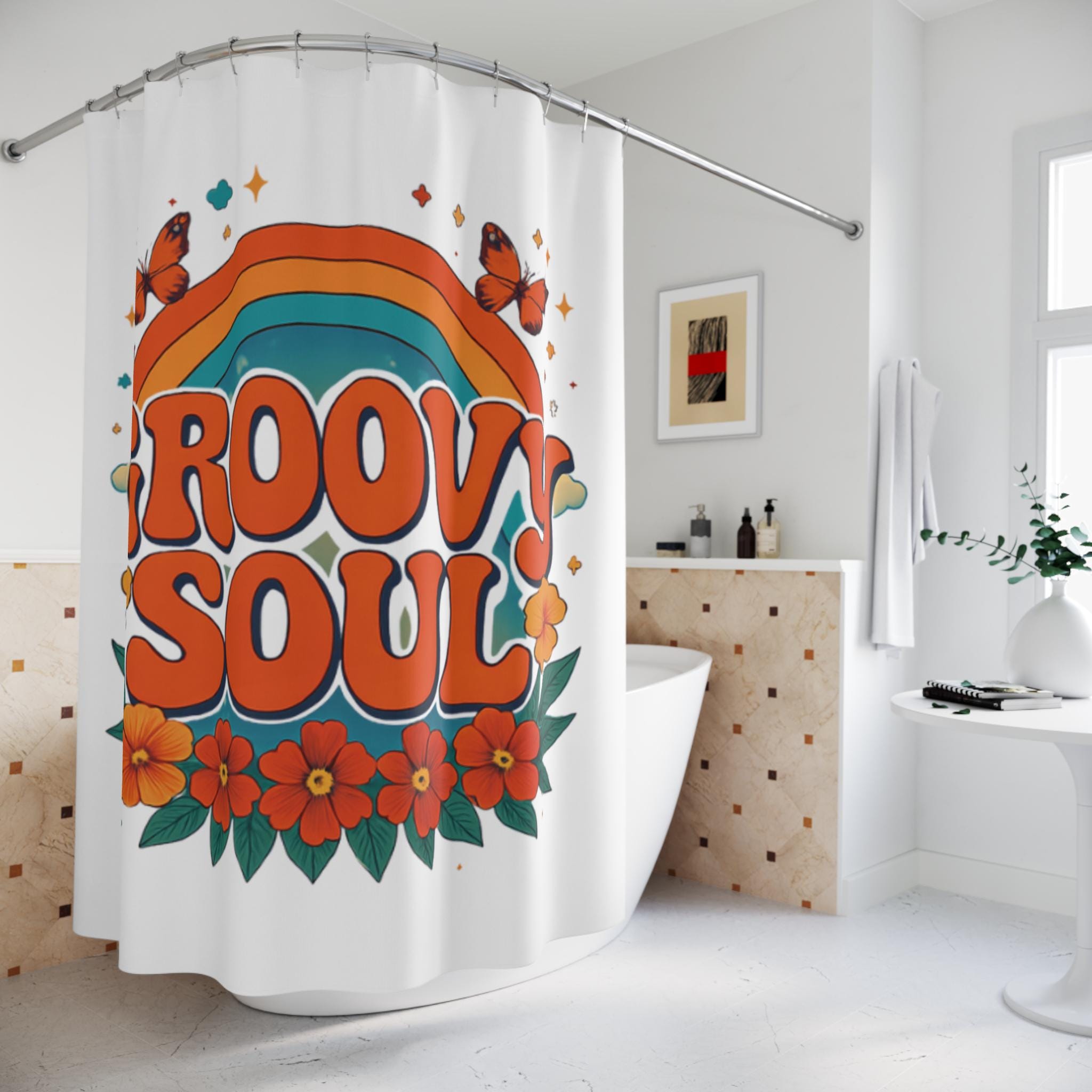 Let this shower curtain bring a warm, retro heartbeat to your bathroom. Bold, rounded lettering reads “GROOVY SOUL” beneath a sunburst rainbow, surrounded by cheerful orange blossoms and fluttering butterflies. The palette—burnt orange, teal, and sunflower tones—creates a cozy, nostalgic glow that turns morning routines into small, joyful moments. Hang it in a bright, eclectic bathroom to anchor a vintage-inspired look, or pair with earthy towels and rattan accents to emphasize laid-back, boho vibes. The one-sided print keeps the artwork vivid while the durable polyester holds its shape and dries quickly, so it stays fresh through daily use.