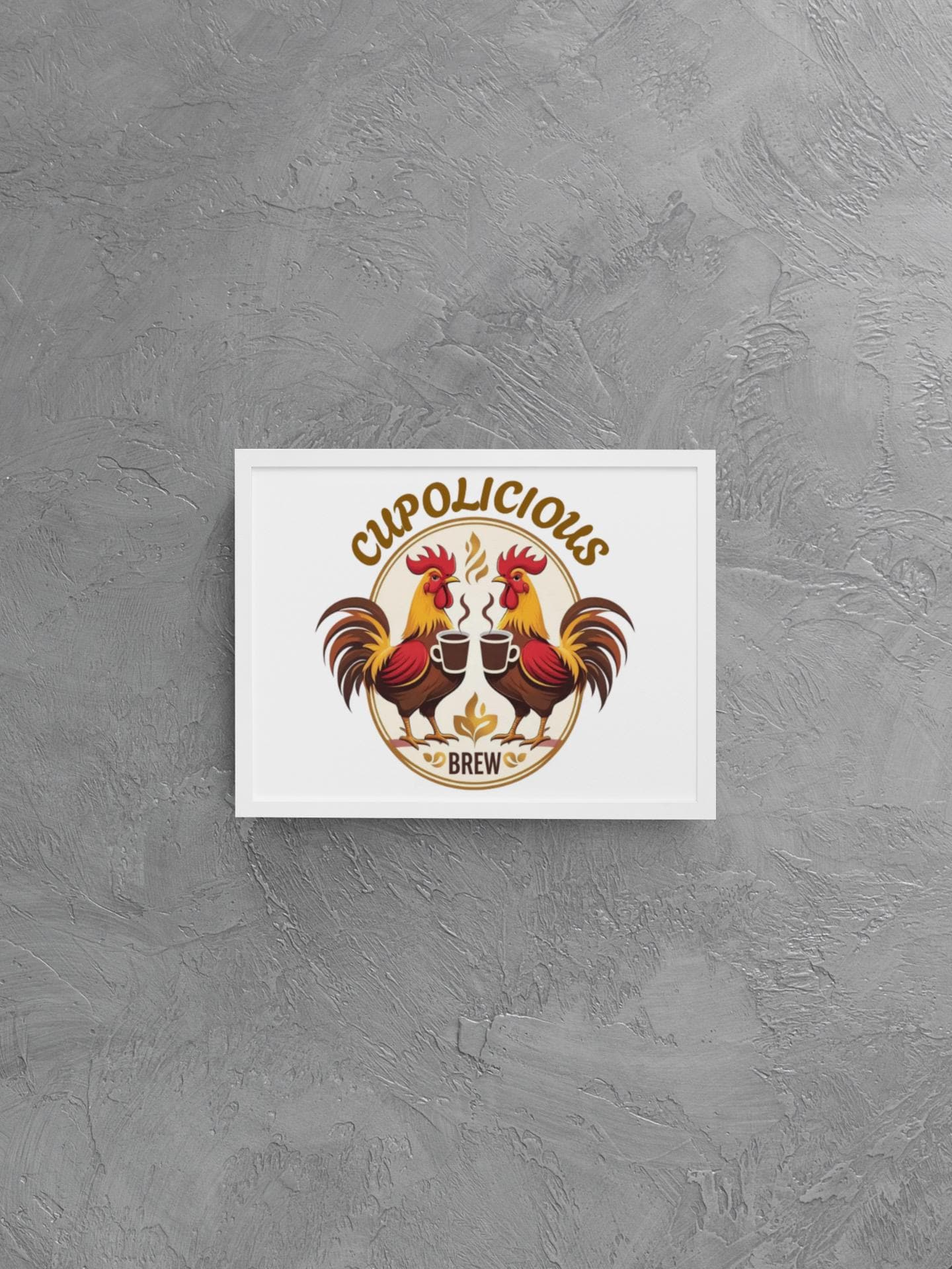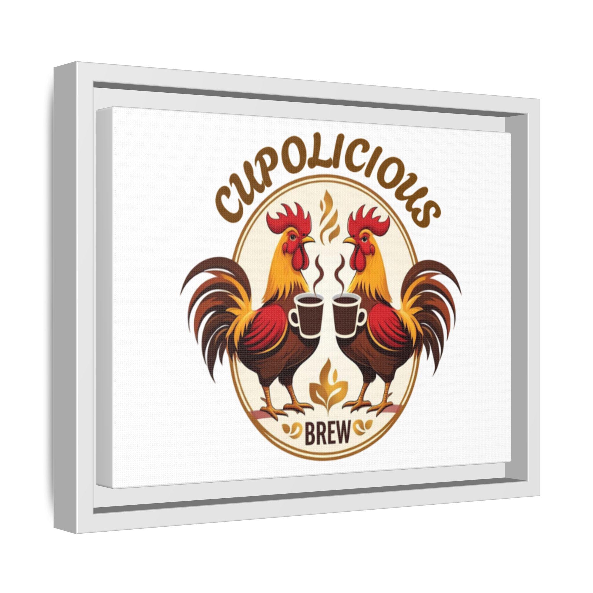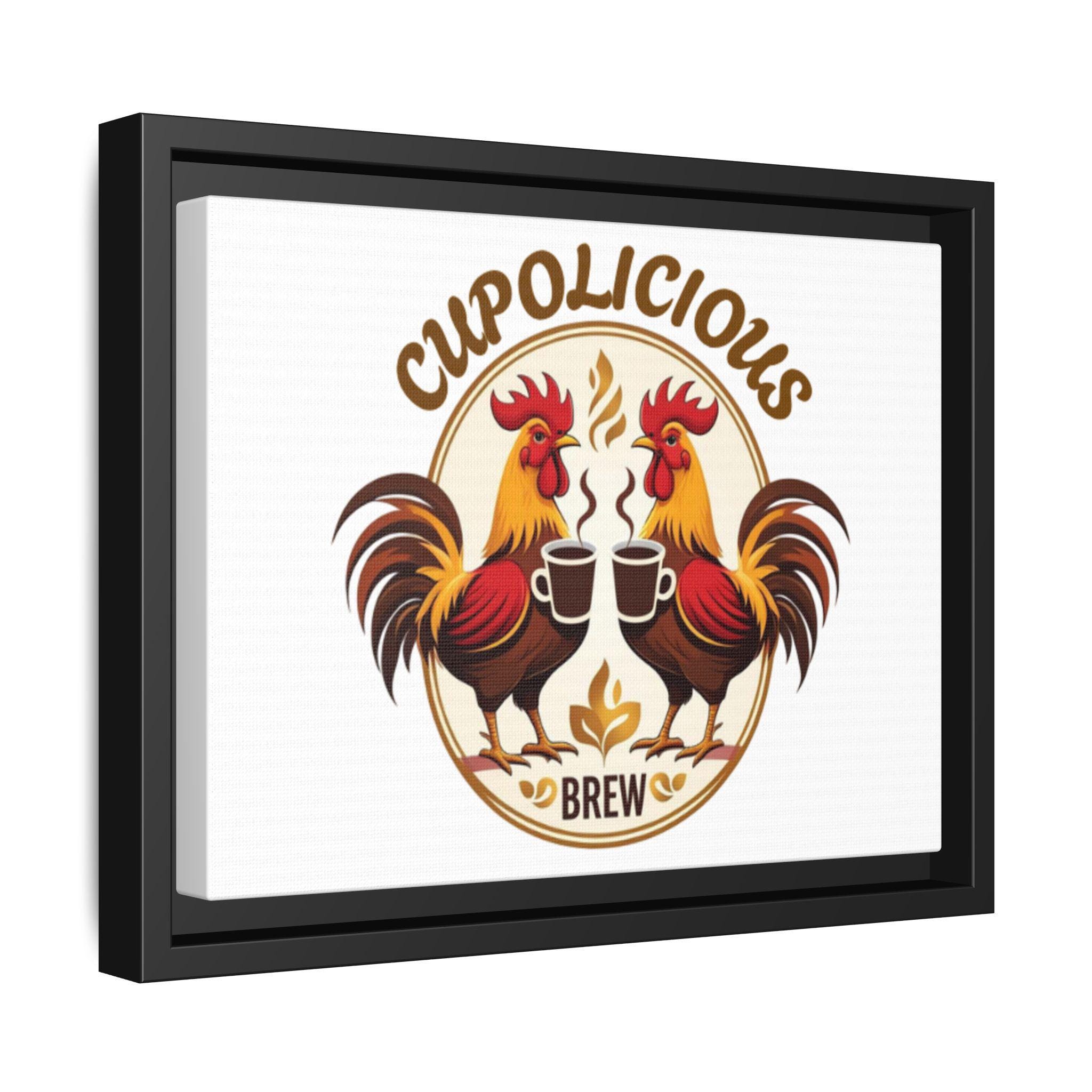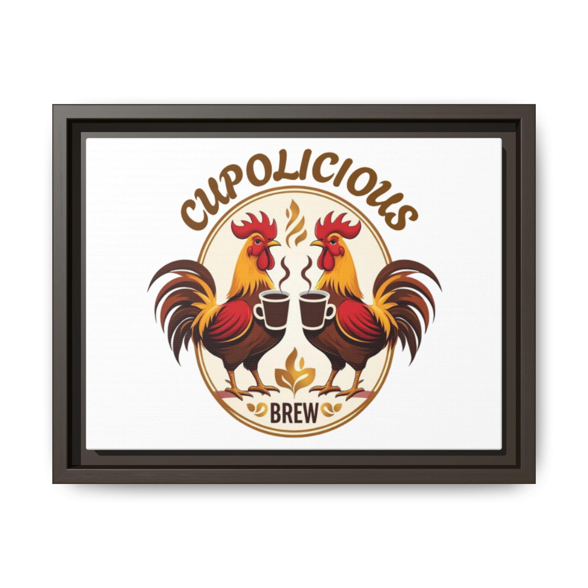 Wake up the kitchen with warm, sunlit charm. This framed matte canvas shows two proud roosters toasting steaming mugs beneath a playful "Cupolicious Brew" banner — a folk-inspired, vintage-café vibe that reads like a morning ritual. The matte finish softens glare and lets the rich browns, golds, and deep reds feel more tactile and handcrafted. Hung over a breakfast nook or leaned on a counter, it brings a cozy, slightly rustic energy that invites slow coffee and good conversation. The black frame gives the piece modern contrast while the textured canvas keeps the artisanal character intact.
