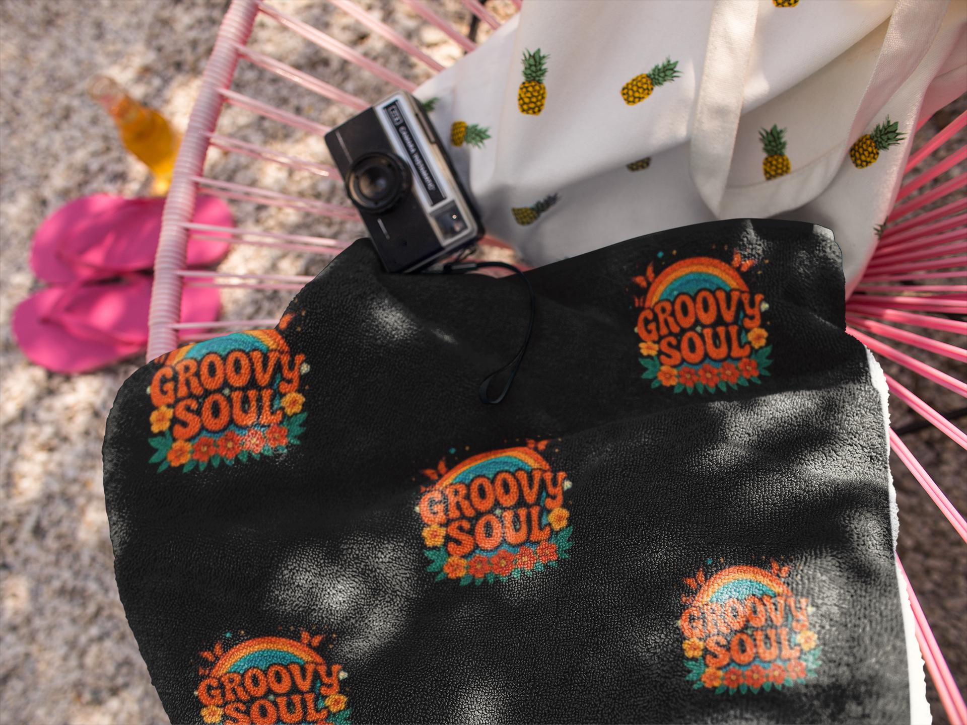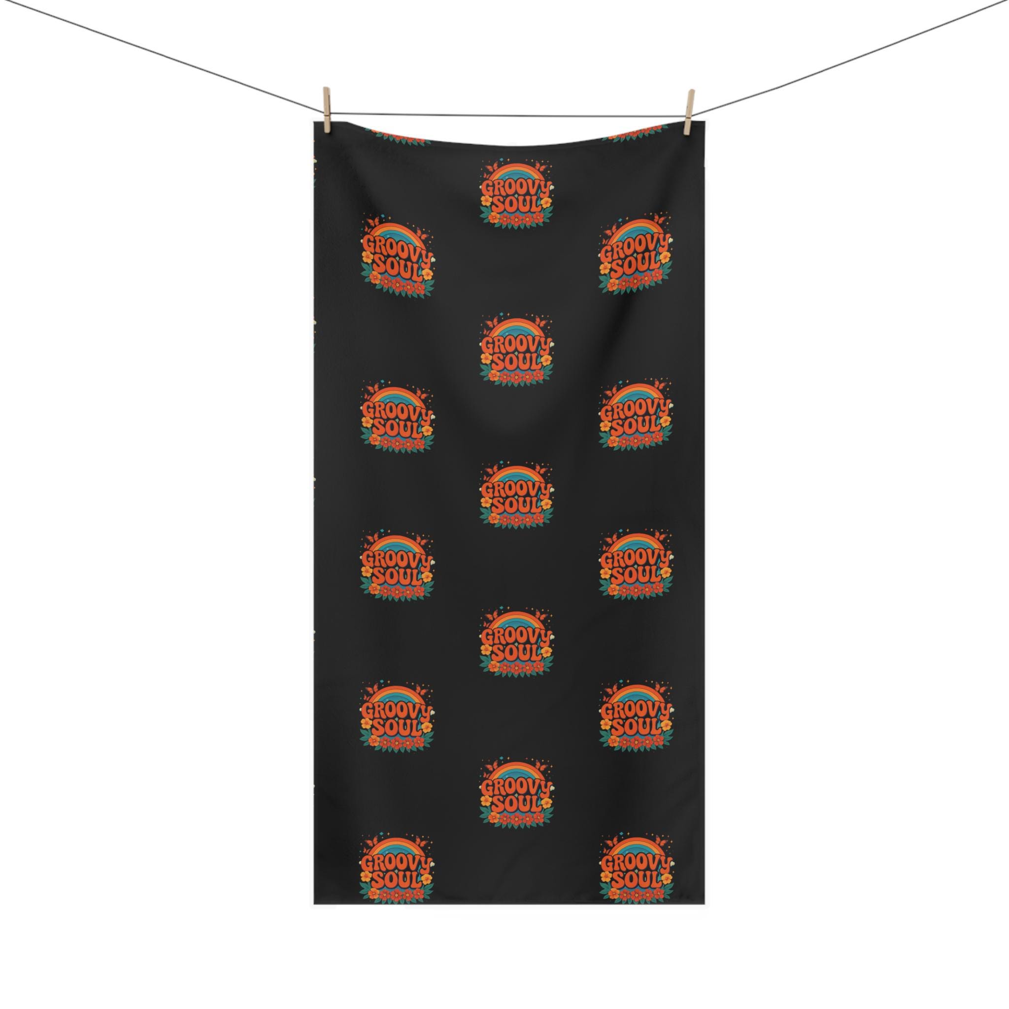 This is a cozy, travel-ready mink-cotton towel that blends soft absorbency with vibrant, retro-inspired style. The front side shows a repeating ’Groovy Soul’ emblem in warm orange and teal against a deep black field — it feels like a sun-soaked record cover carried into the surf. The polyester-mink front keeps colors bright and crisp, while the cotton back soaks up water quickly after a dip. Lightweight and compact at 30" × 60", it folds into backpacks and beach bags without fuss. Use it at the pool, on a road-trip picnic, or to bring a touch of vintage warmth to your bathroom. The one-sided print keeps the design bold where it counts, and the 50/50 fabric balance gives you both clarity of color and practical drying power.