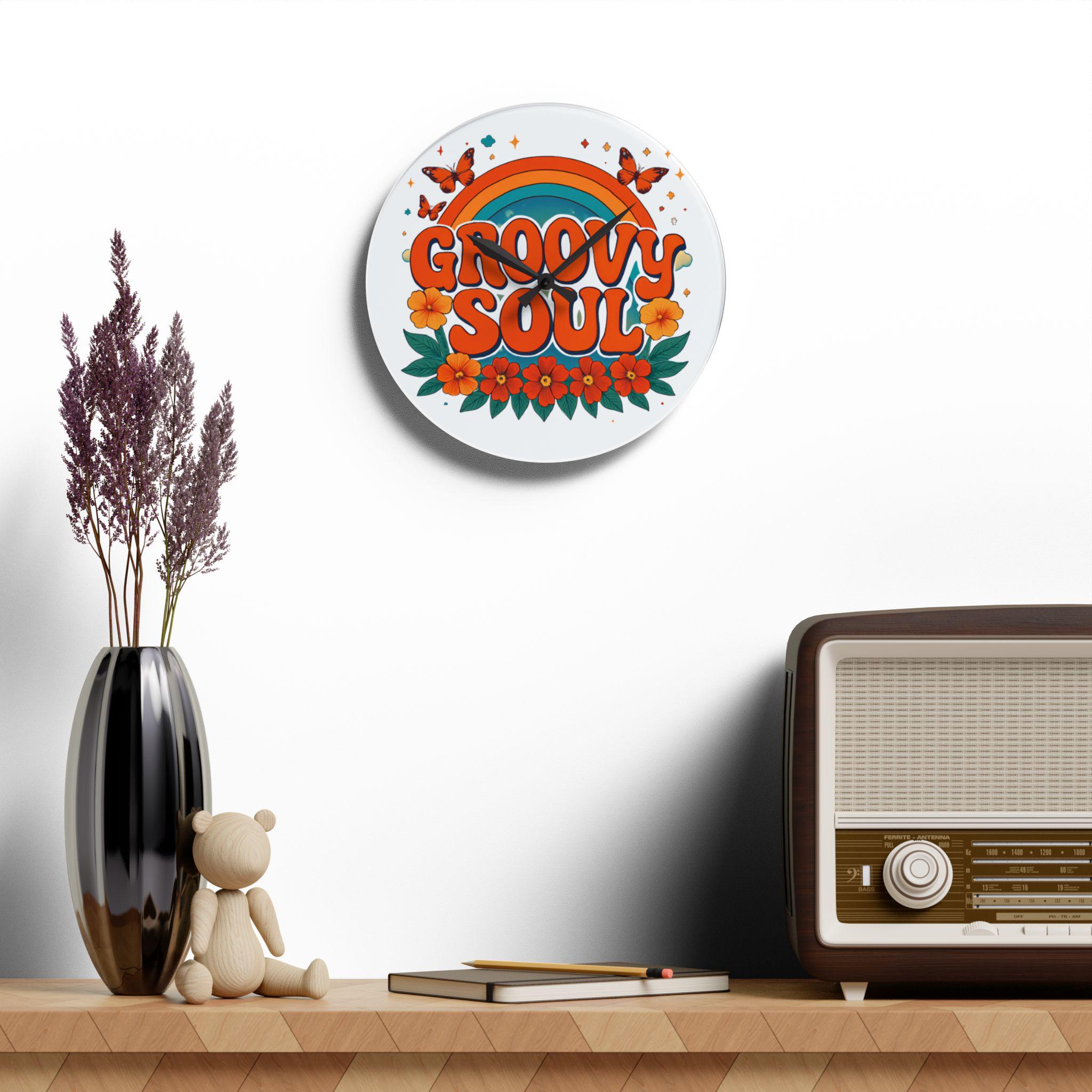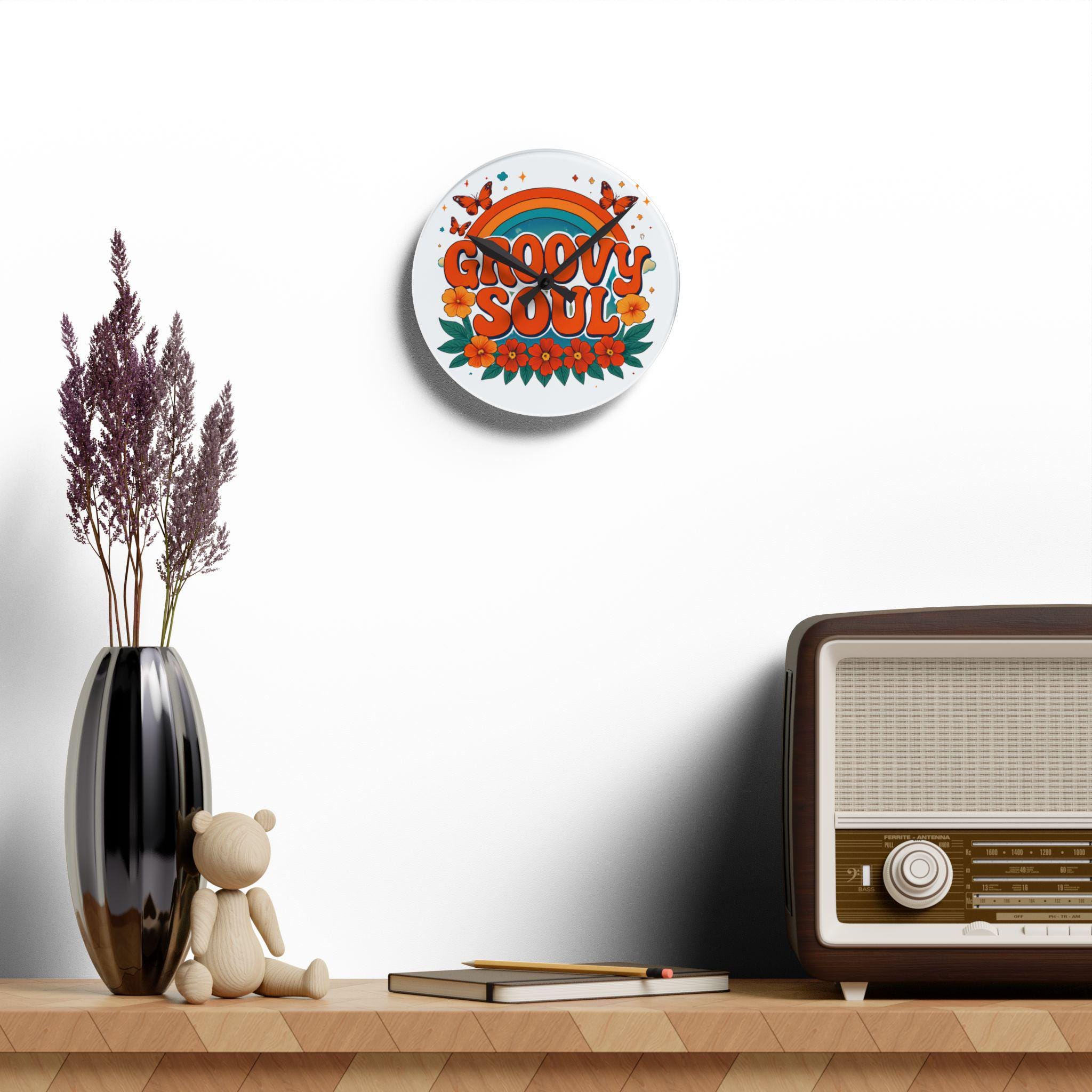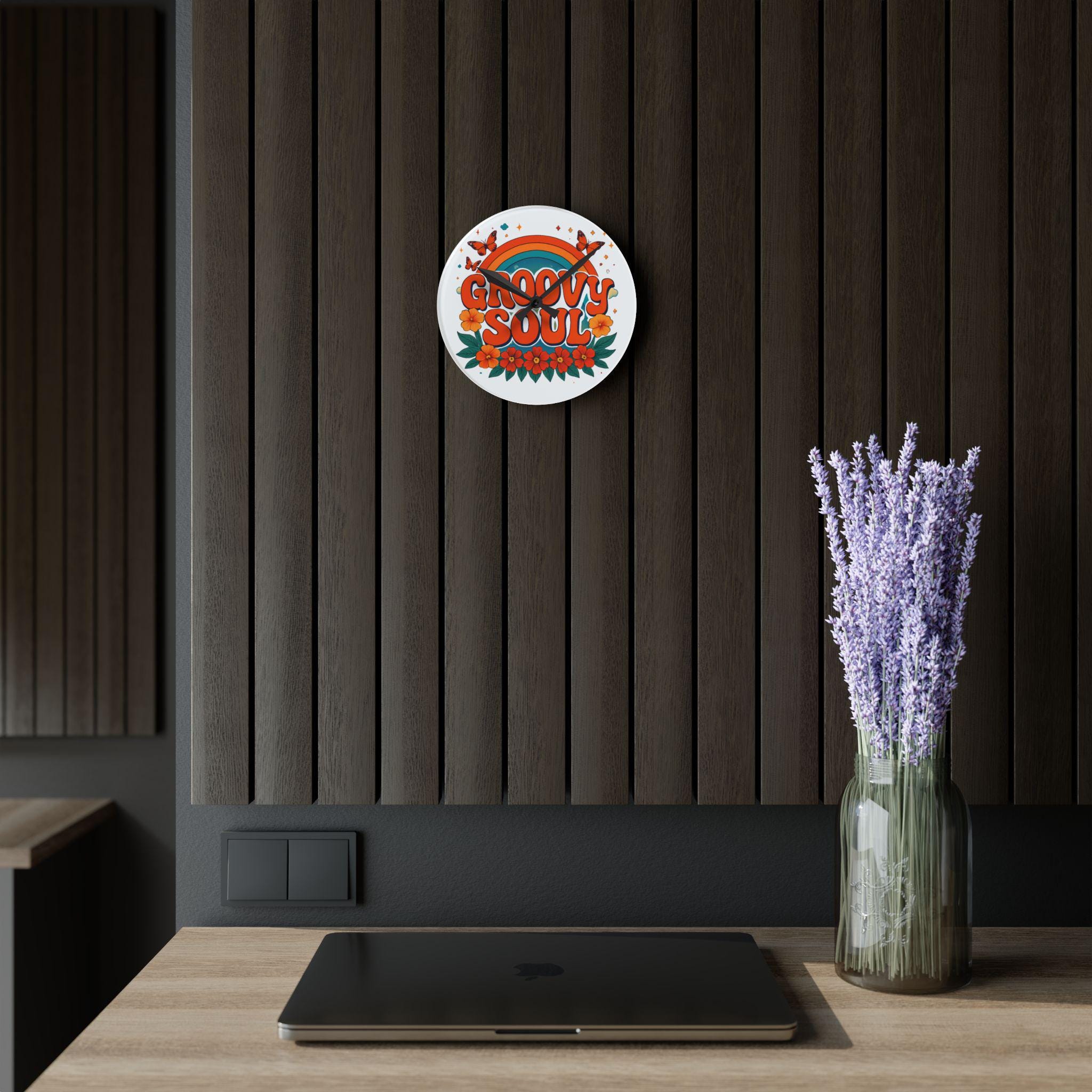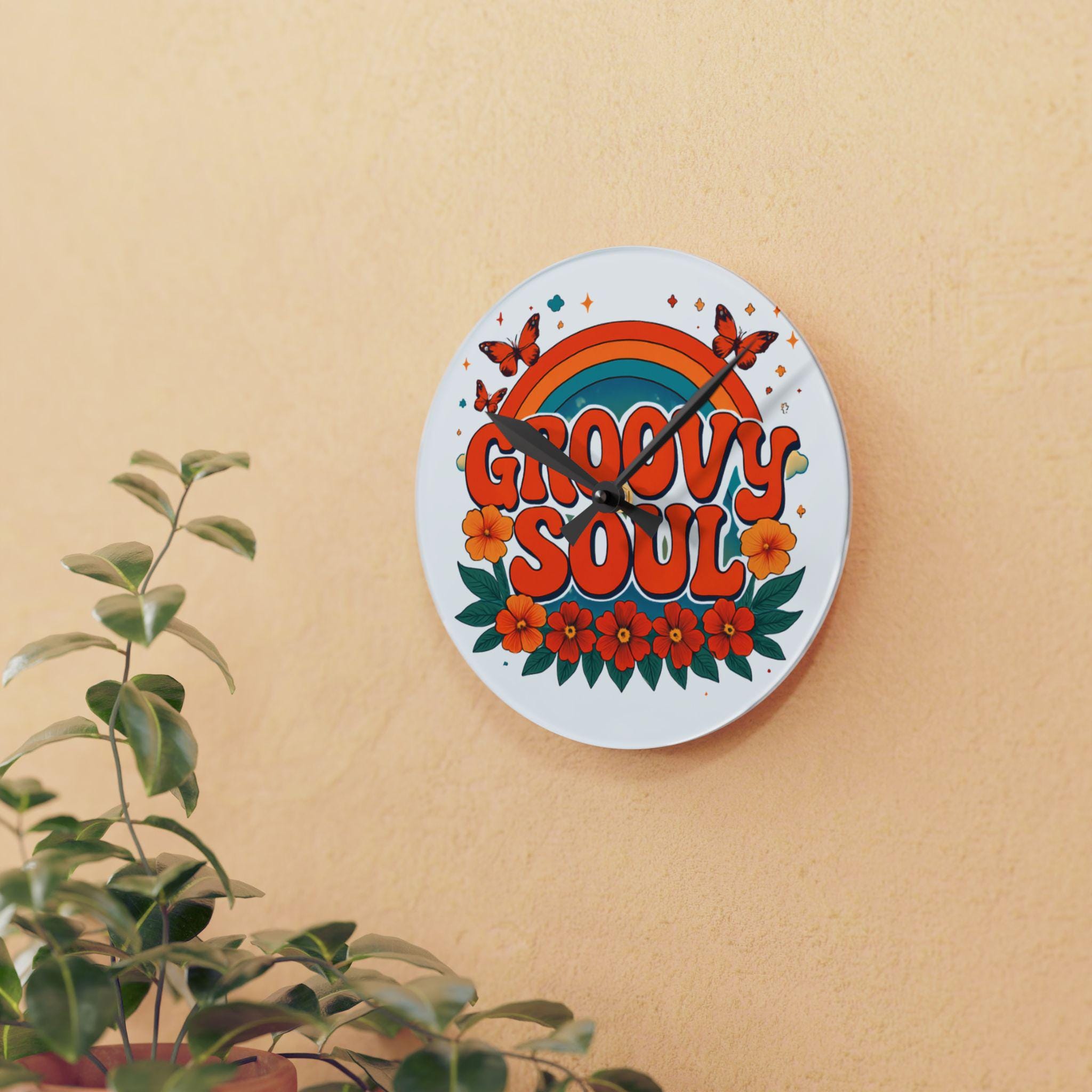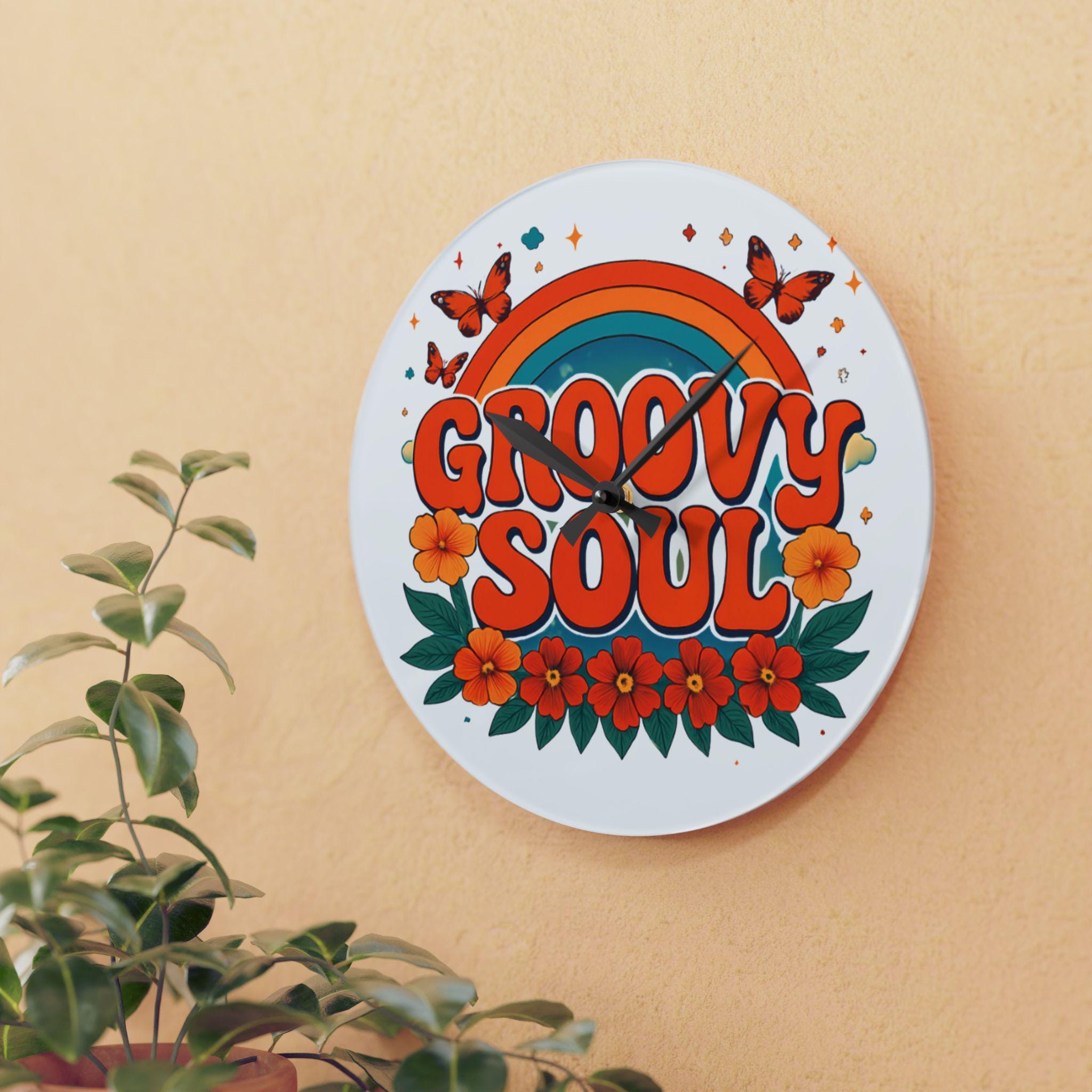 Groovy Soul acrylic wall clock | retro rainbow, 70s floral butterfly design