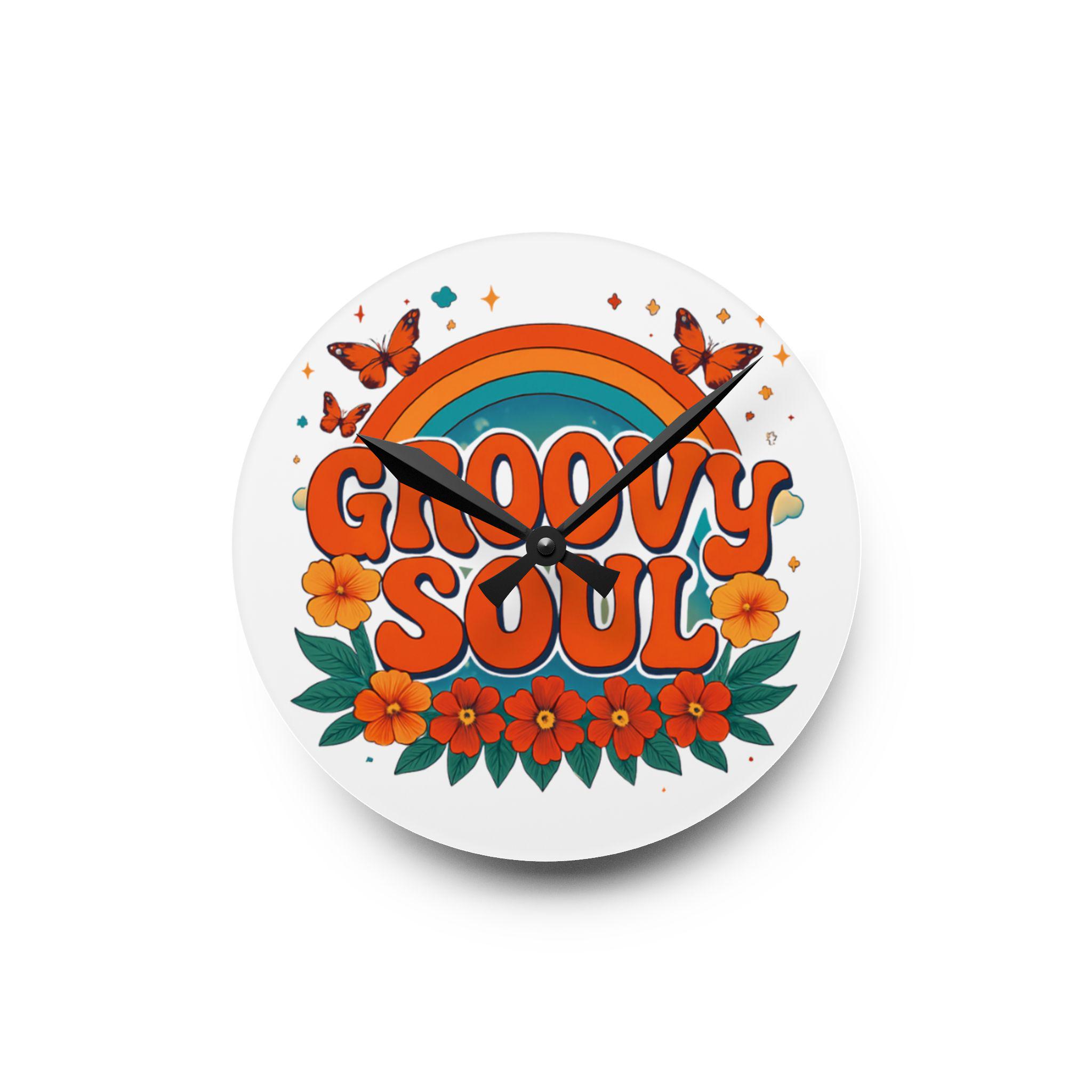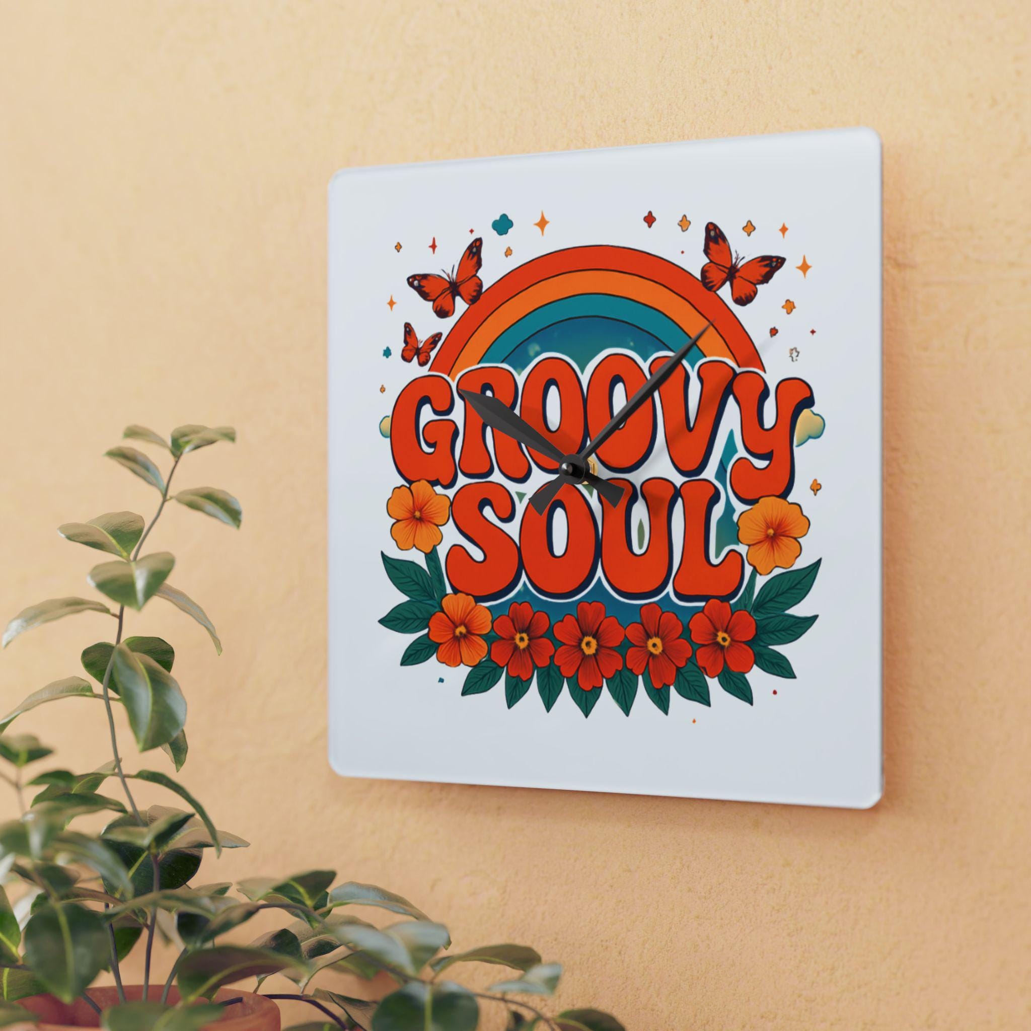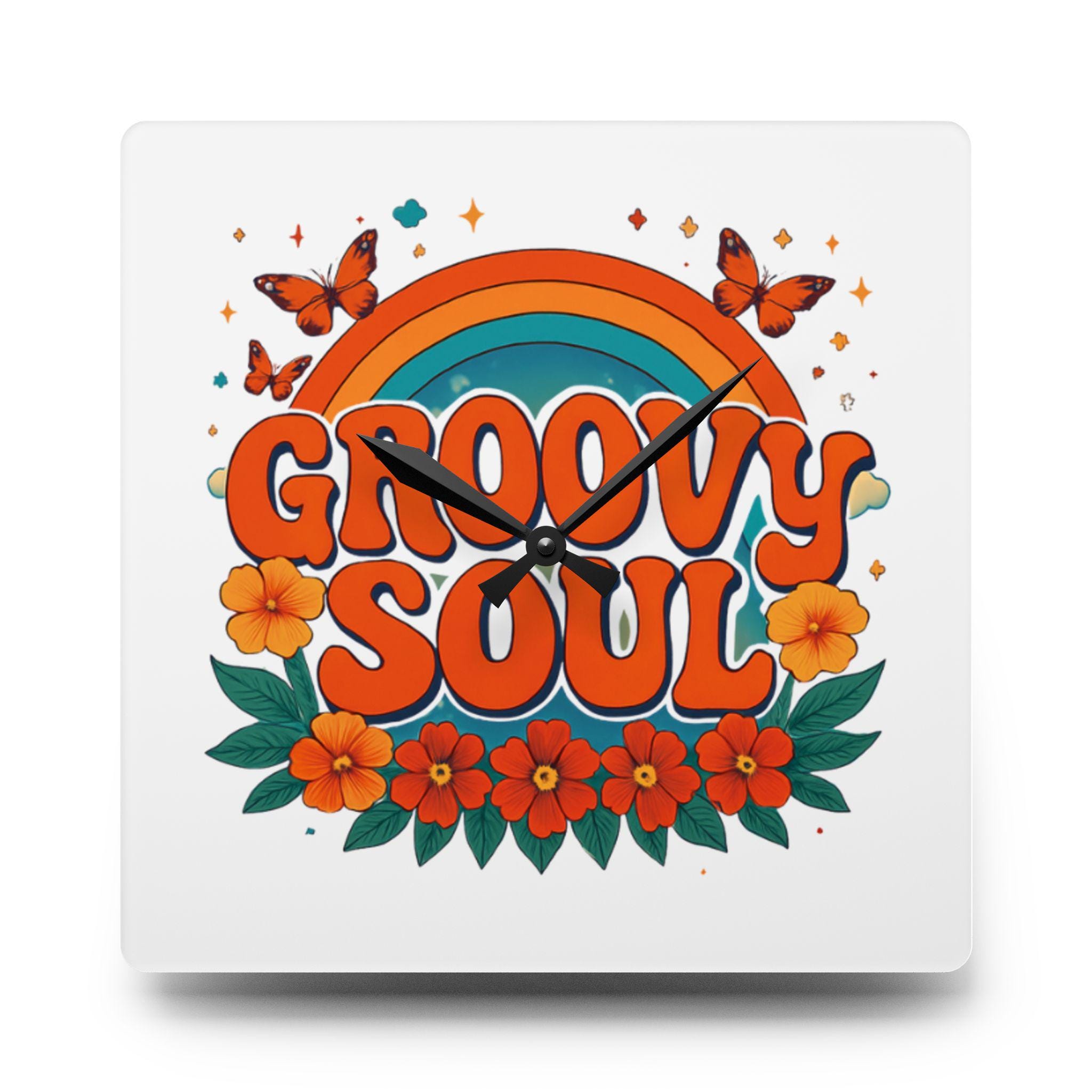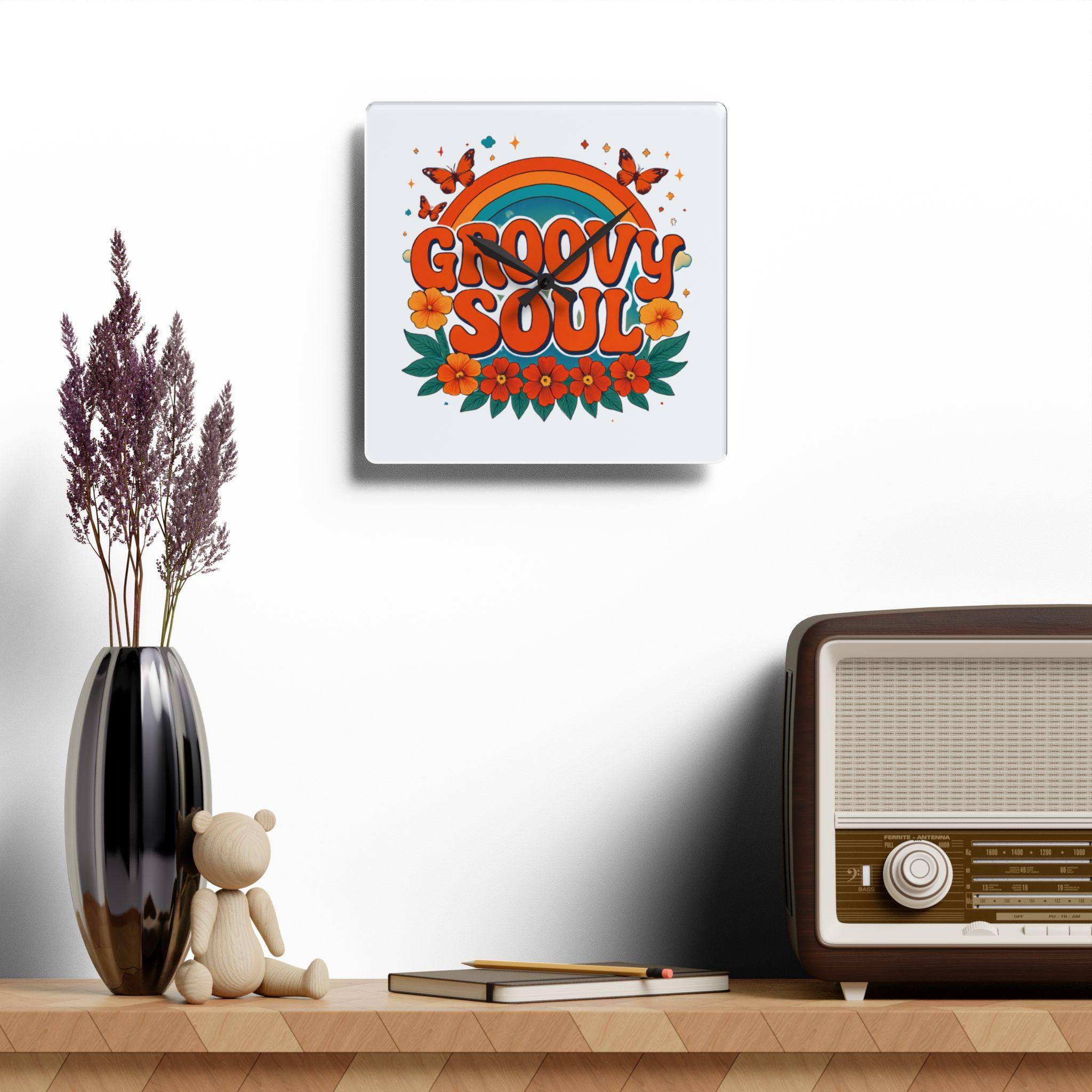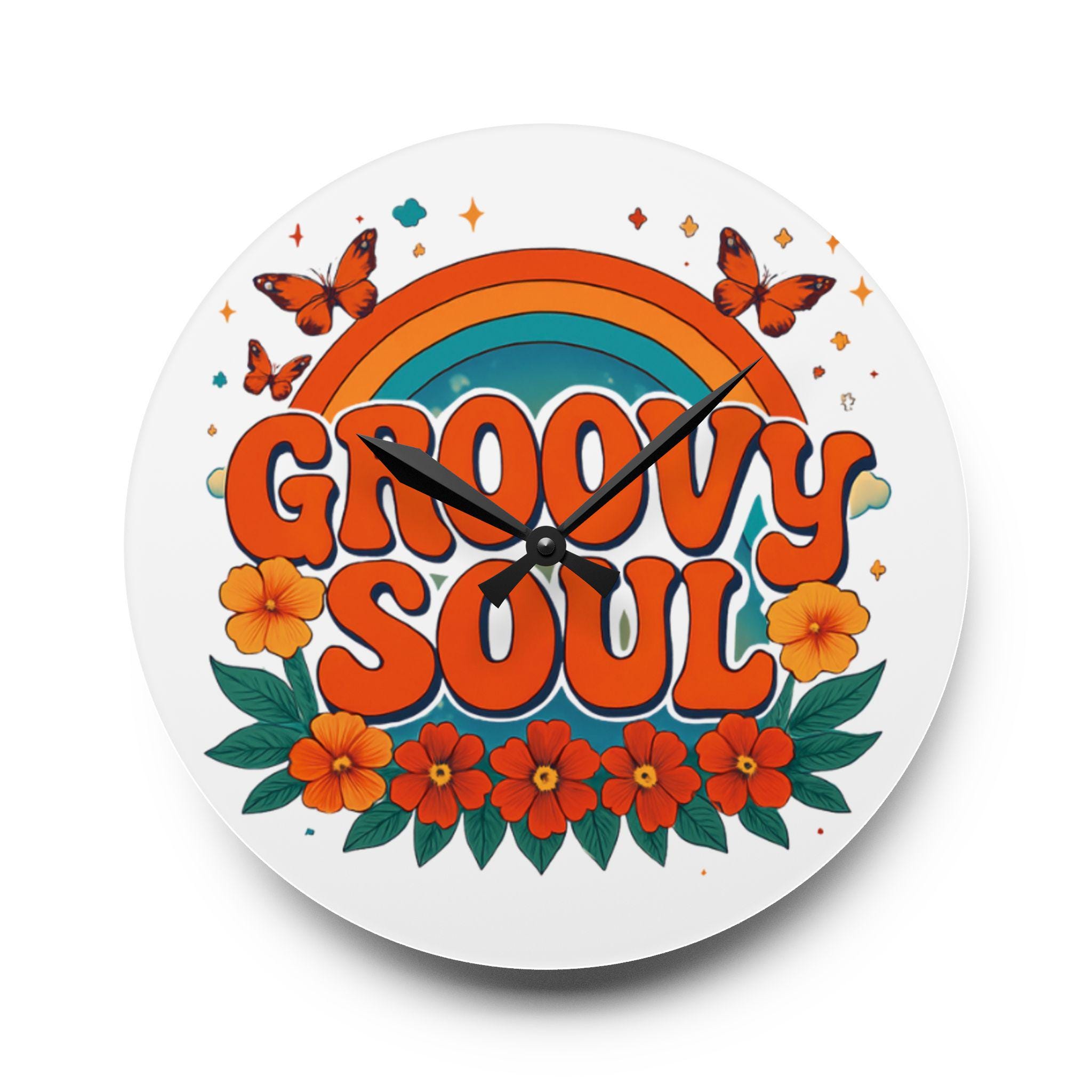 Groovy Soul acrylic wall clock | retro rainbow, 70s floral butterfly design