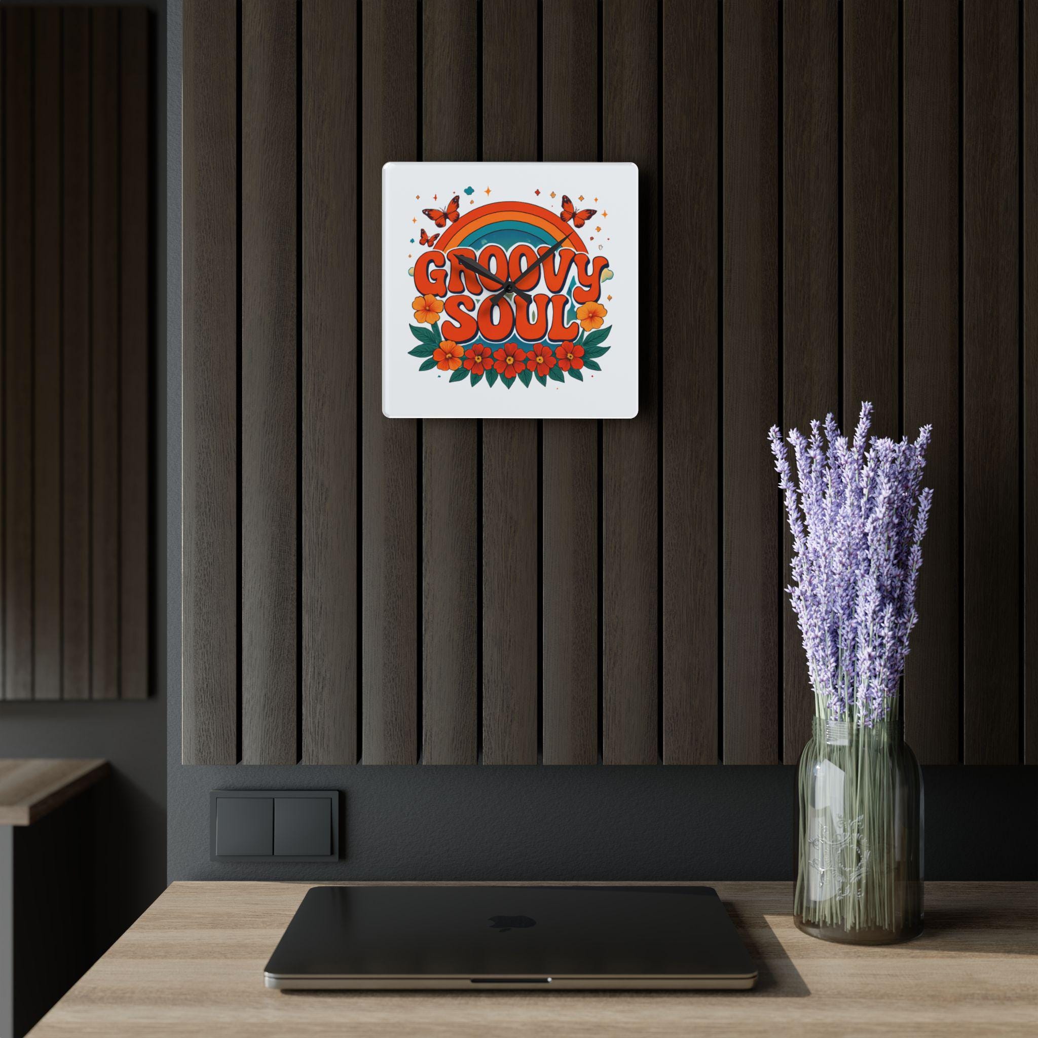 Bring a sunny, retro vibe to any wall with this acrylic wall clock. Bright, crisp printing brings the “Groovy Soul” artwork to life—rainbow arches, fluttering butterflies, and warm blooms that feel like a sunlit afternoon. Lightweight yet durable, the clear acrylic face keeps colors vibrant while the built-in hanging slot makes installation quick. Choose round or square, and pick the size that fits your space. It runs on a single AA battery, so it quietly keeps time while adding personality to a studio, entryway, or cozy reading nook.