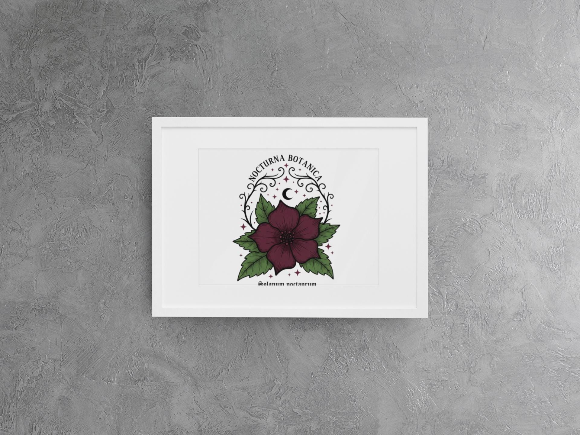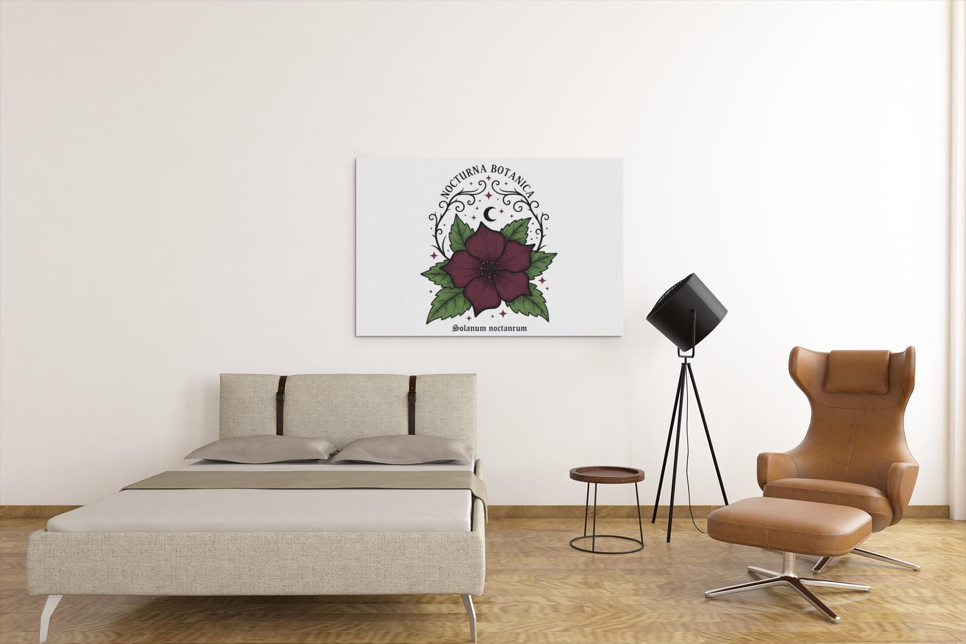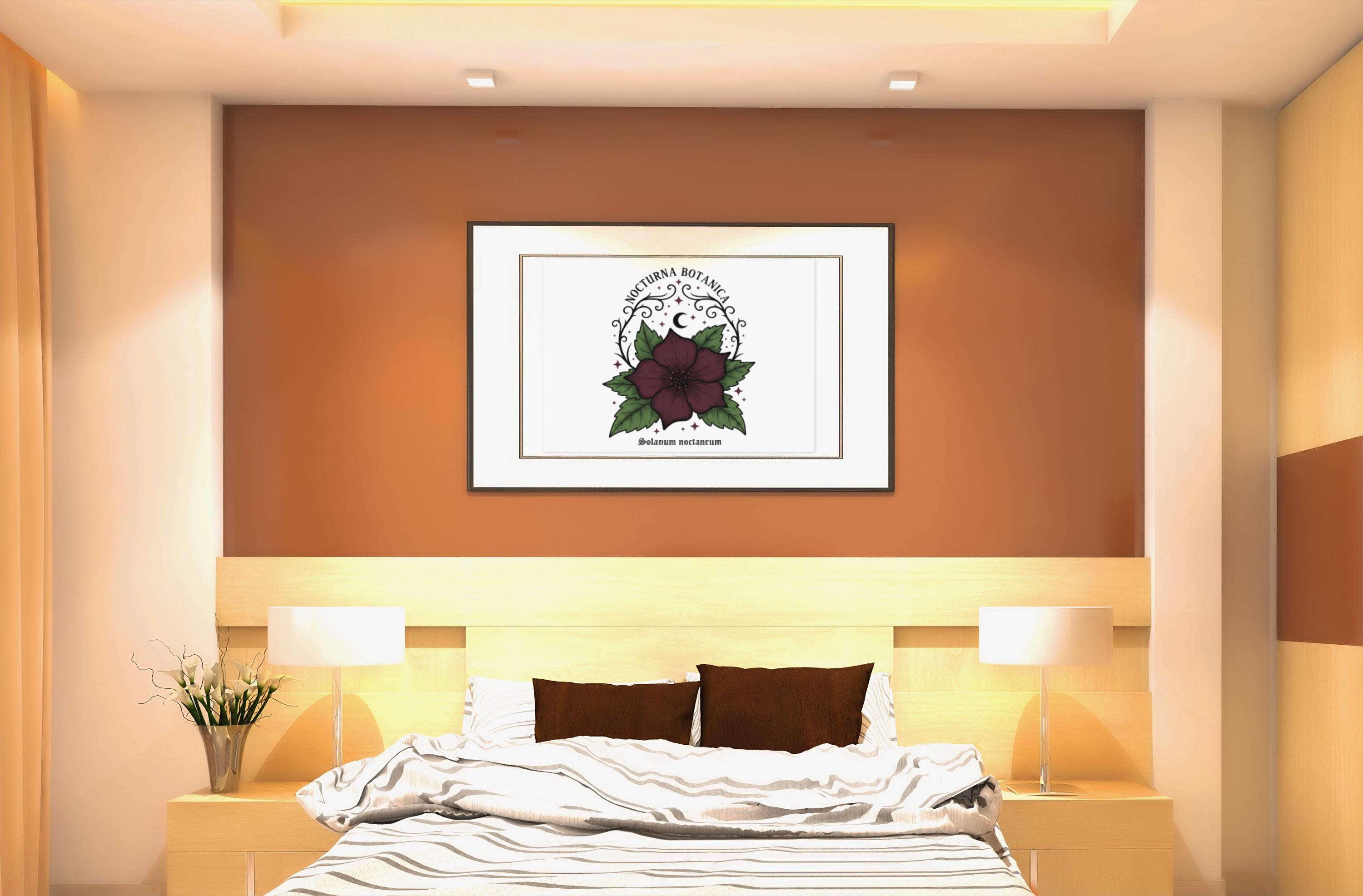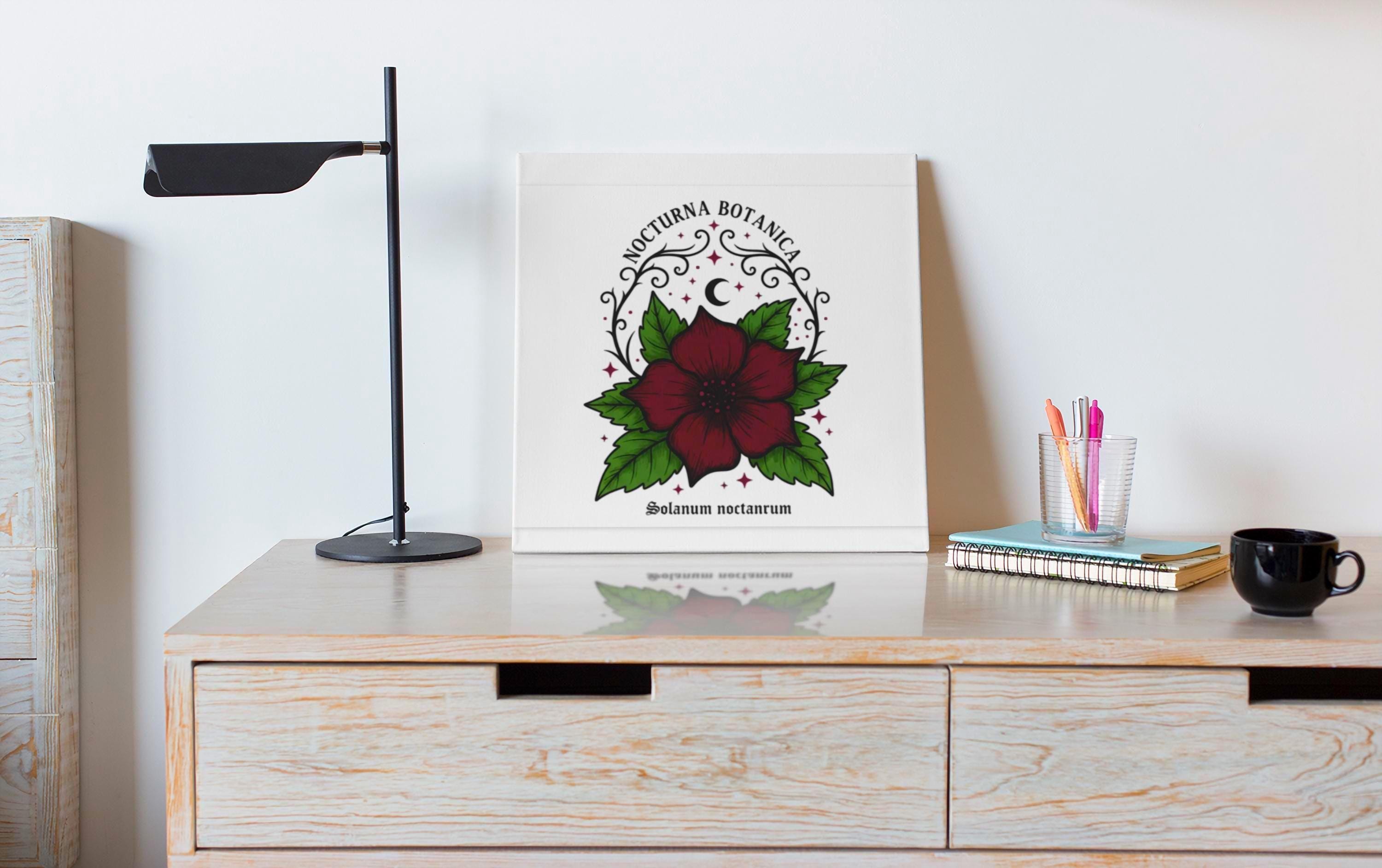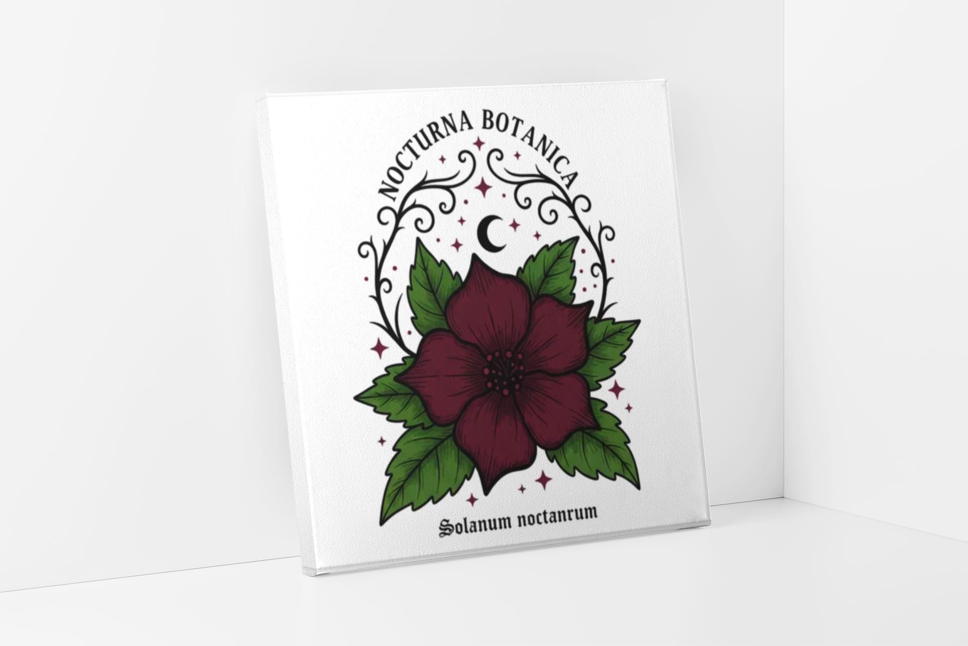 Nocturna Botanica: a moody botanical canvas print featuring a deep burgundy night-blooming flower framed by dark green leaves and delicate arcane flourishes. The composition pairs high-contrast gothic floral imagery with minimalist negative space, echoing dark-academia and witchy-garden aesthetics for a quietly dramatic wall statement. Works with alt and vintage-inspired interiors as a focal study piece or layered among other dark botanical prints to build a curated, nocturnal gallery.