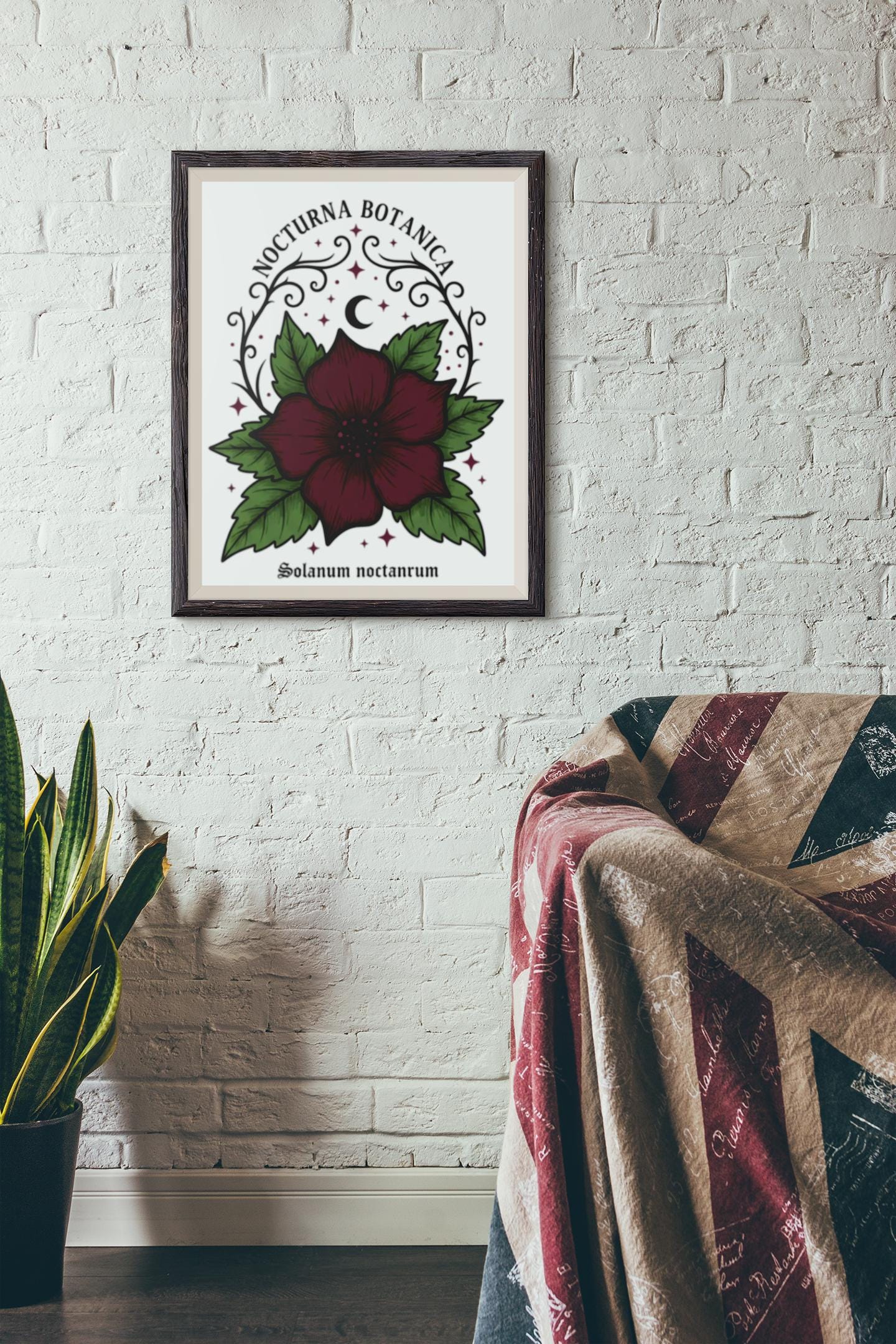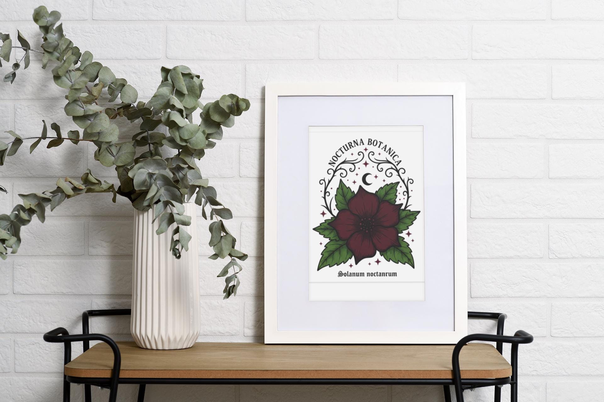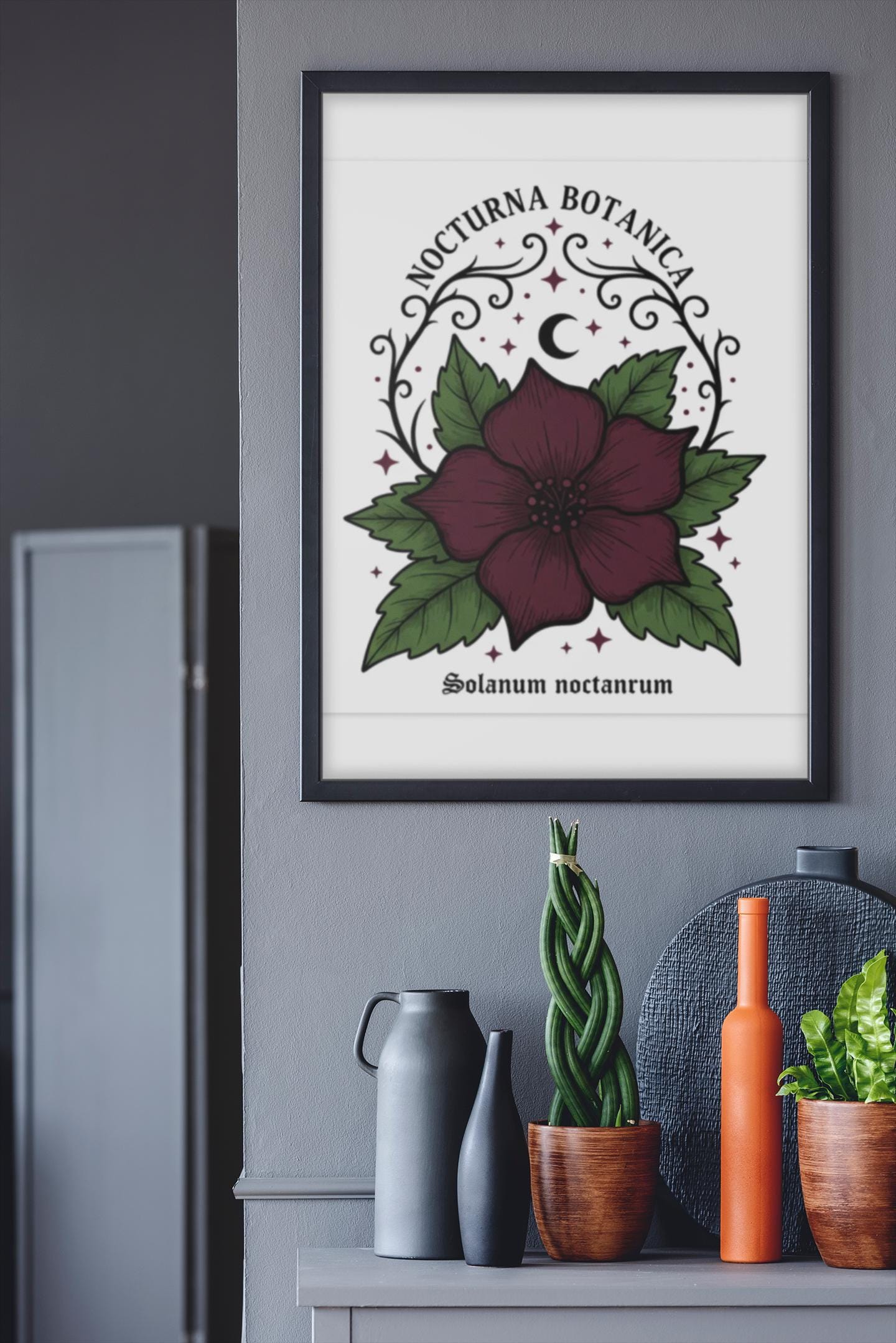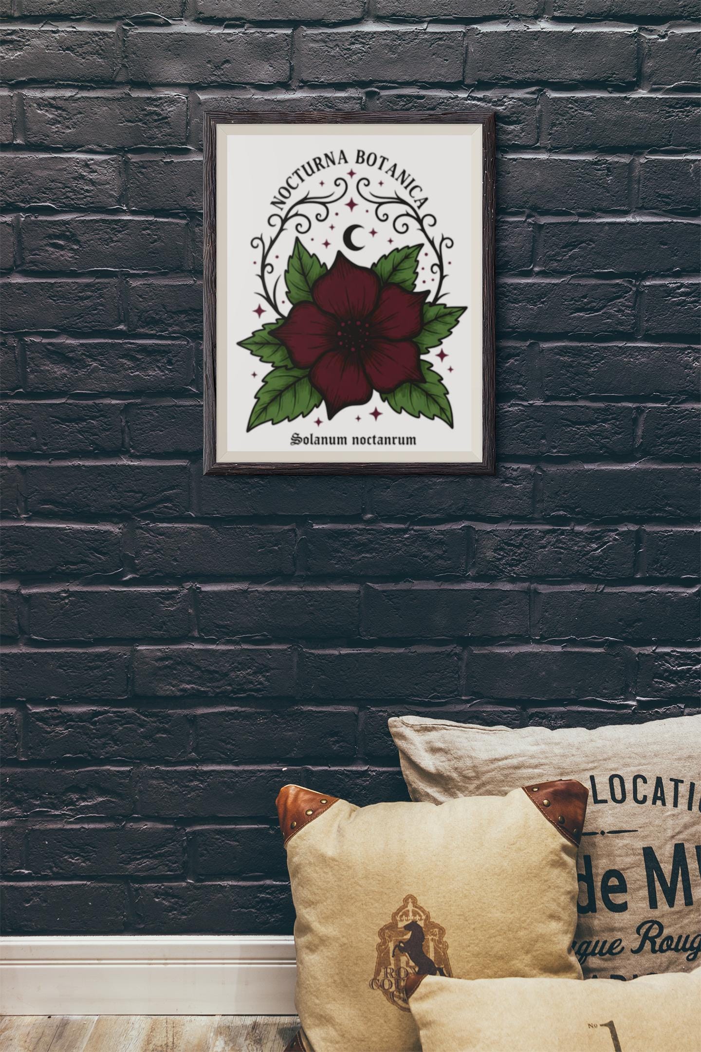 Nocturna Botanica: a moody botanical canvas print featuring a deep burgundy night-blooming flower framed by dark green leaves and delicate arcane flourishes. The composition pairs high-contrast gothic floral imagery with minimalist negative space, echoing dark-academia and witchy-garden aesthetics for a quietly dramatic wall statement. Works with alt and vintage-inspired interiors as a focal study piece or layered among other dark botanical prints to build a curated, nocturnal gallery.