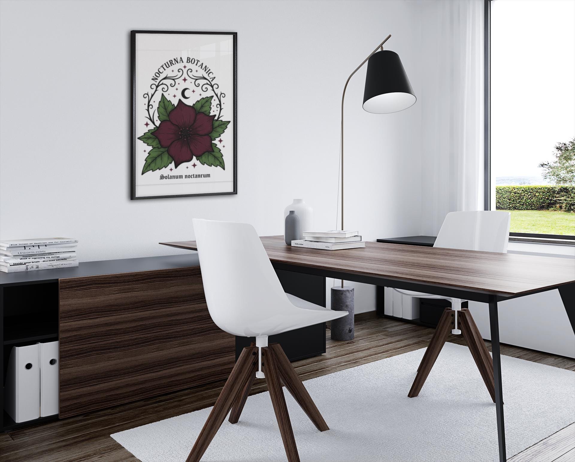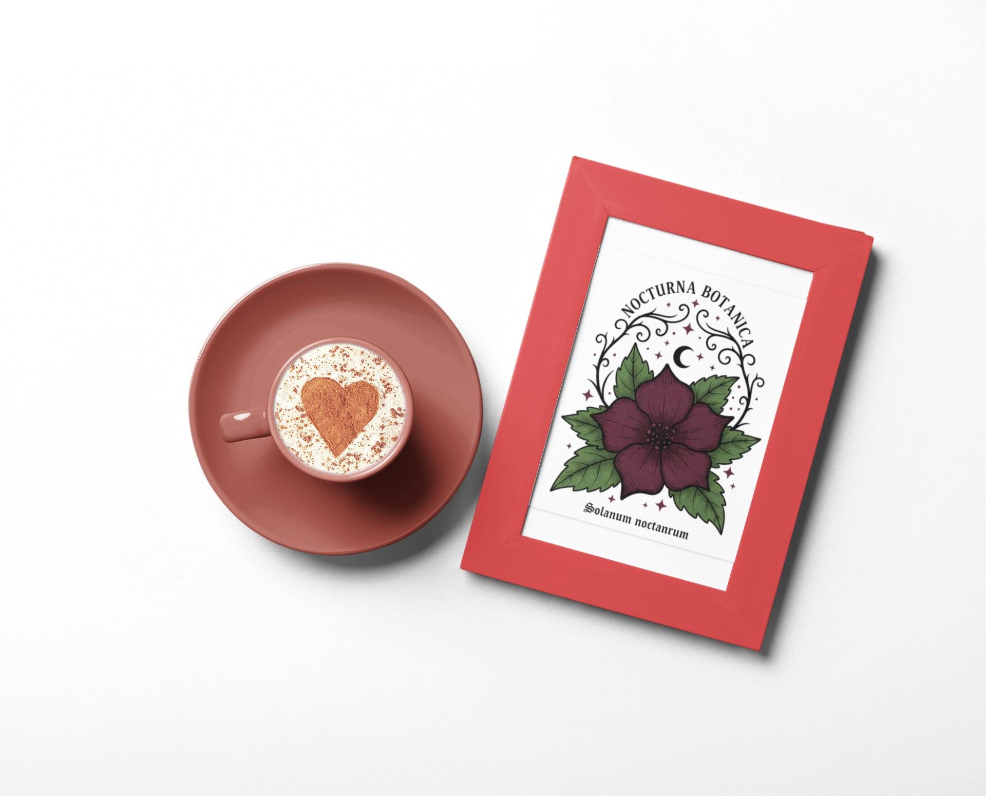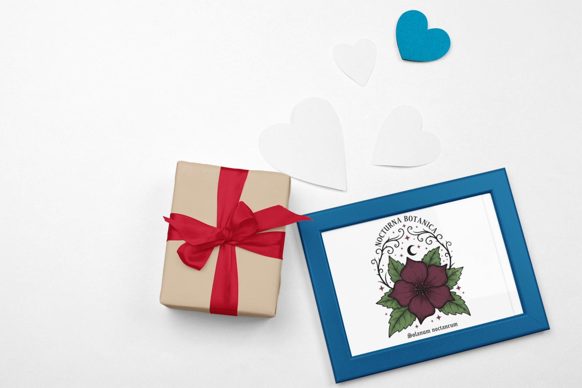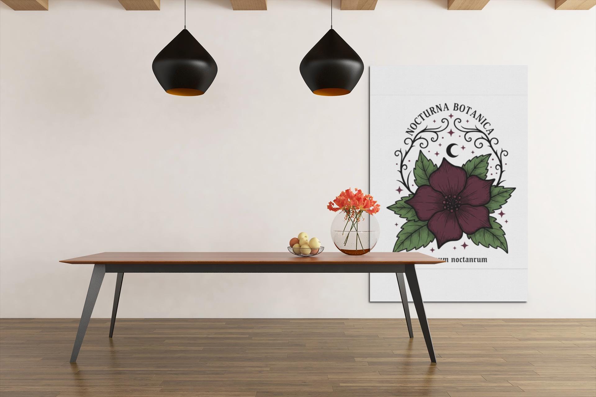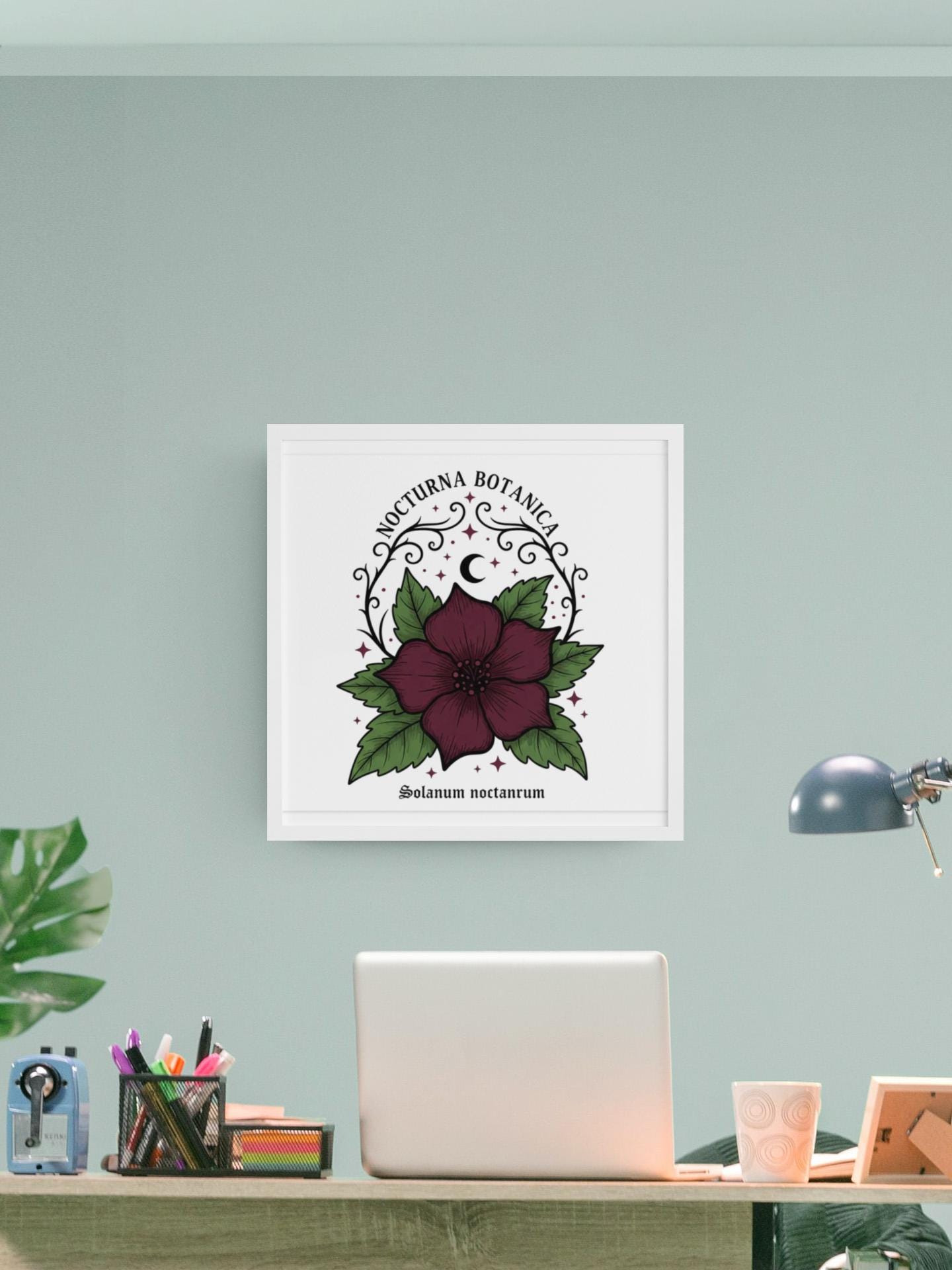 Nocturna Botanica: a moody botanical canvas print featuring a deep burgundy night-blooming flower framed by dark green leaves and delicate arcane flourishes. The composition pairs high-contrast gothic floral imagery with minimalist negative space, echoing dark-academia and witchy-garden aesthetics for a quietly dramatic wall statement. Works with alt and vintage-inspired interiors as a focal study piece or layered among other dark botanical prints to build a curated, nocturnal gallery.